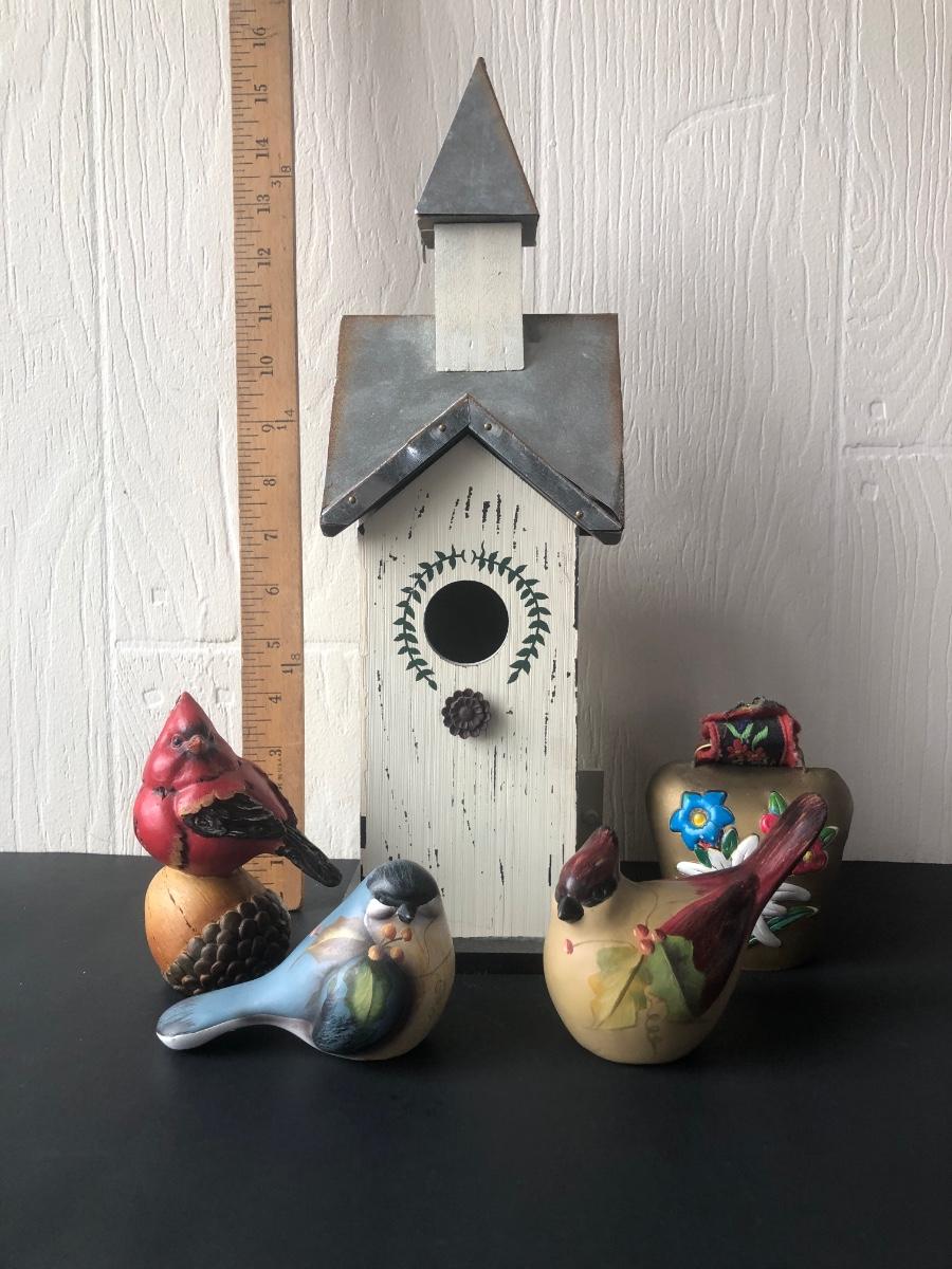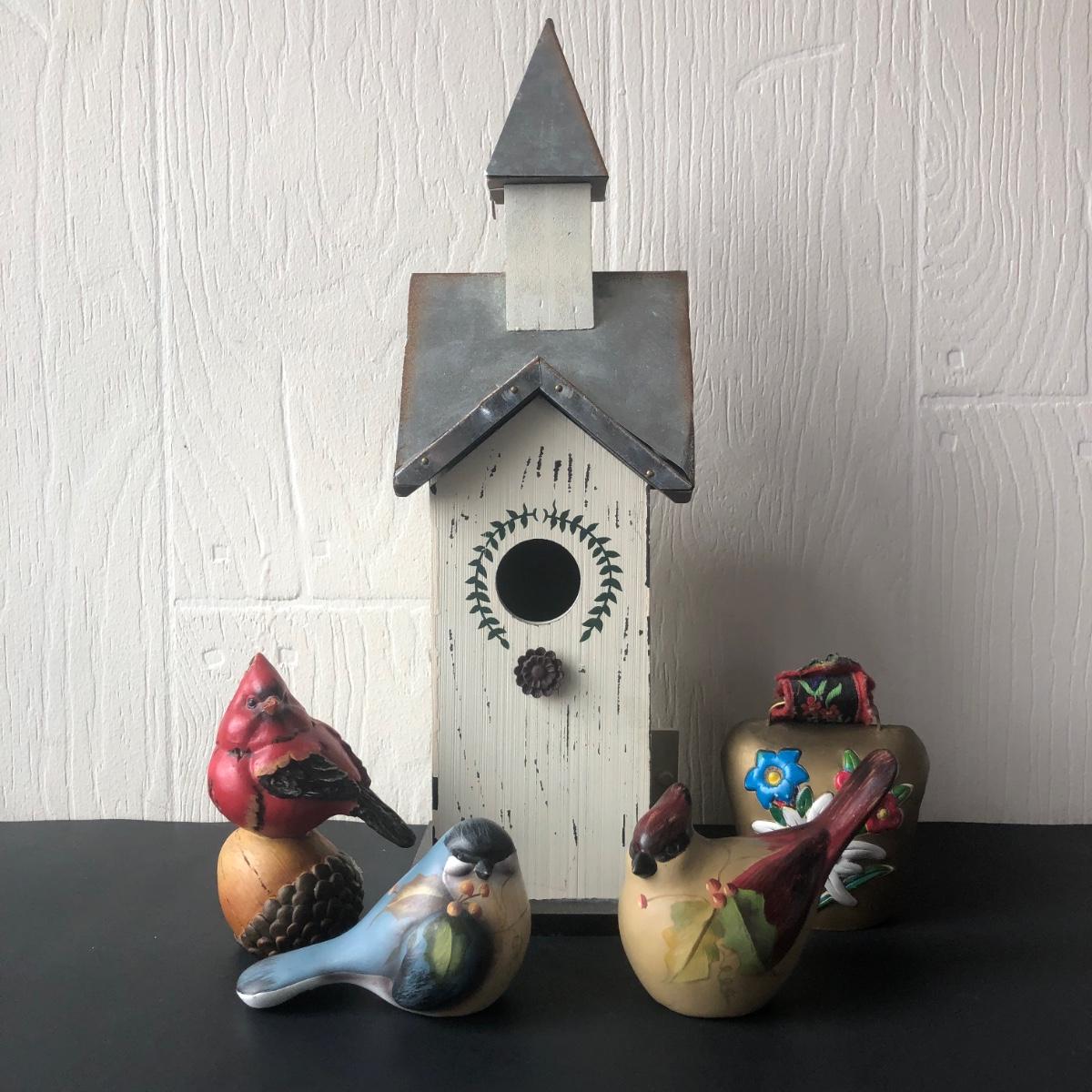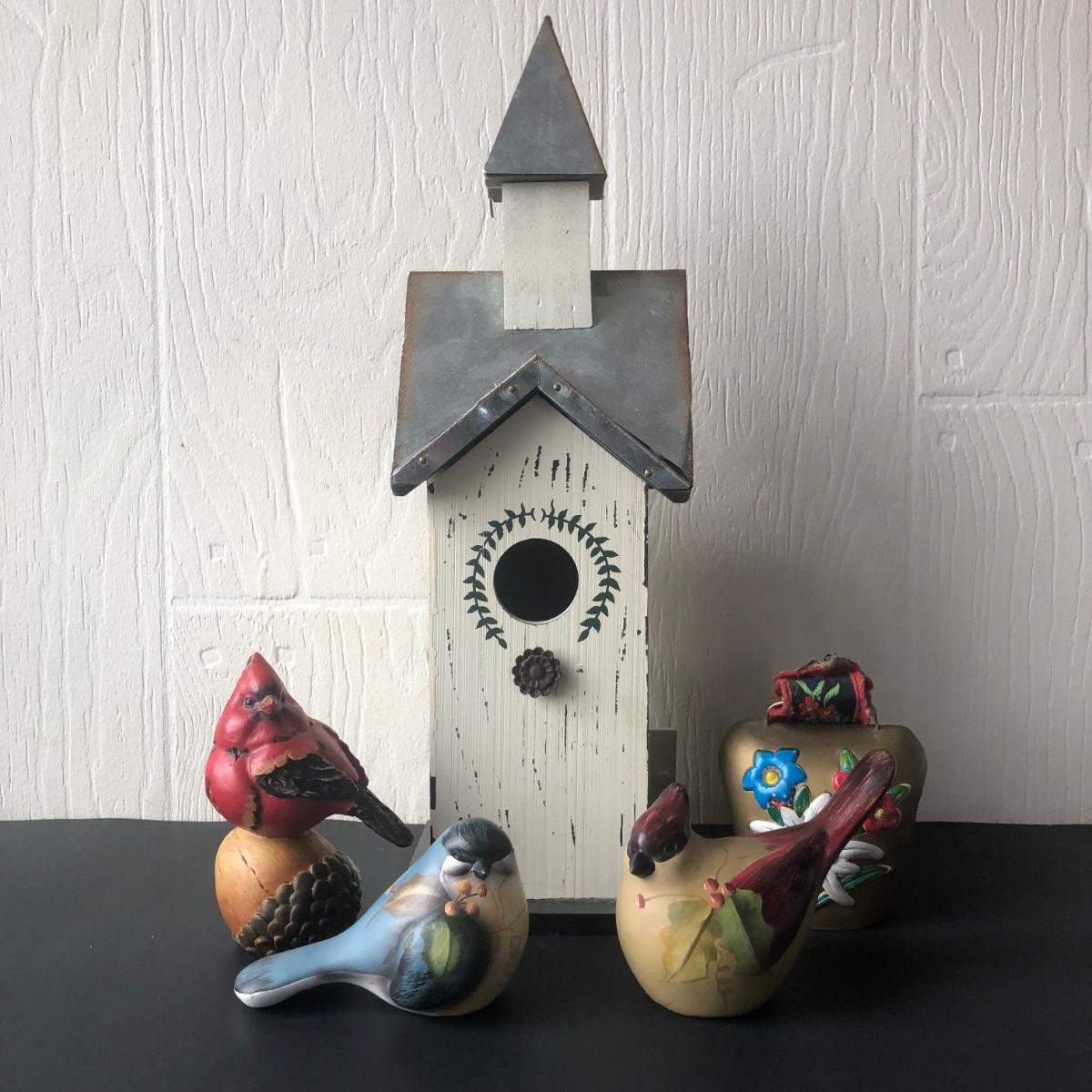 LOT 69K: Spring Shop Birdhouse, Bird Sculptures & Painted Bell