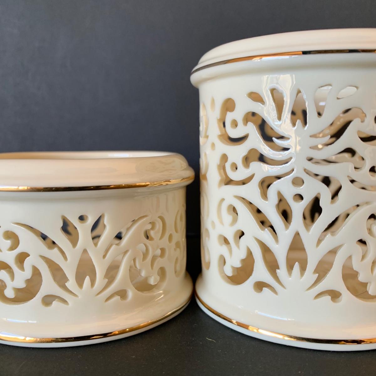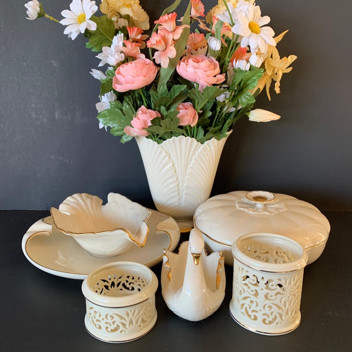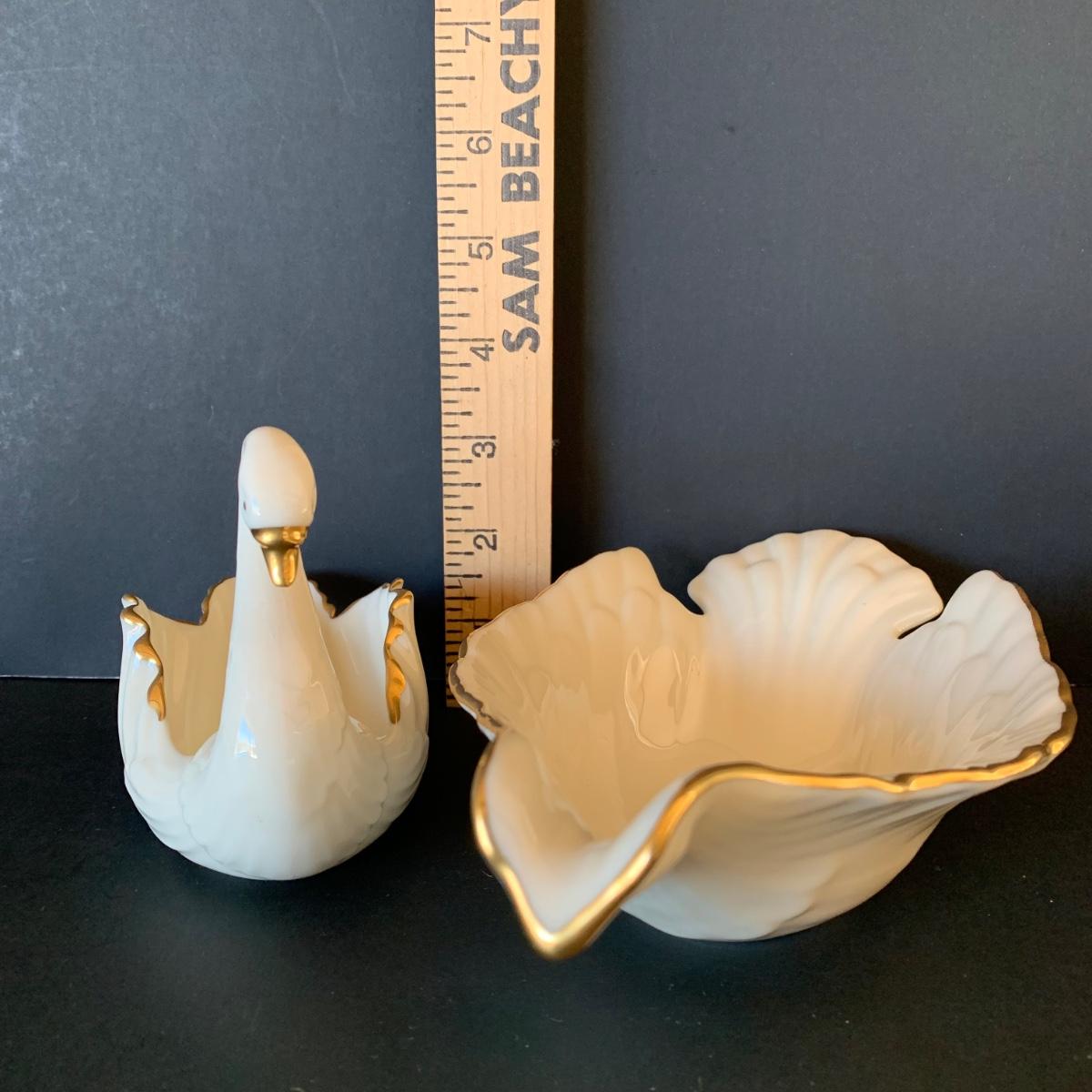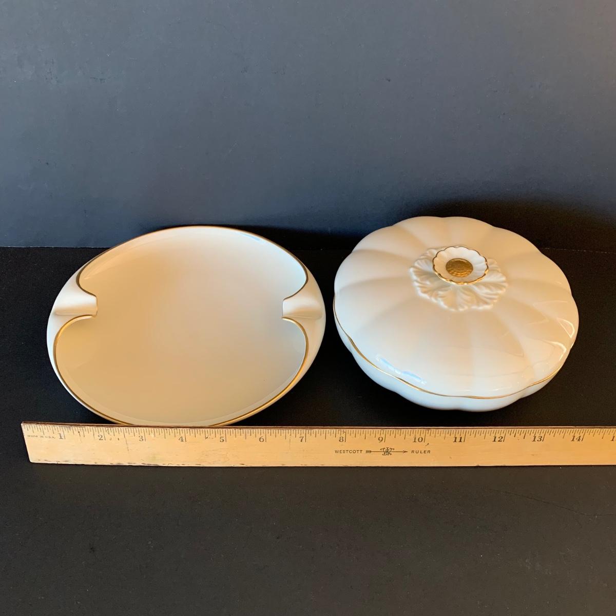 LOT 85 D: Vintage Lenox Collection W/ Gold Trim: Corinthian Collection Vase, Primrose Dish W/Lid, Mansfield Ashtray, 2 Illuminations Pierced Votives/Tea Light Holders, Dove Dish, & Swan Dish