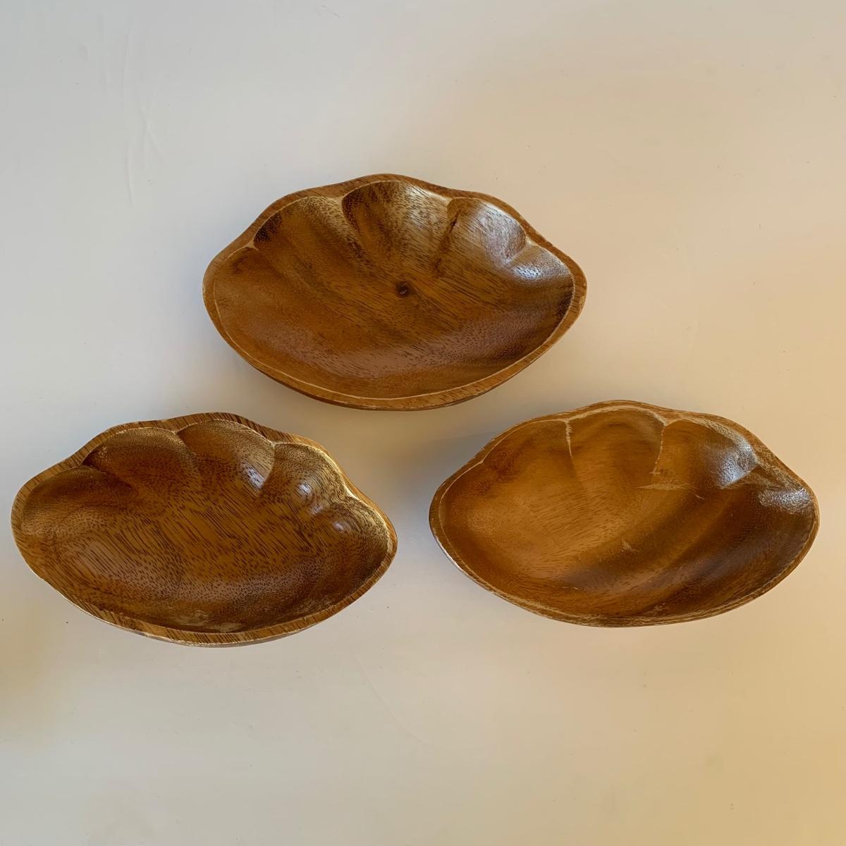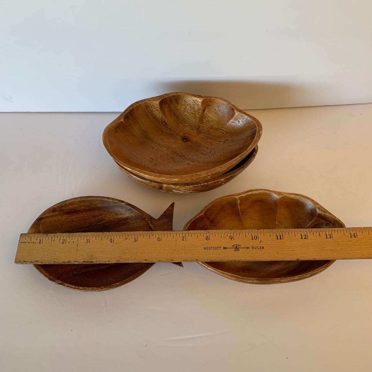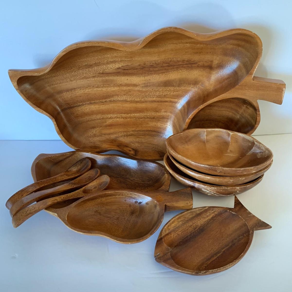 LOT 87 D: 2 Monkey Pod Wood Leaf Serving trays, 3 Monkey Pod Wood Shell Bowls, & More