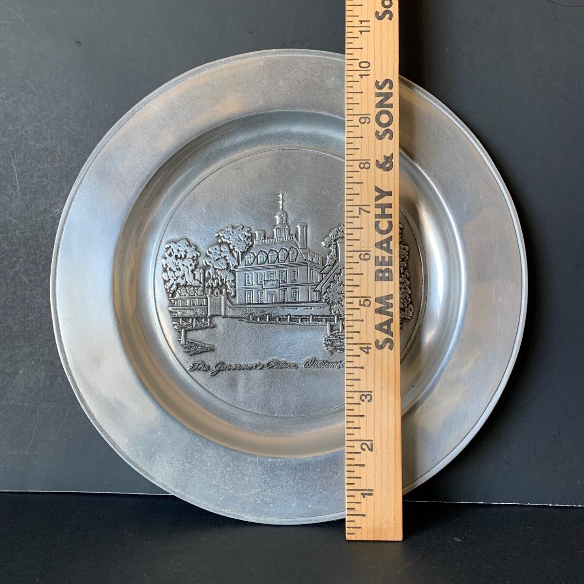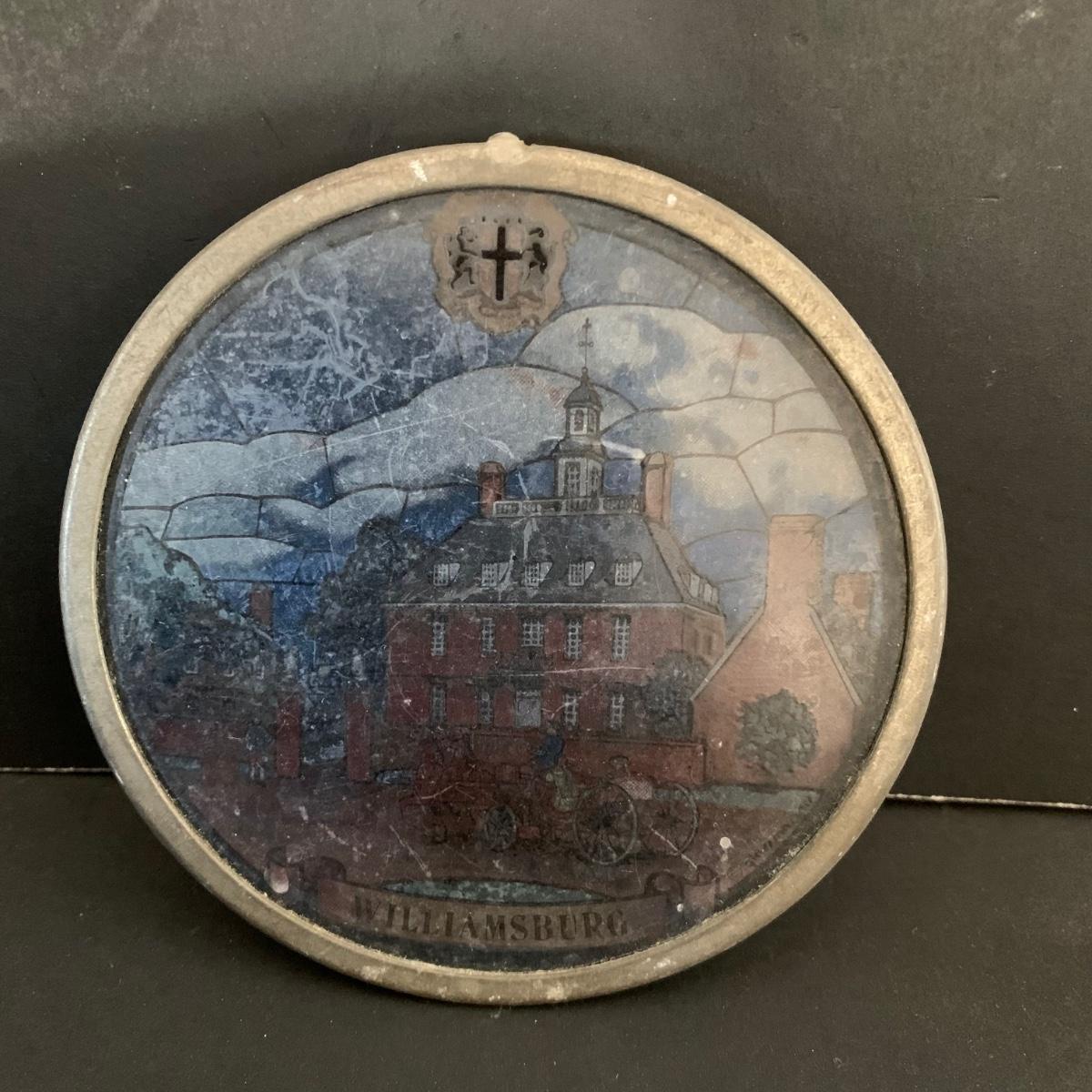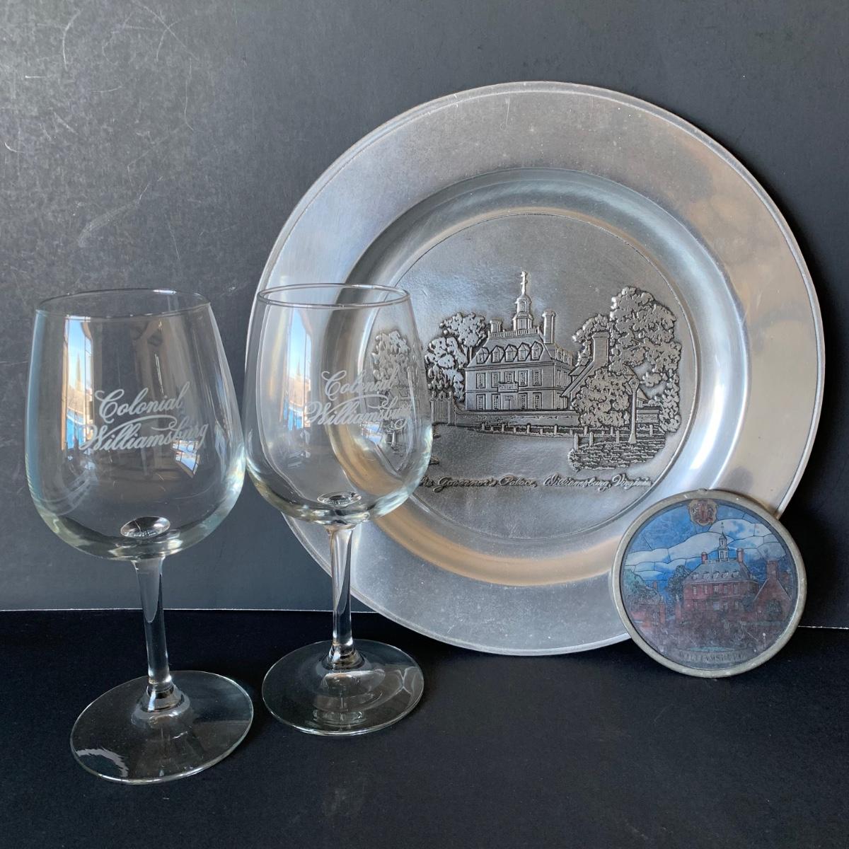 LOT 93 D: Williamsburg Governor's Palace Collection: Wilton Pewter Plate, Wine Glasses, & Stained Glass