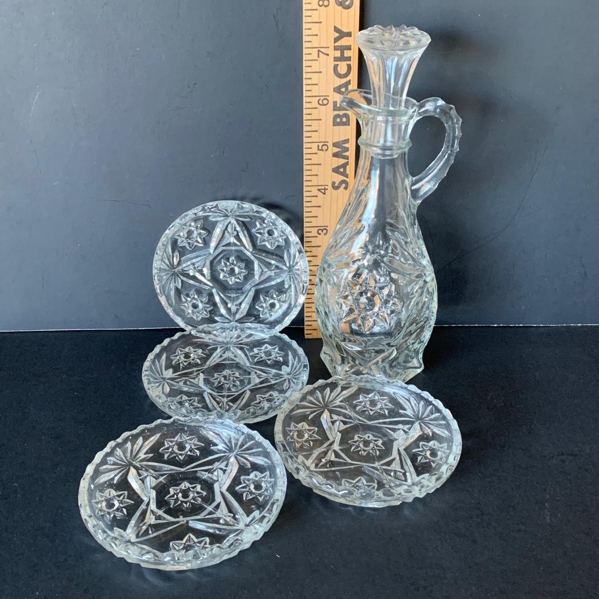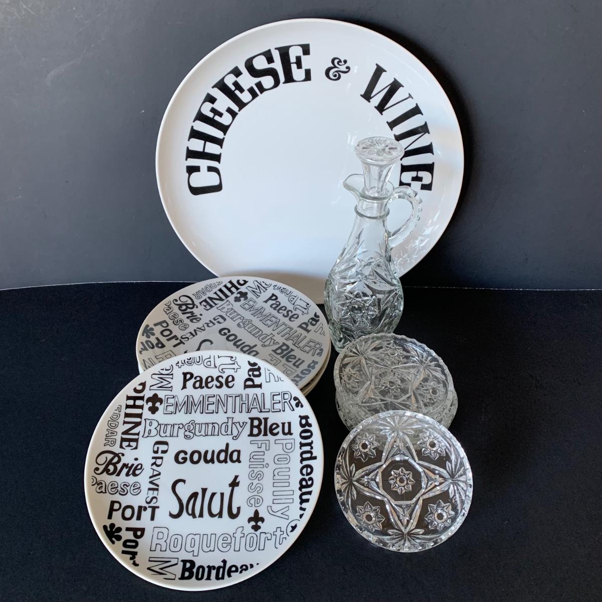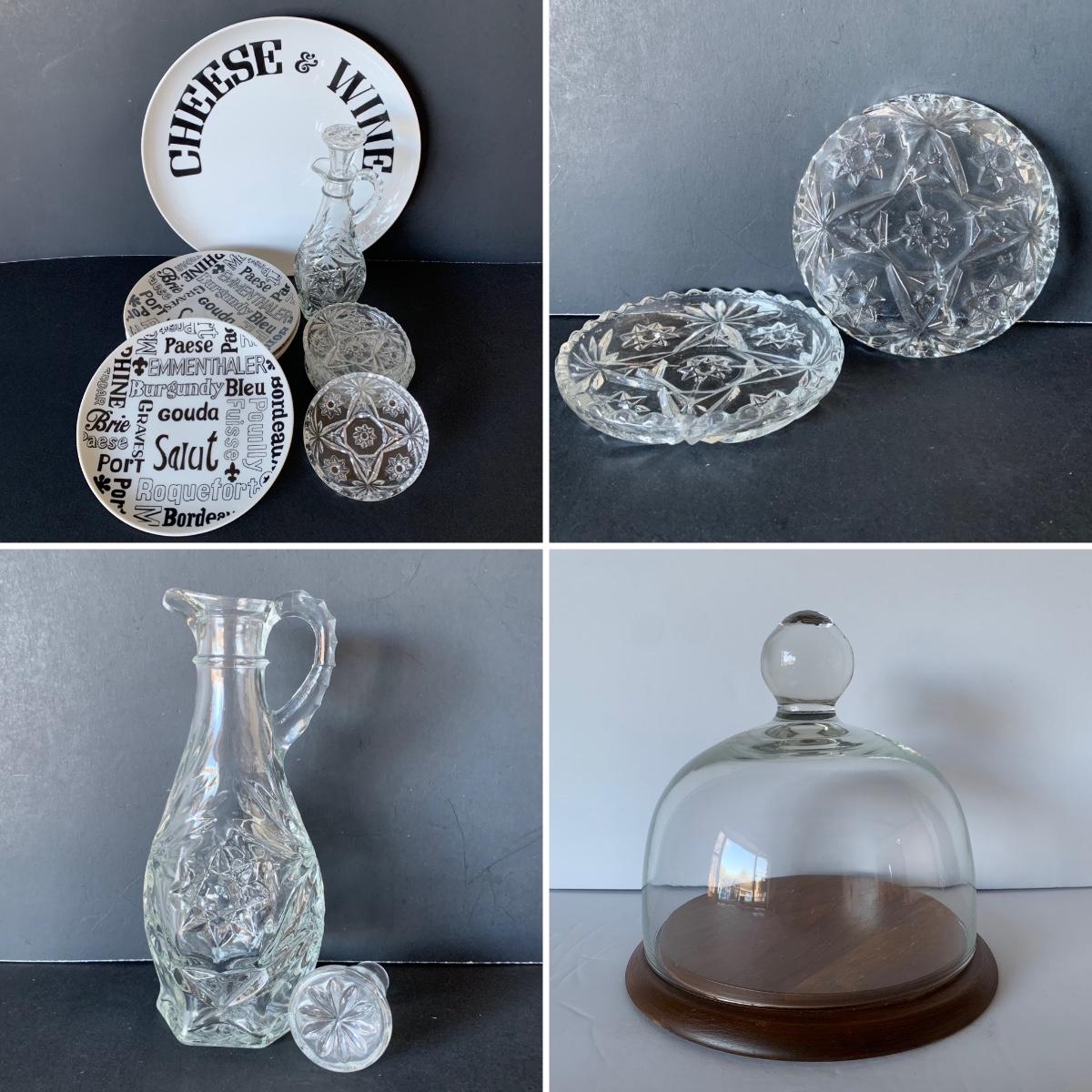 LOT 96 D: Vintage Starburst Anchor Hocking Oil & Vinegar Cruet W/ Stopper & Small Dishes, Mann Gourmet's Choice Wine & Cheese Plates, & Cheese/Pastry Cloche