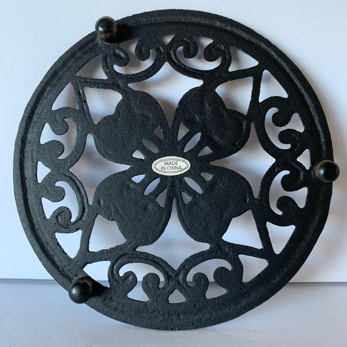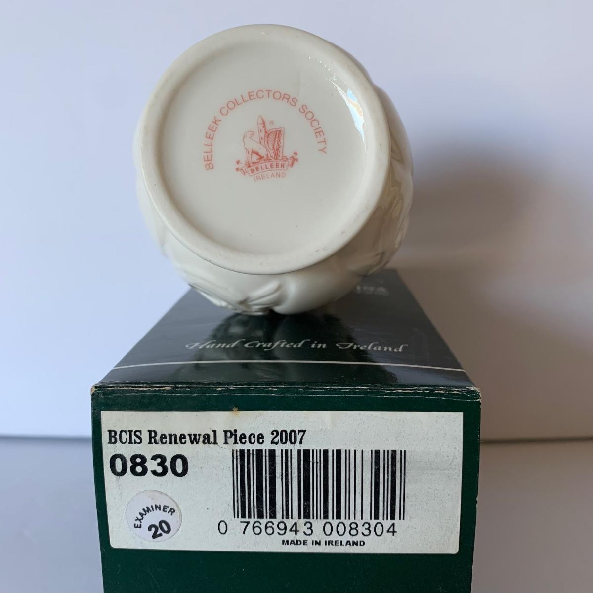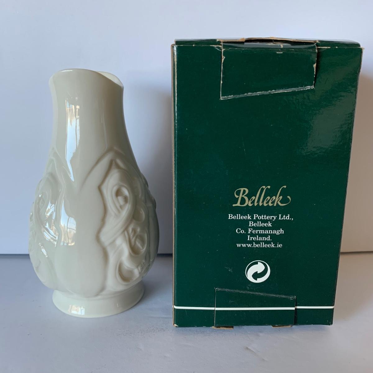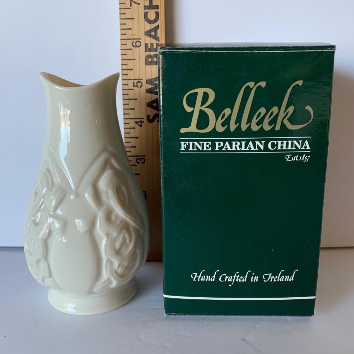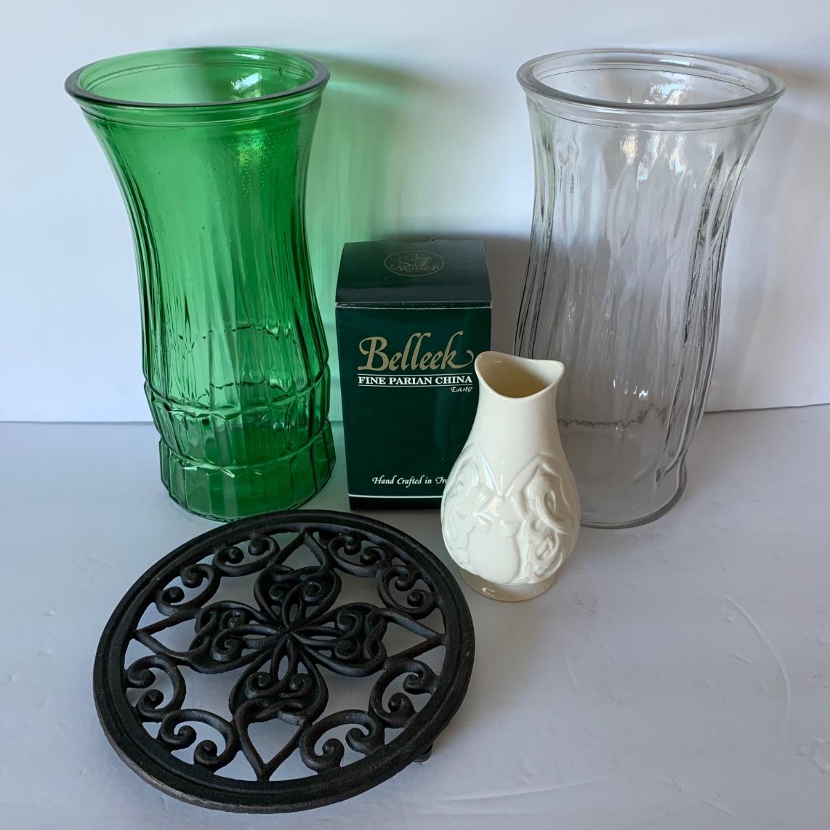 LOT 97 D: Vintage Belleek Bud Vase, 2 E.O. Brody Co. Vases, & Cast Iron Trivet