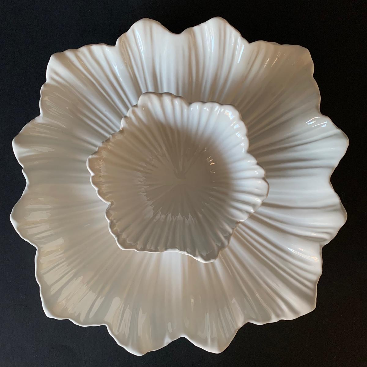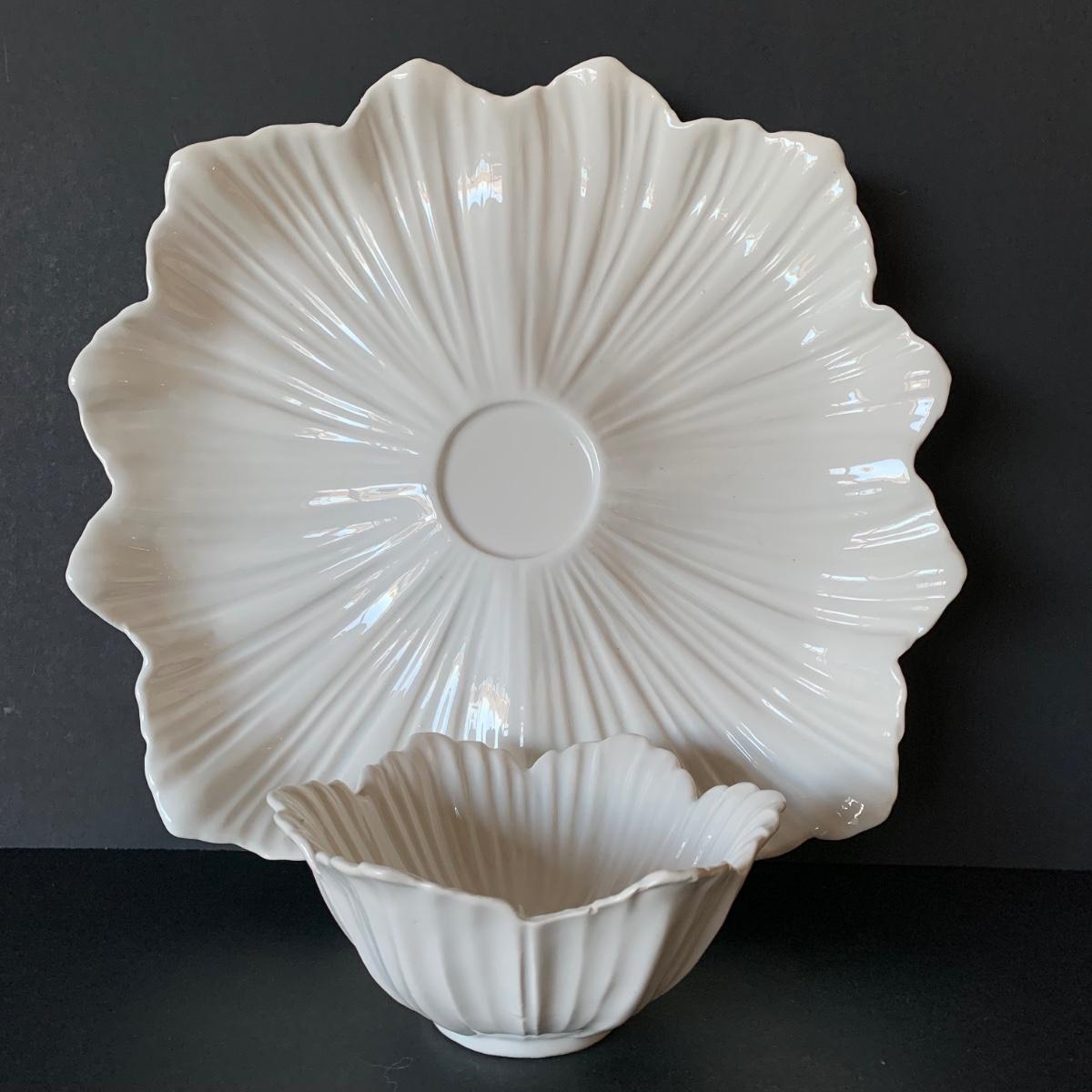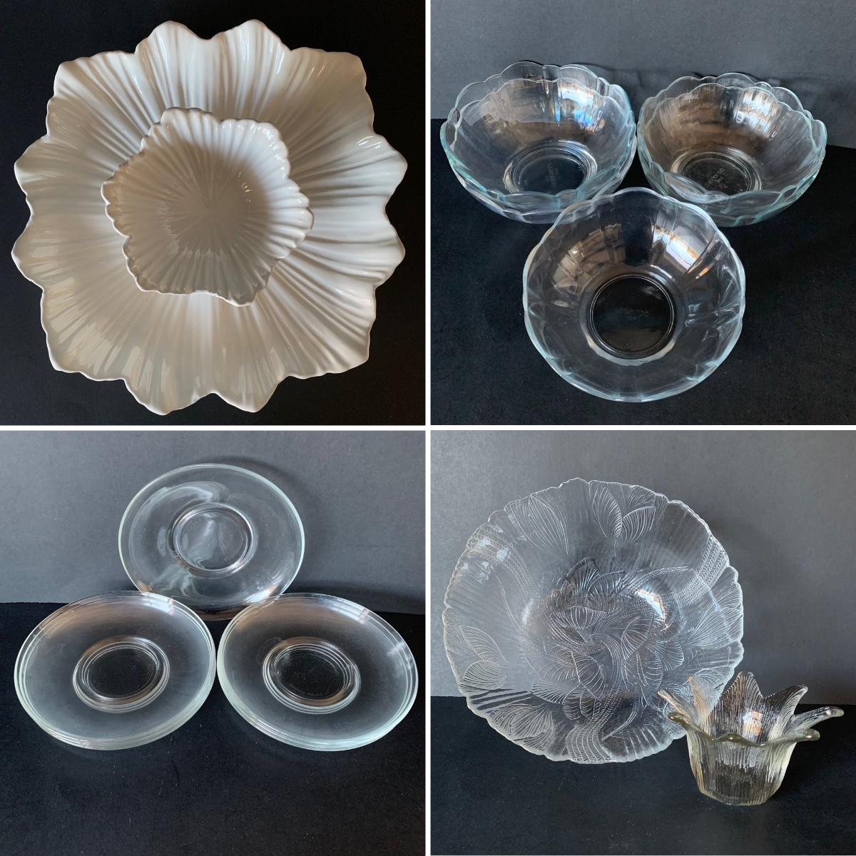 LOT 103 D: Vintage Whittier Pottery Lotus Flower Chip & Dip Set, Arcoroc Canterbury Crocus Serving Bowl, Arcoroc Plates & Bowls, & Flower Shaped Votive
