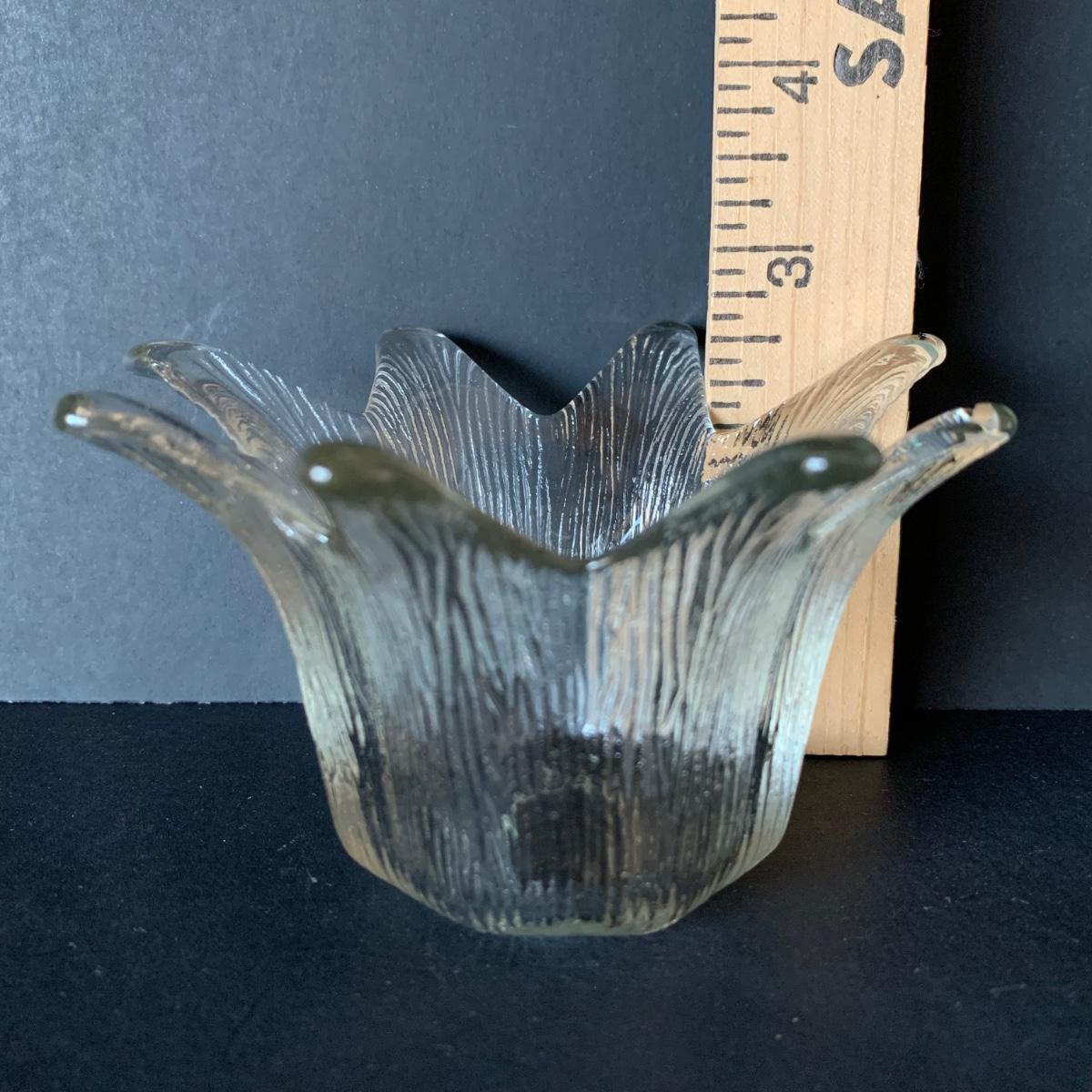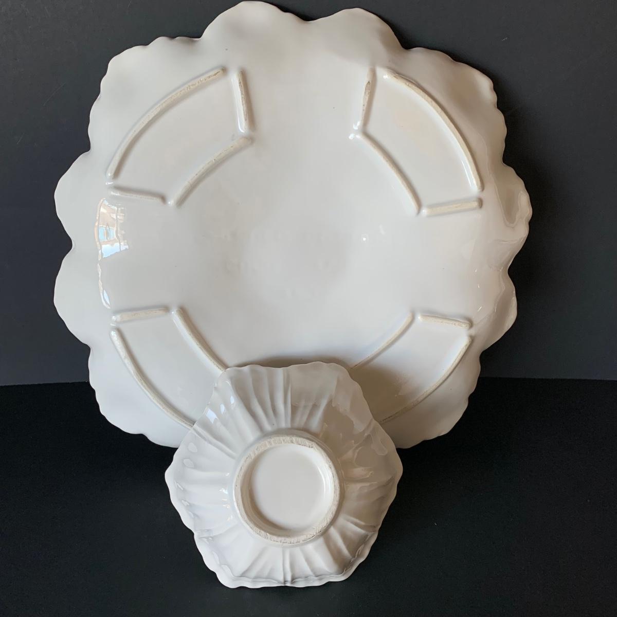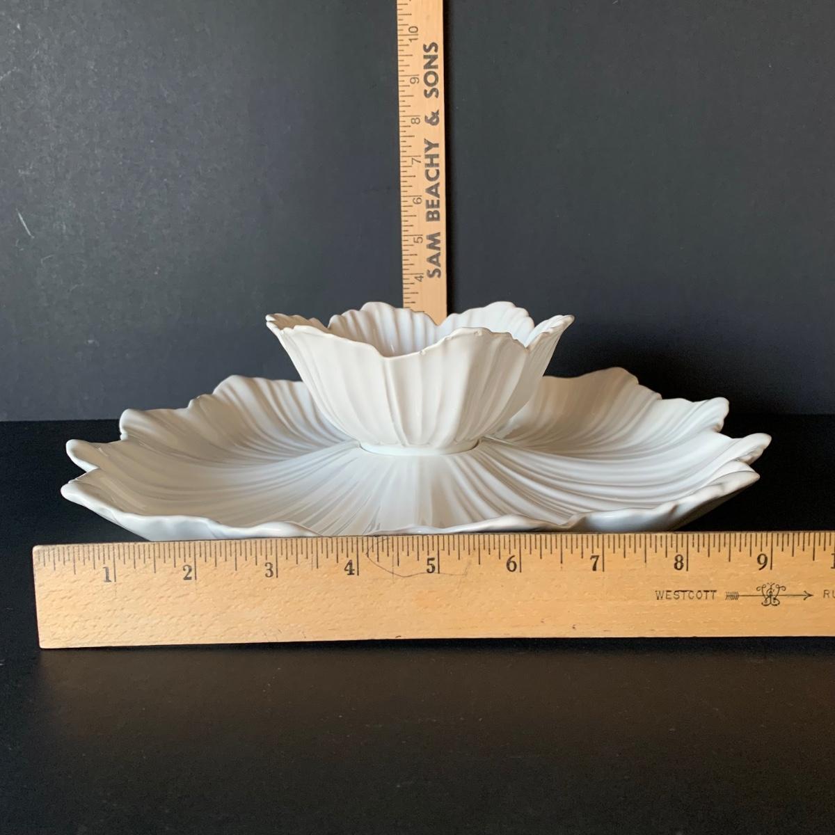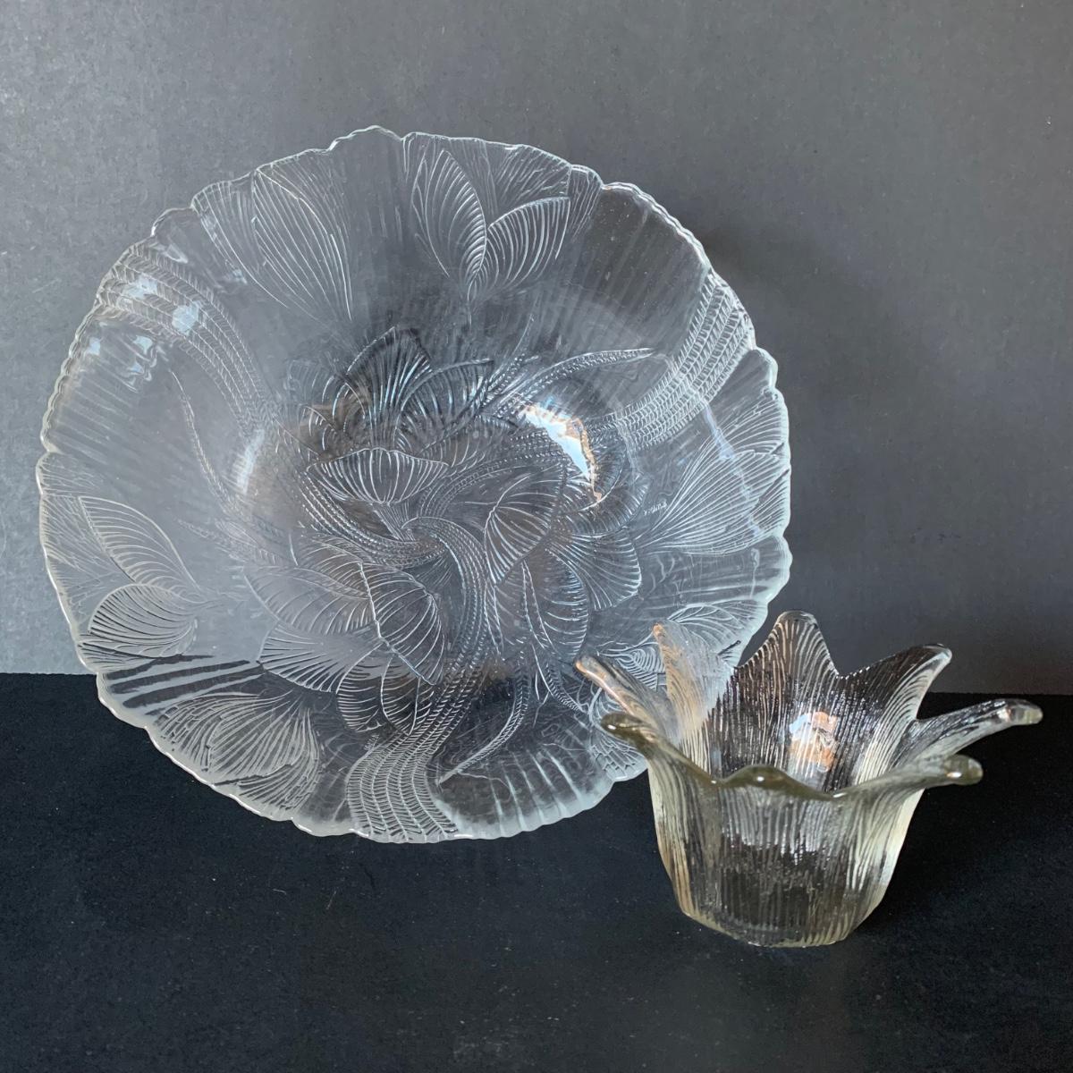 LOT 103 D: Vintage Whittier Pottery Lotus Flower Chip & Dip Set, Arcoroc Canterbury Crocus Serving Bowl, Arcoroc Plates & Bowls, & Flower Shaped Votive