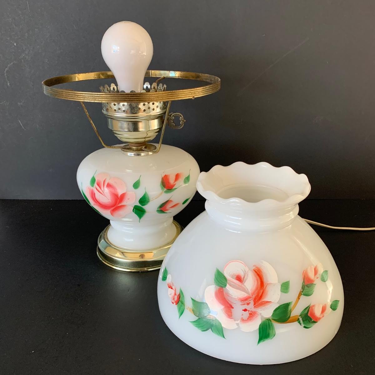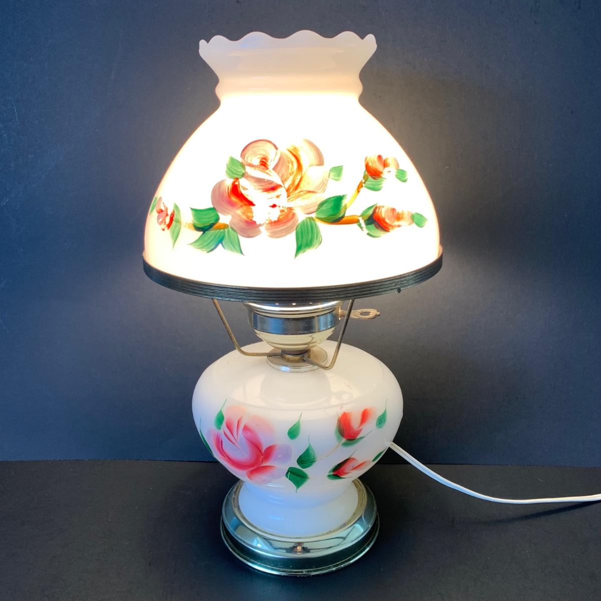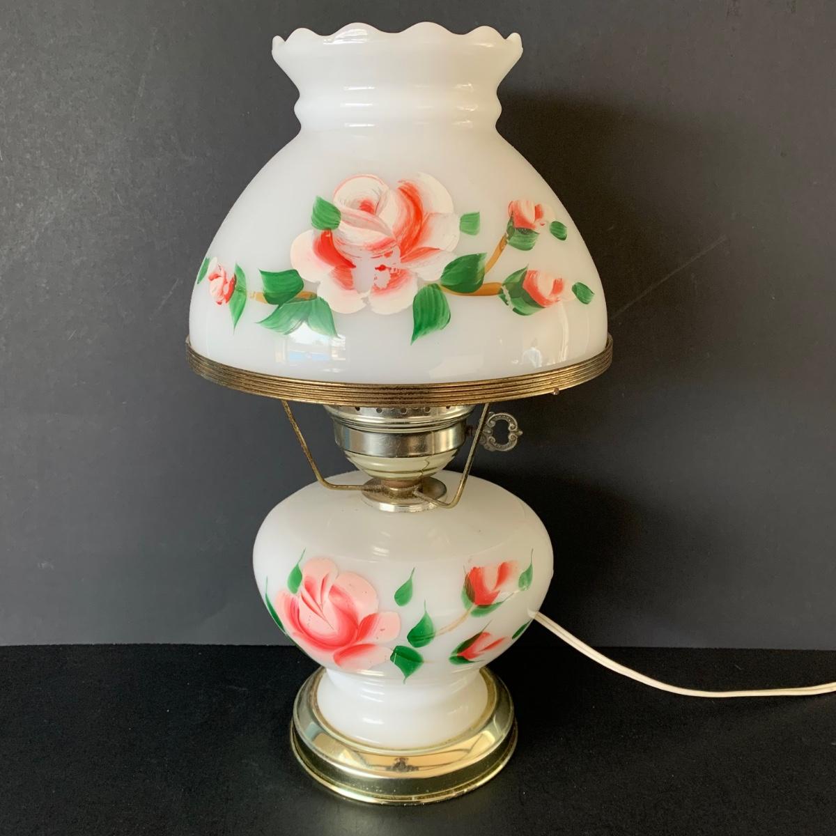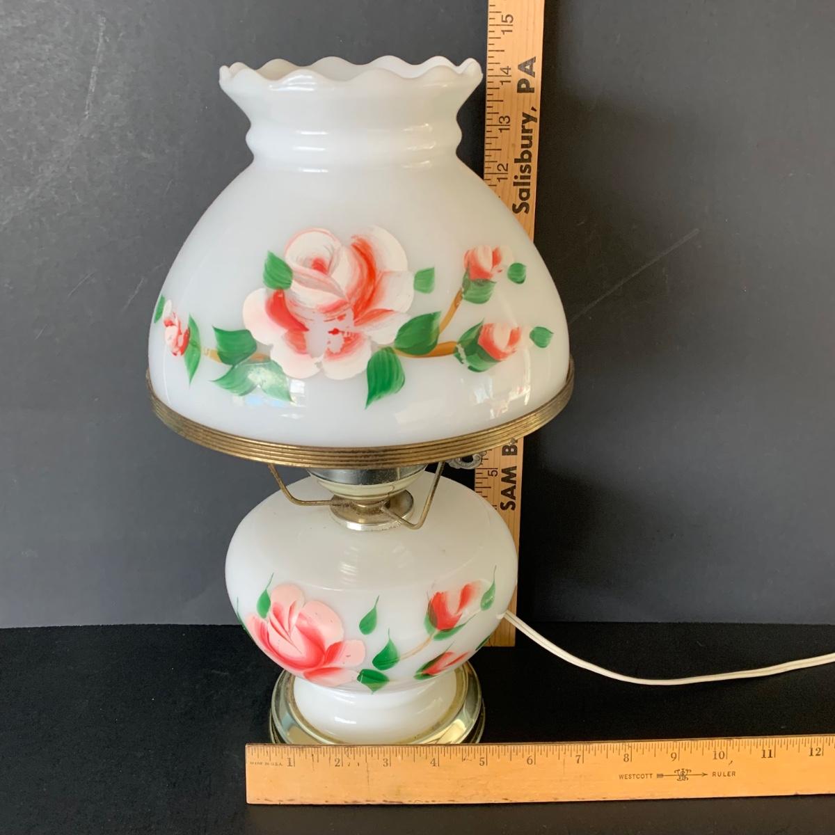 LOT 111 K: Vintage Hand Painted Milk Glass Hurricane Lamp