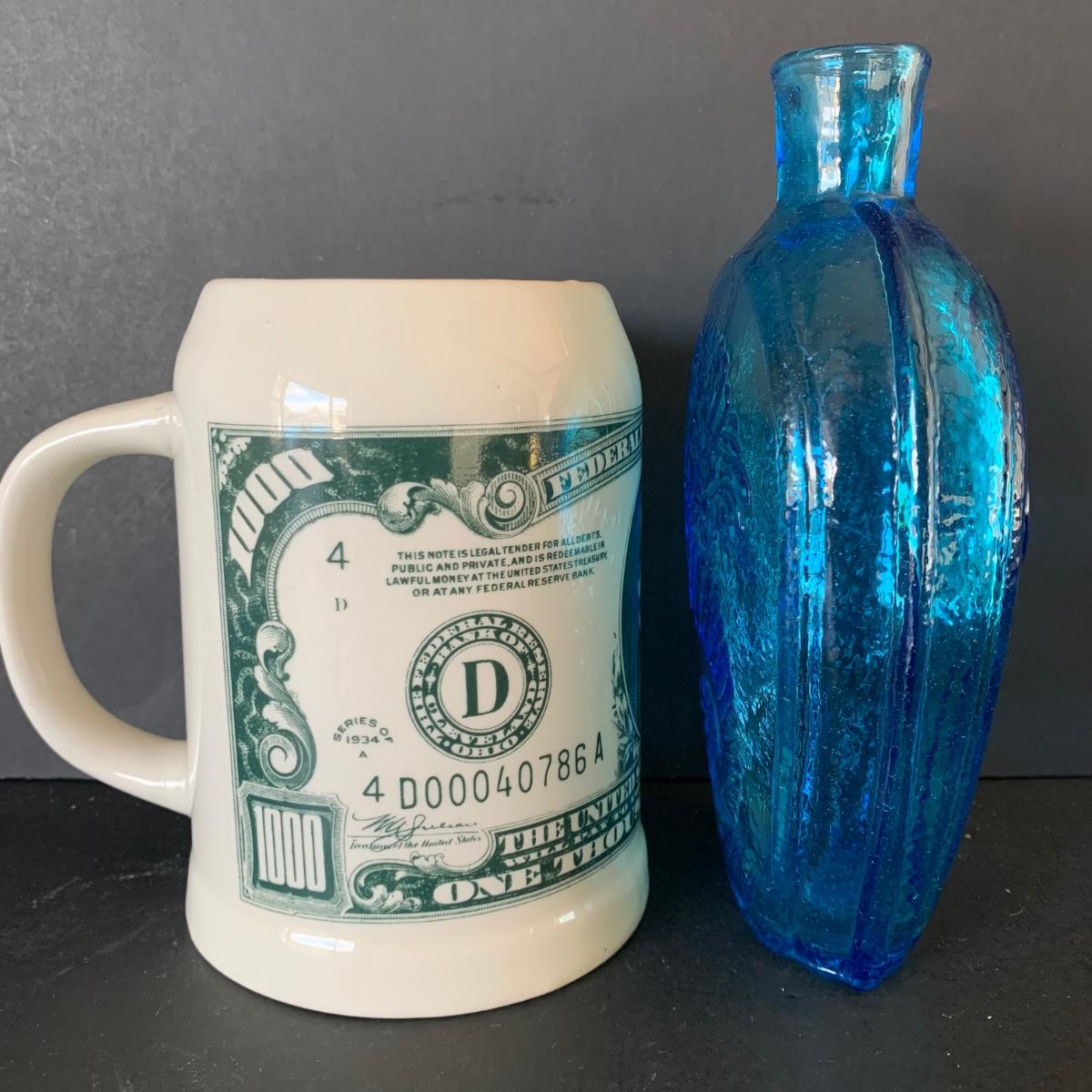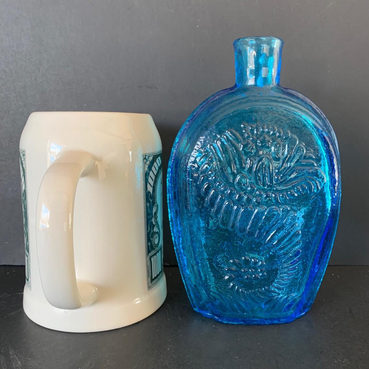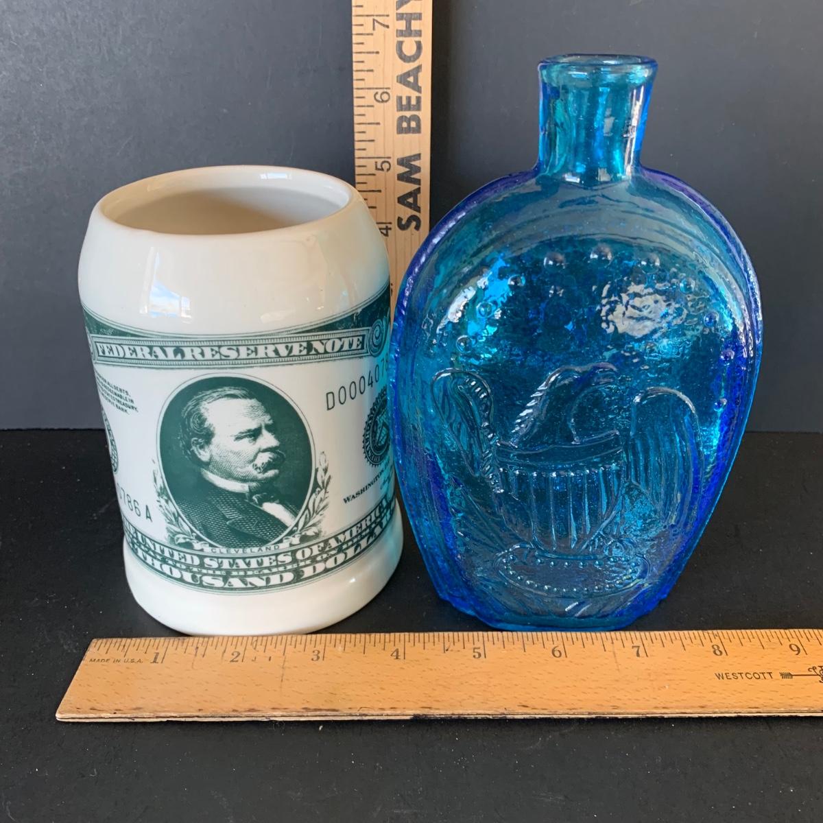 LOT 112 K Vintage Blue Glass Bottle W/ Eagle On Shield, Money Mug, Pennsylvania Themed Trivets, & More