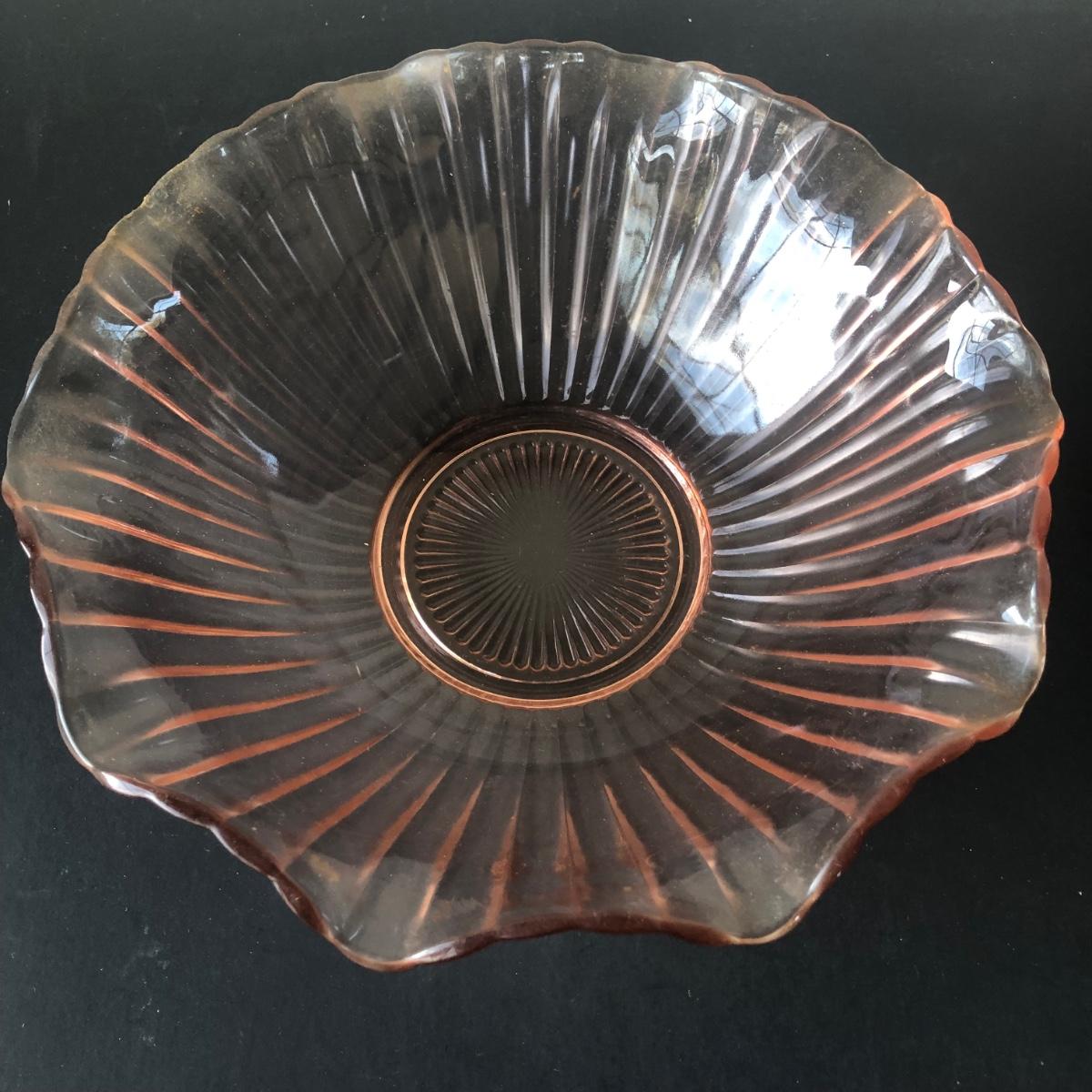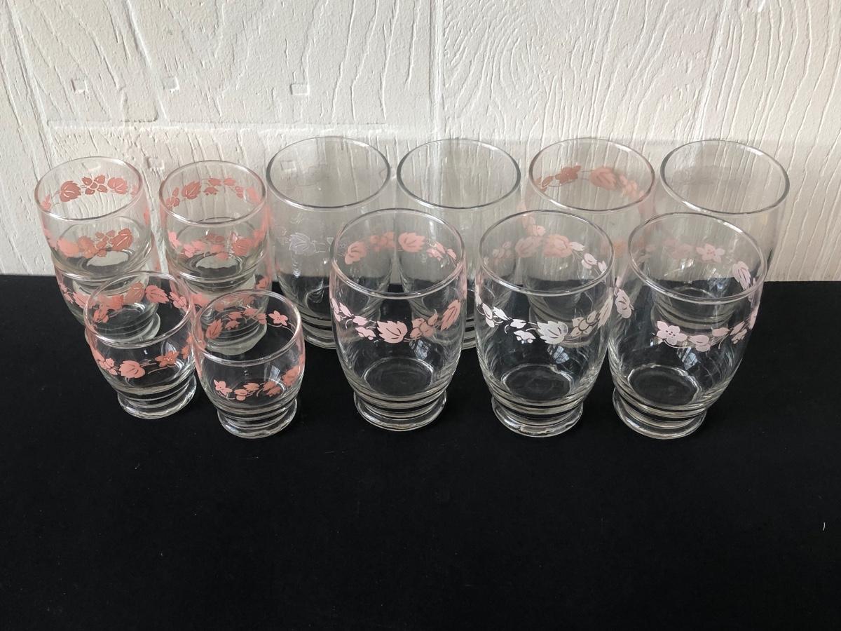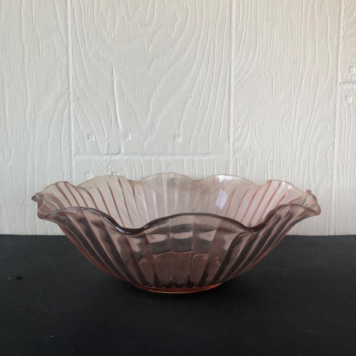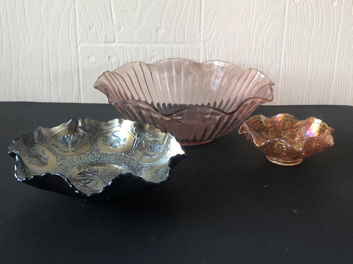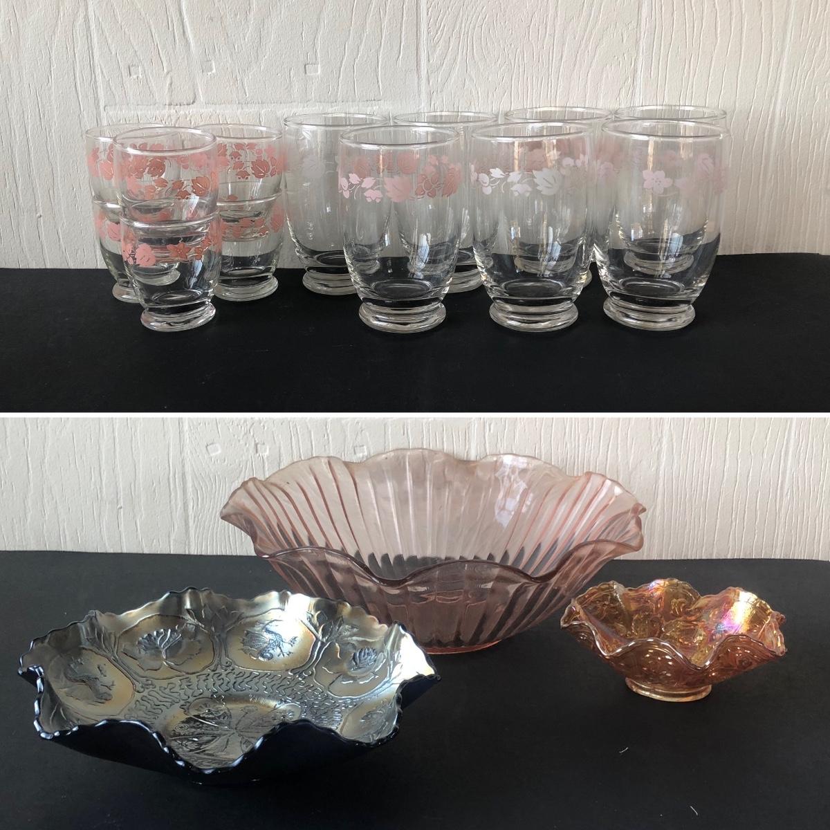LOT 215K: Pink Depression Glass Wavy Bowl, Carnival Glass Bowls & Pink Floral Glasses in 2 Sizes