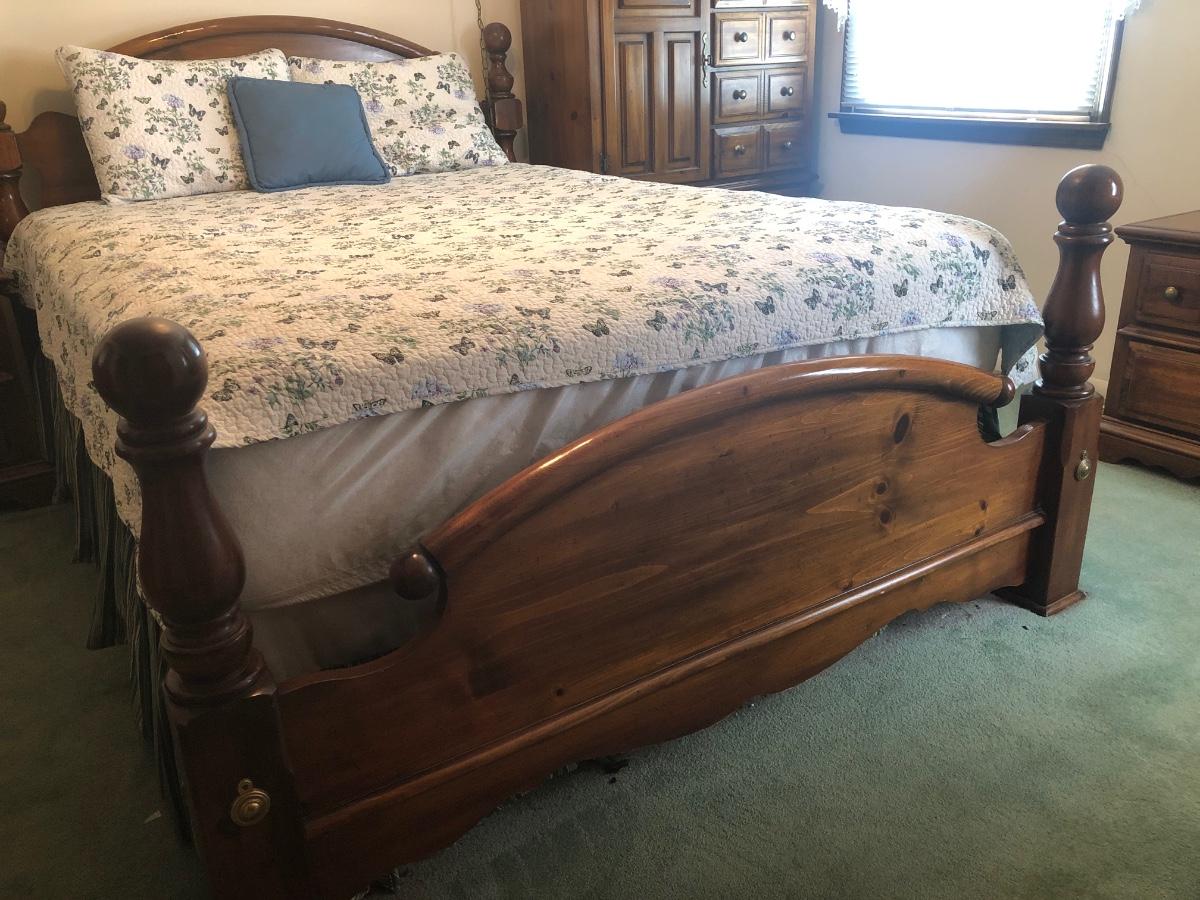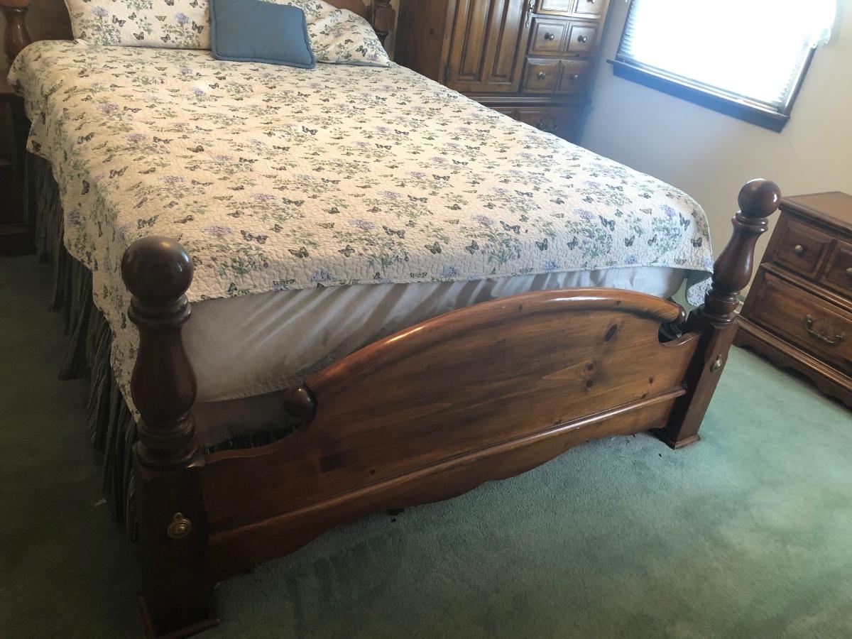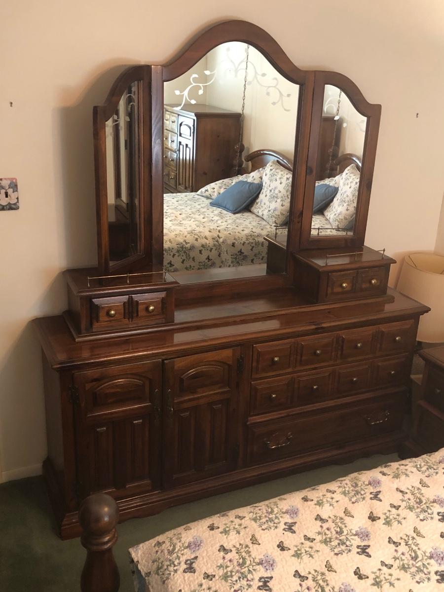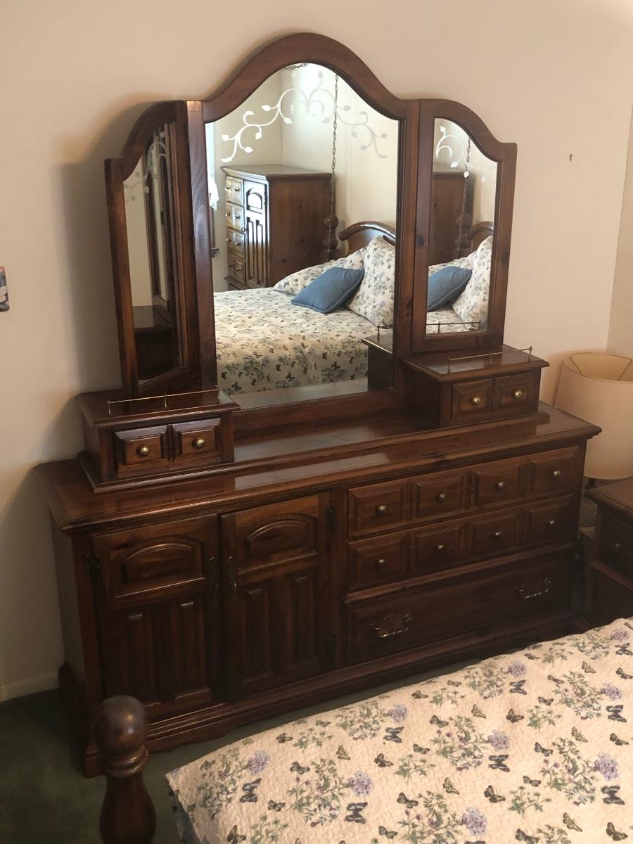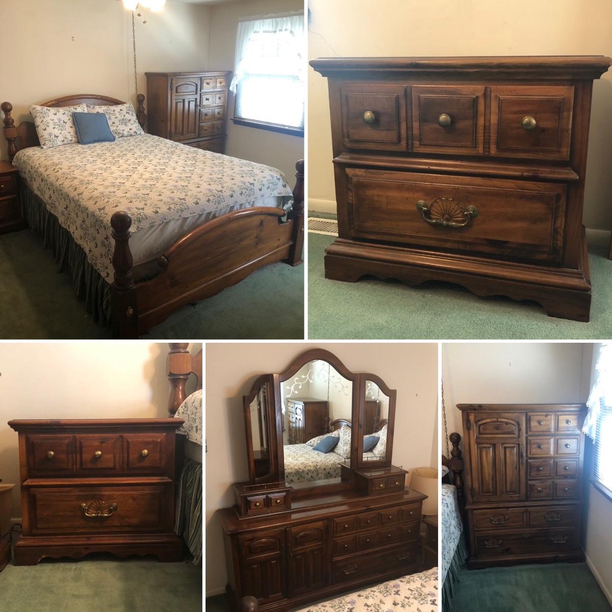 LOT 221Y: Vintage Wood Bedroom Set - Bed Frame, Bureau, 2 Night Stands & Vanity