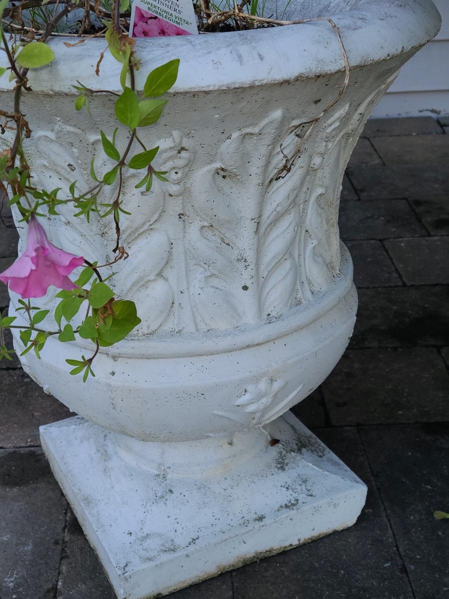 Porch planters/urns with flowers. These are concrete and white in color. No measurements. 32x18x82. This unit is part one of a system of three. We are listing individually as someone may need just one for an office, or living room and not all three. Gold ornate hardware. Storage underneath. Items inside not included. There are small holes on the side where you can connect the three. You can leave alone, or fill. Please see pictures of holes. Please see all pictures as they are the best representation of the items in the lot, the condition of the lot, and will show measurements if taken. If purchasing furniture you must be able to move yourself with your own help, and truck. .