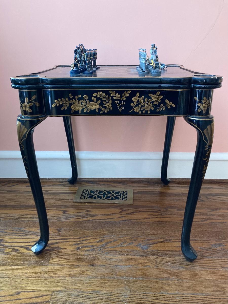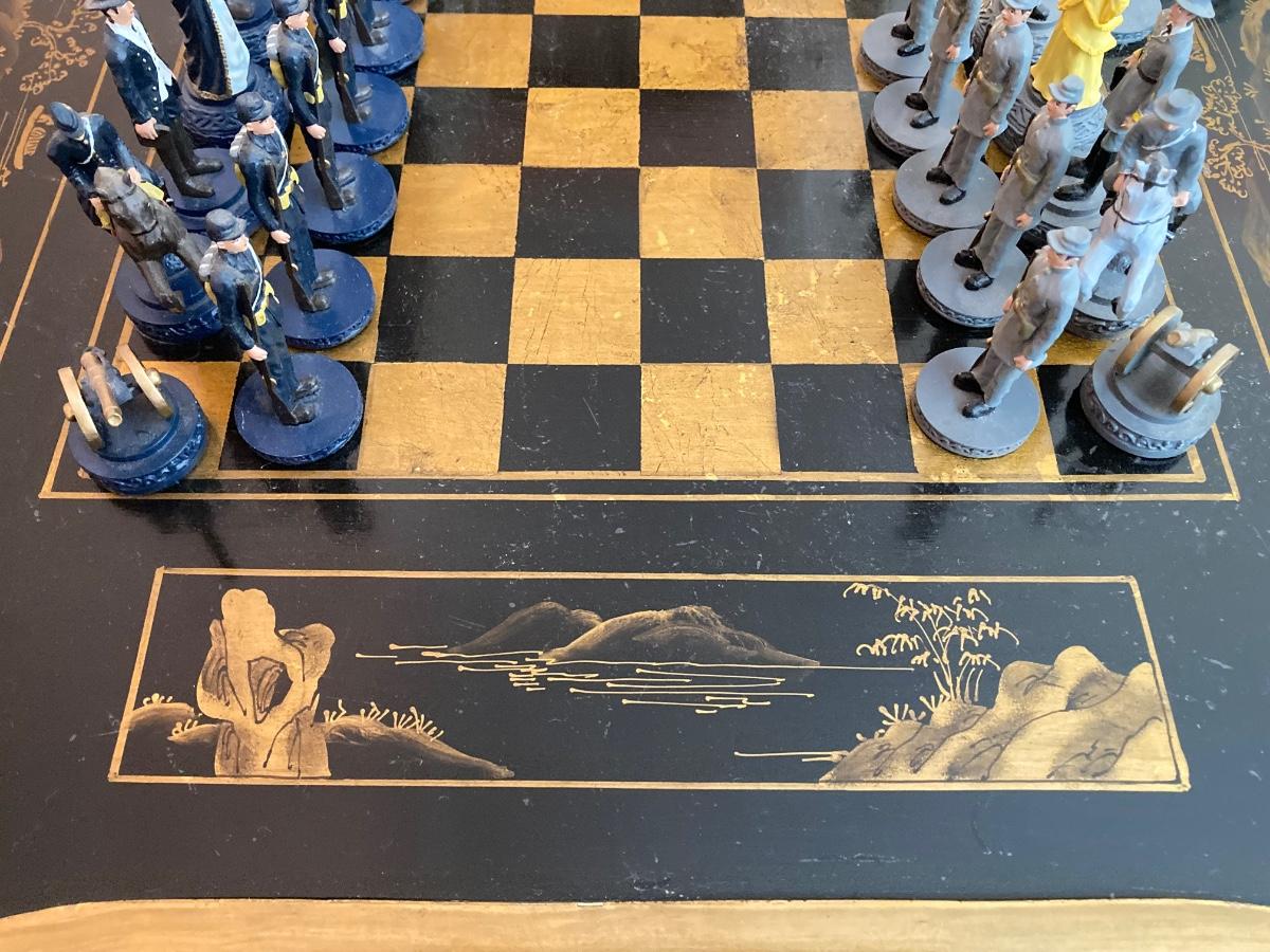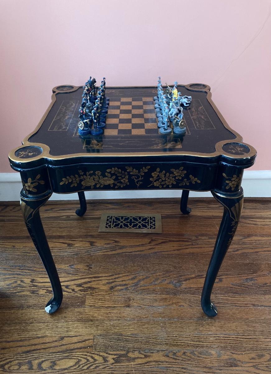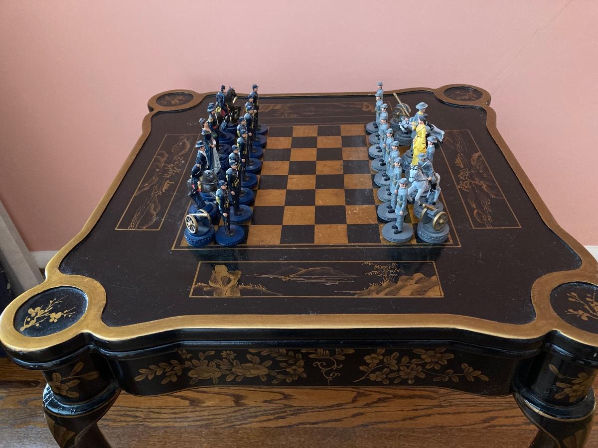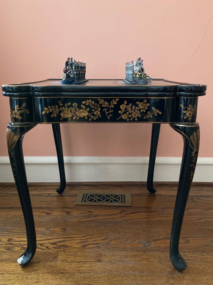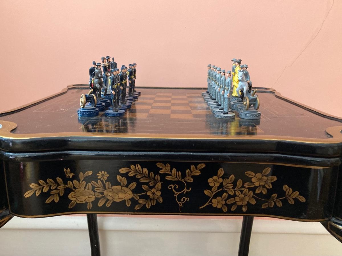 LOT 55: Hand Painted Black Lacquer Cabriole Chess Table with Civil War Chess Pieces