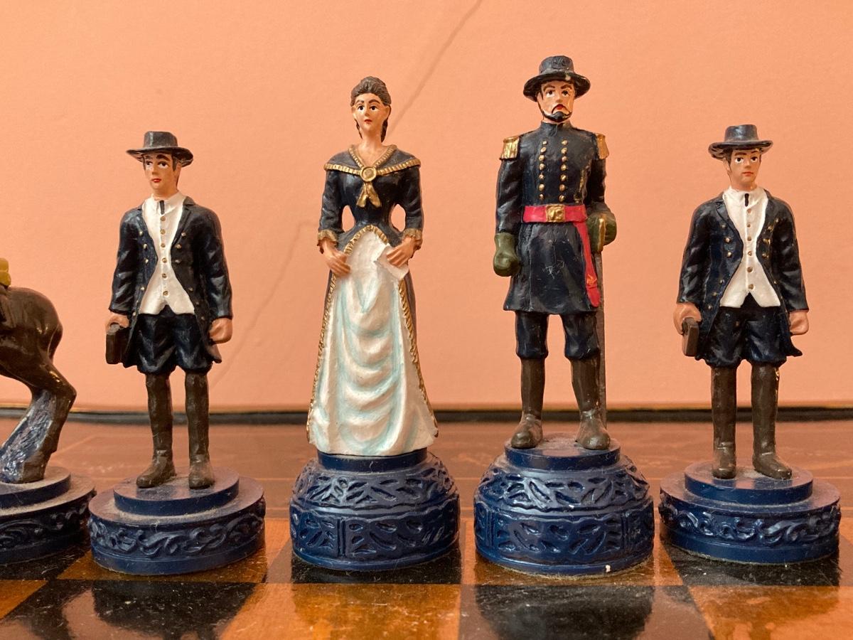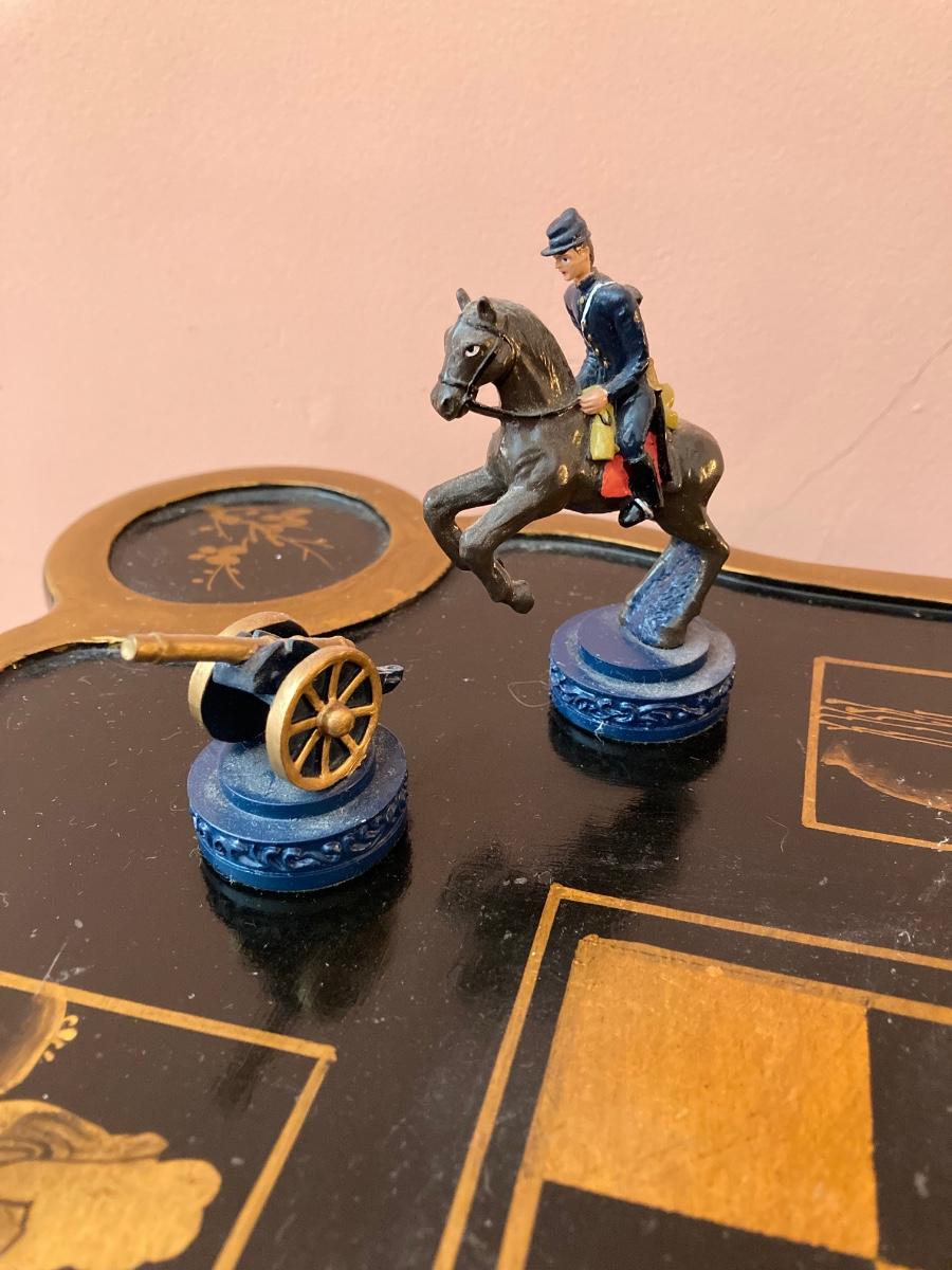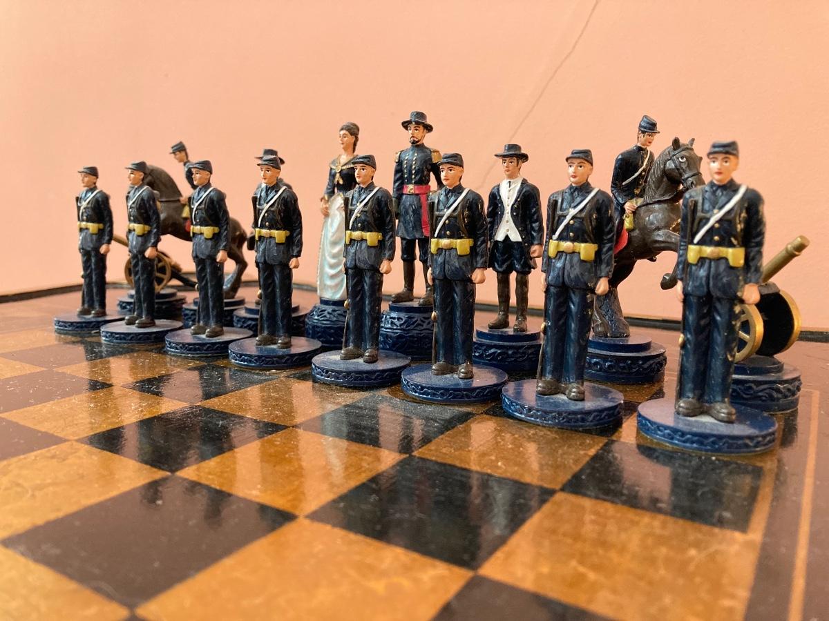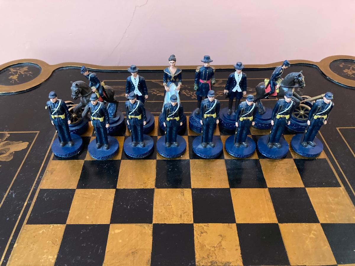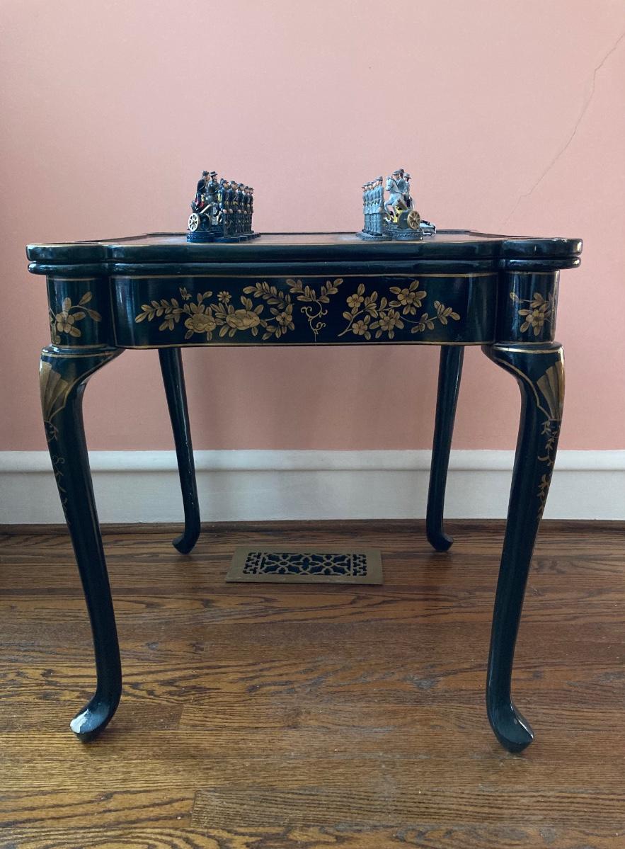 LOT 55: Hand Painted Black Lacquer Cabriole Chess Table with Civil War Chess Pieces