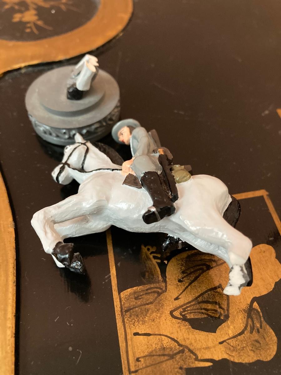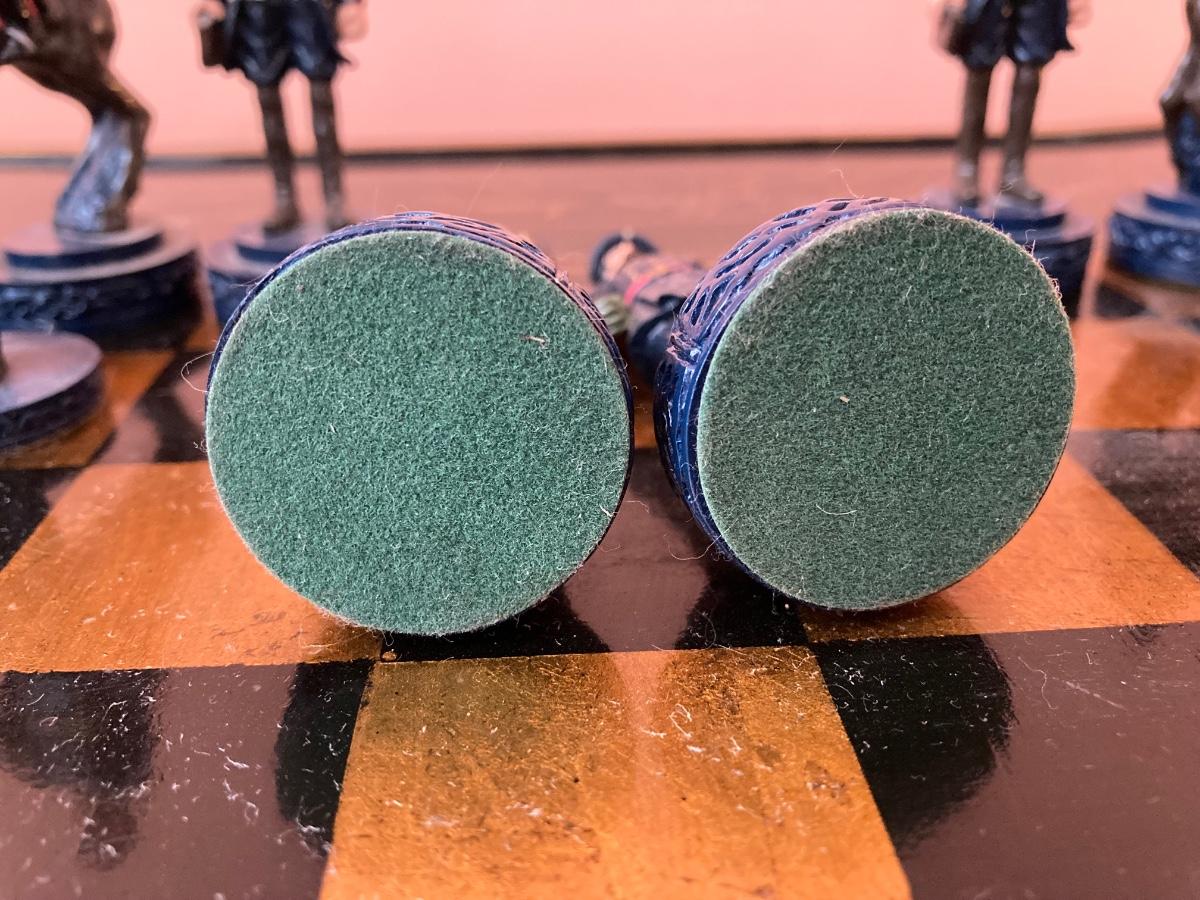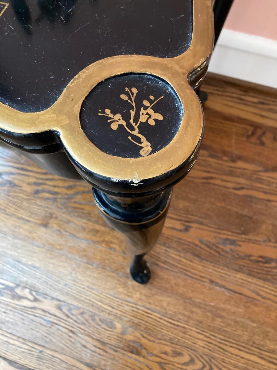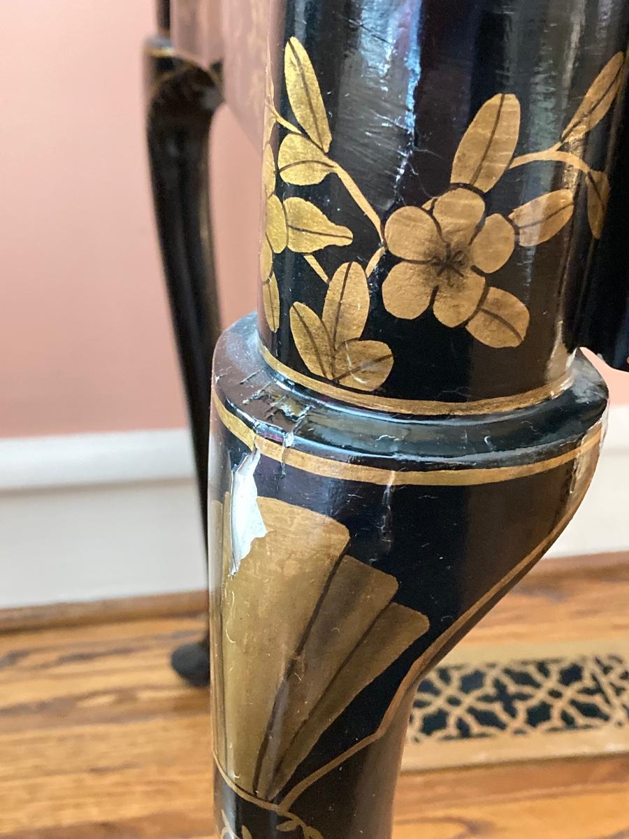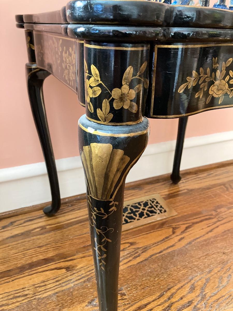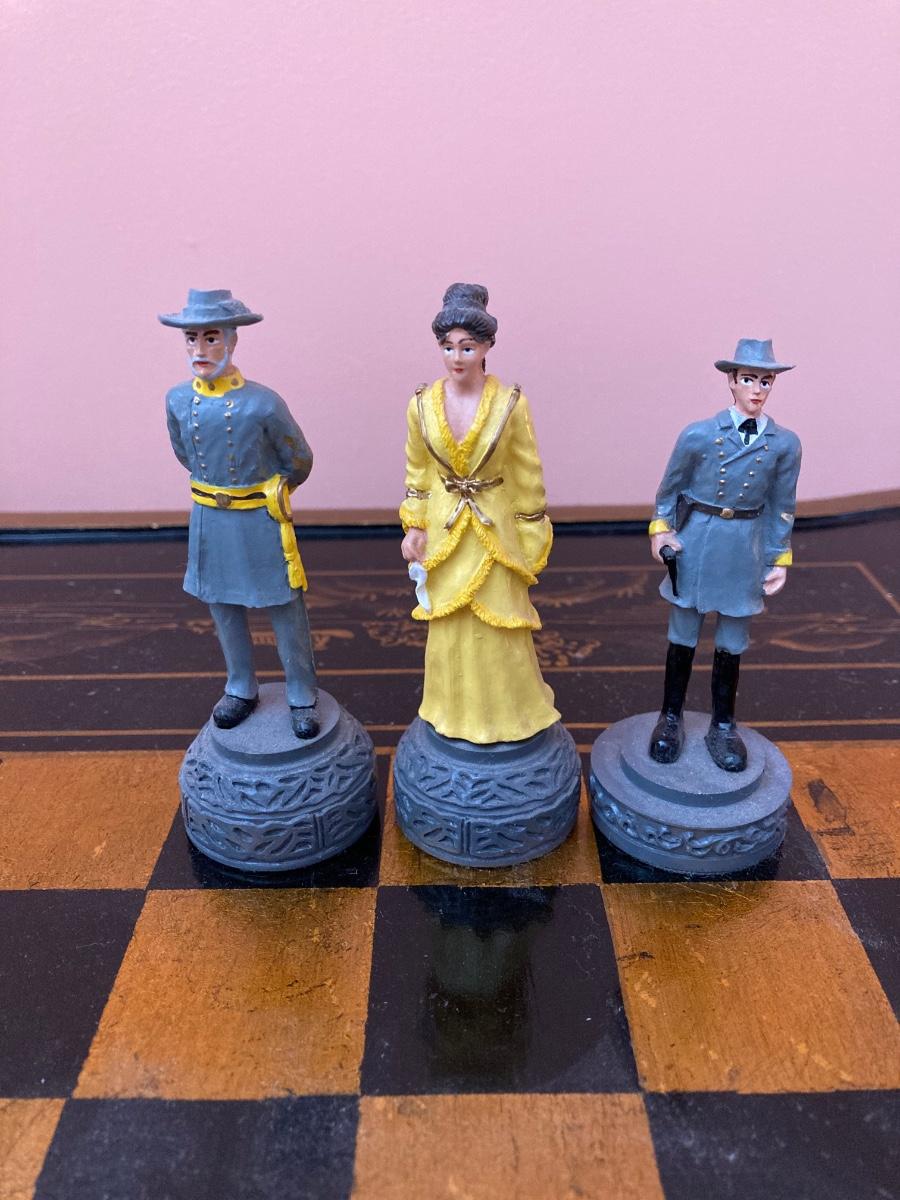 LOT 55: Hand Painted Black Lacquer Cabriole Chess Table with Civil War Chess Pieces