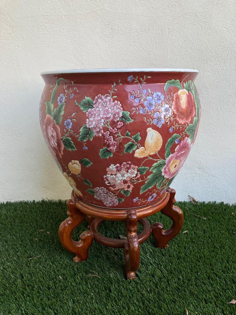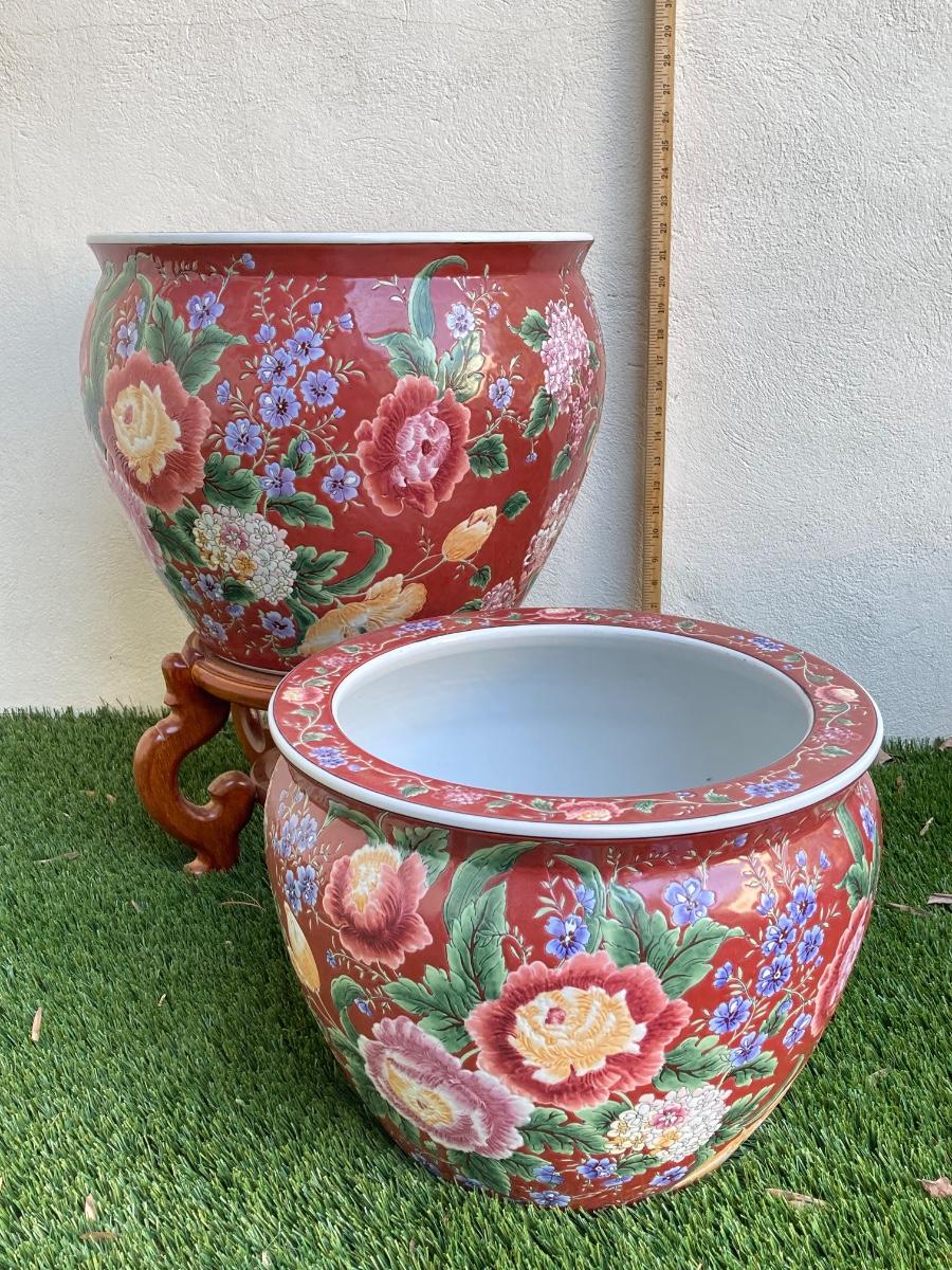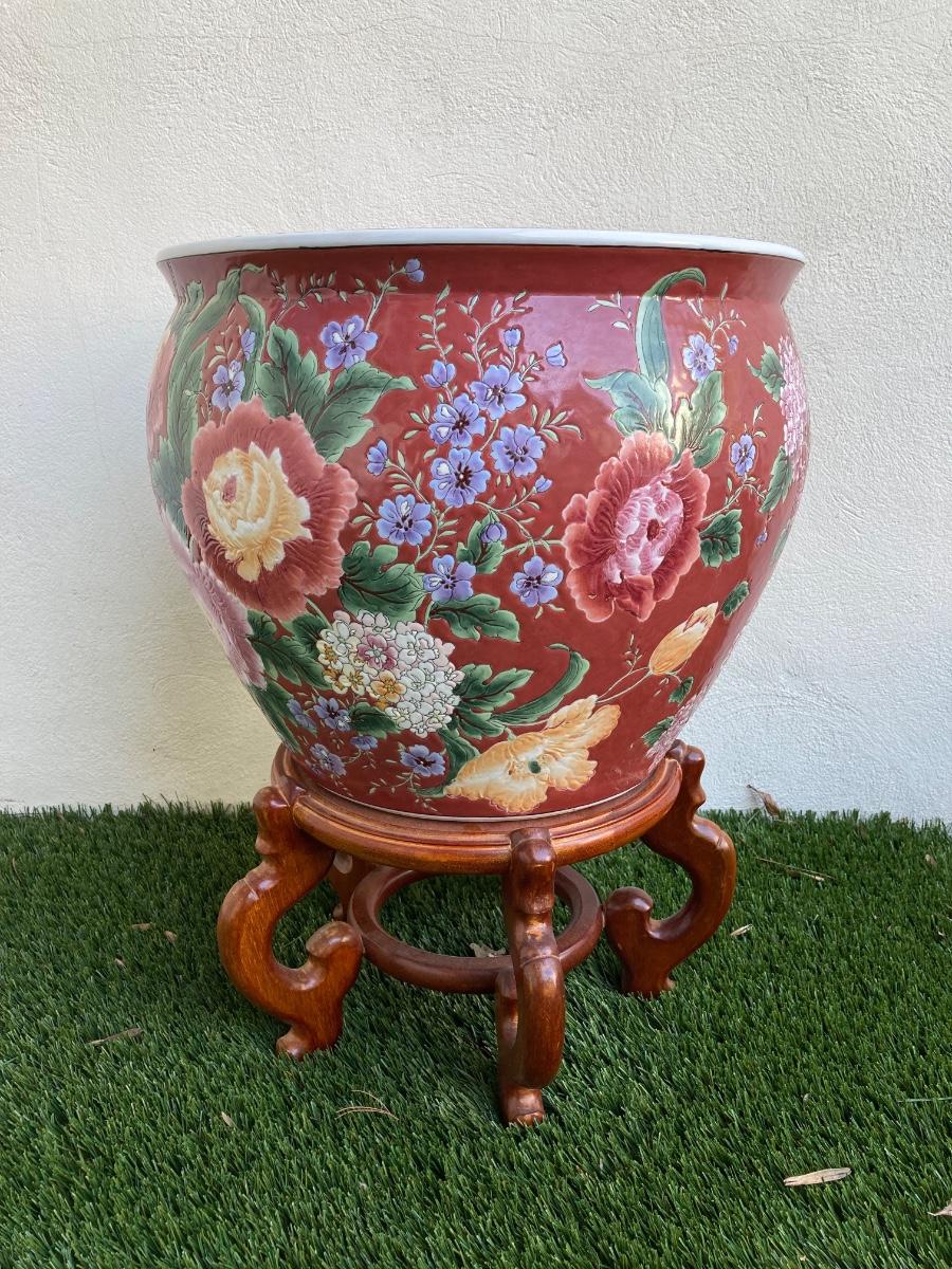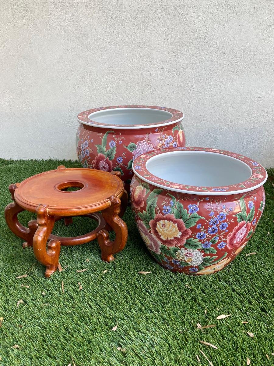 LOT 65: Asian Floral Planters with One Wooden Stand - Made in China