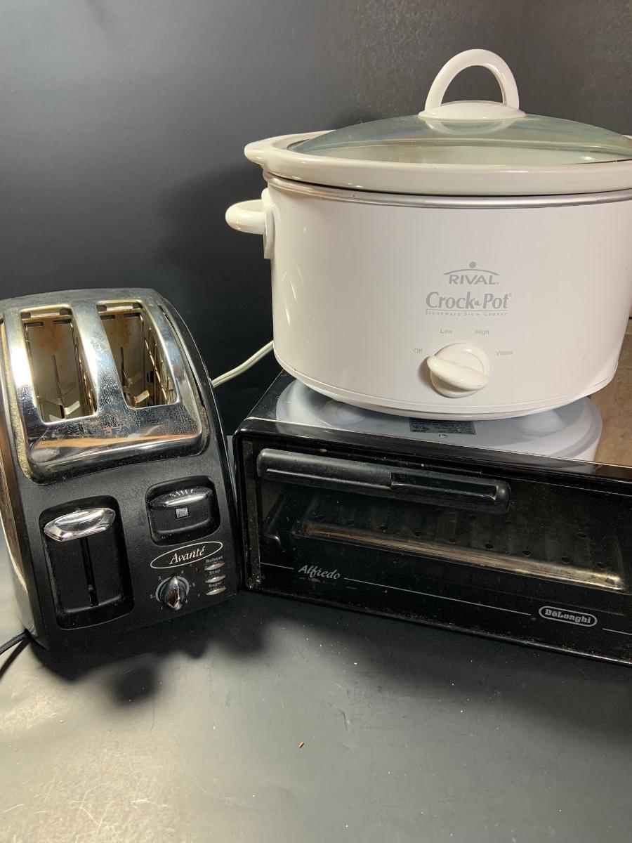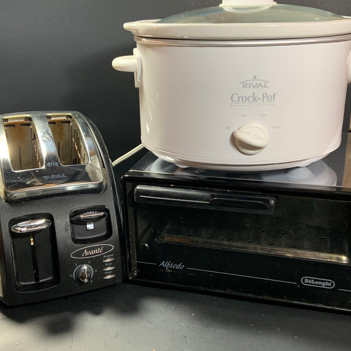 LOT:112B: Kitchen Appliances - T-Fal Toaster, Rival Crock Pot and DeLonghl Toaster Oven
