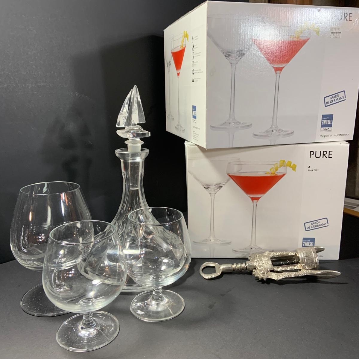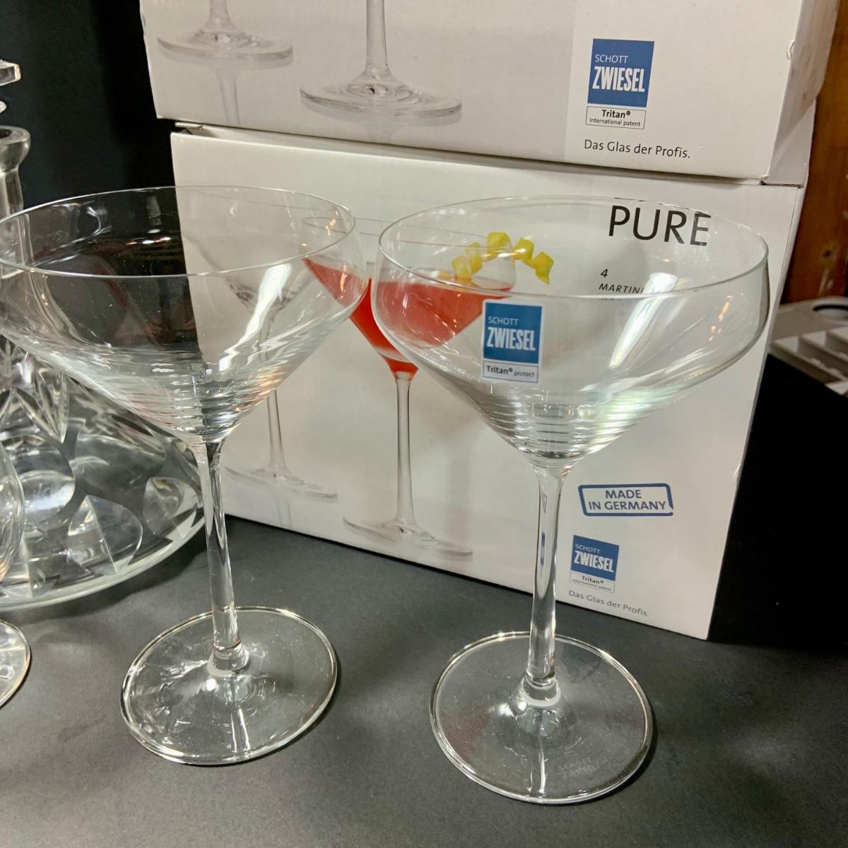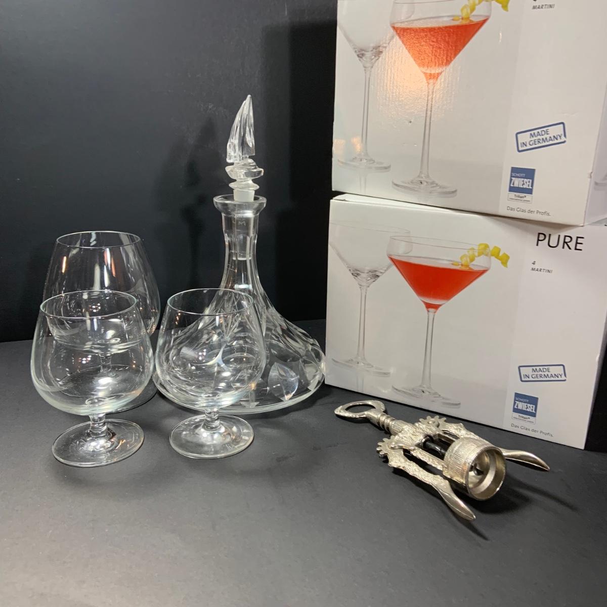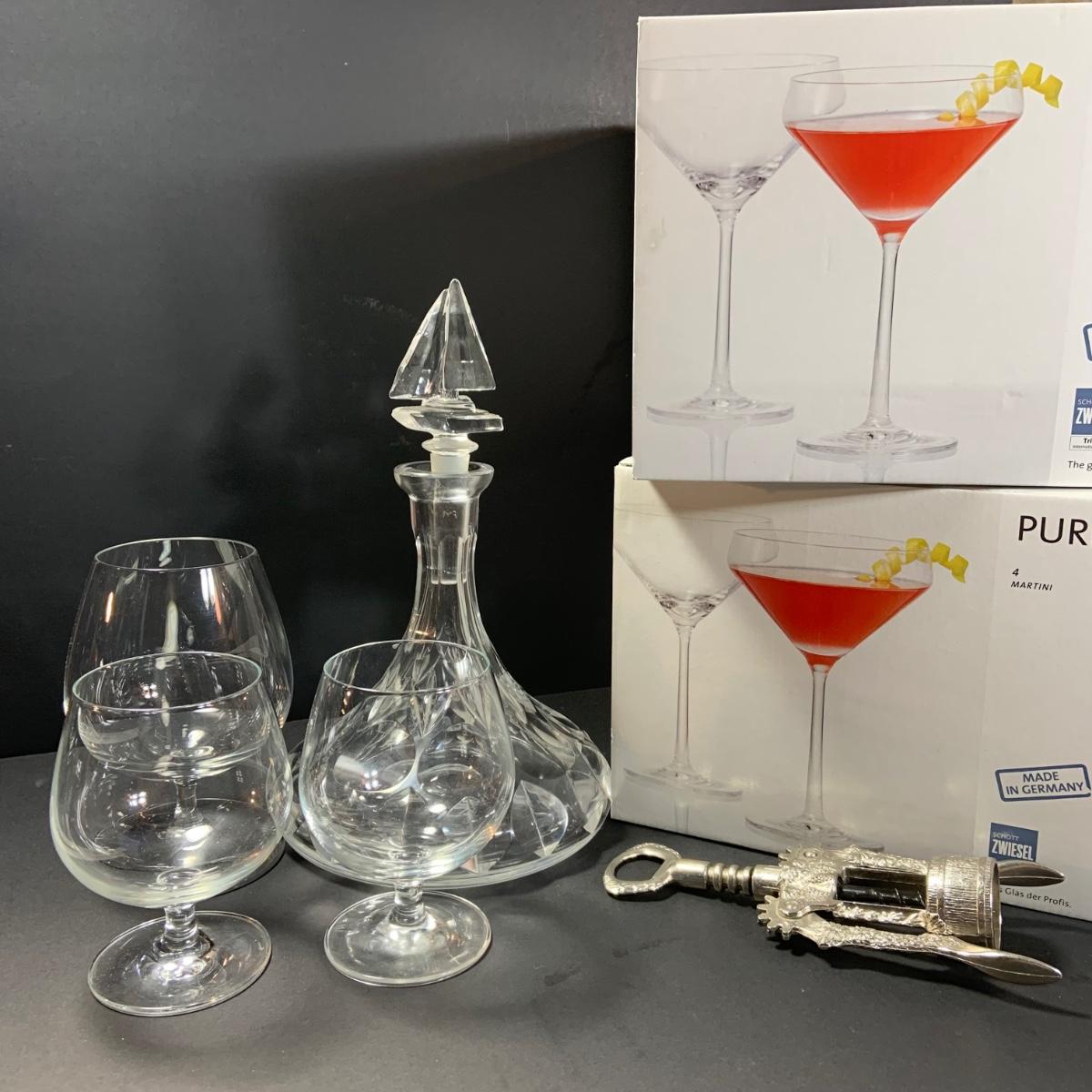 LOT:118B: Bar Collection Featuring Pure Stemmed Martini Glasses in Original Boxes a Crystal Decanter with Sail Boat Stopper and More