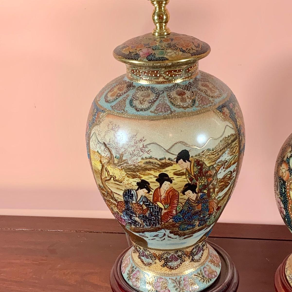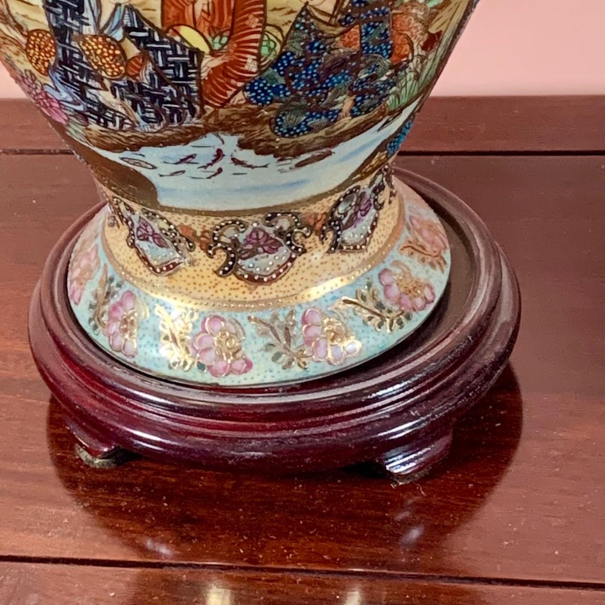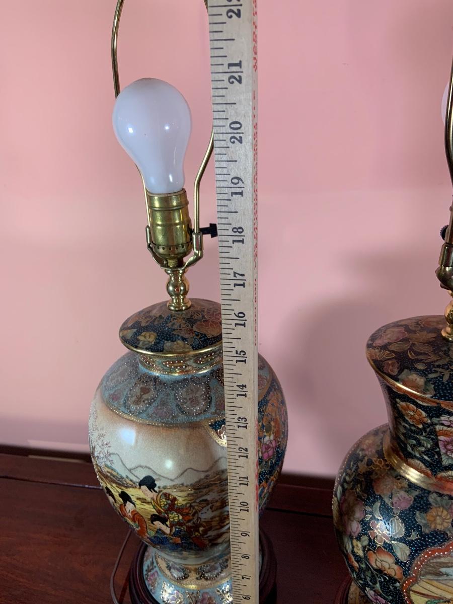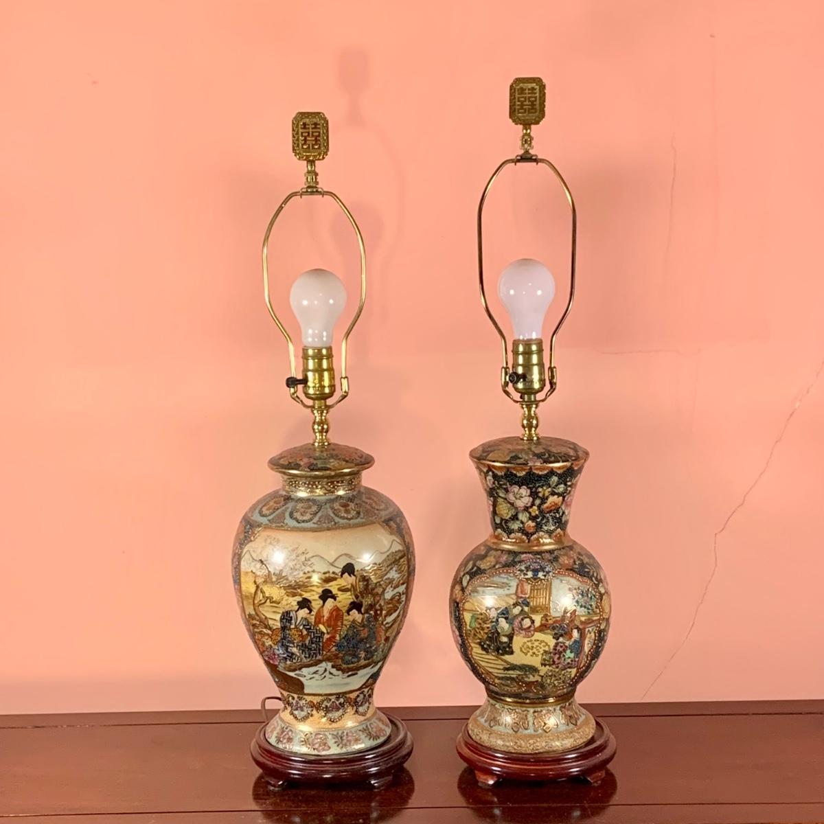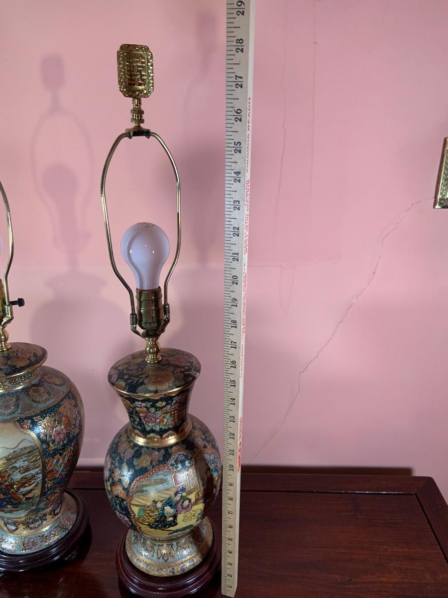 LOT:126: Set of 2 Japanses Satsuma Style Porcelain Table Lamps on Wood Bases