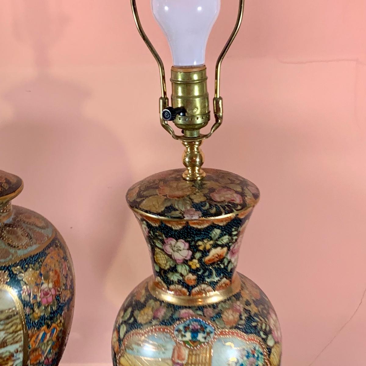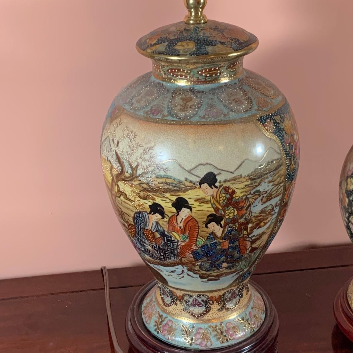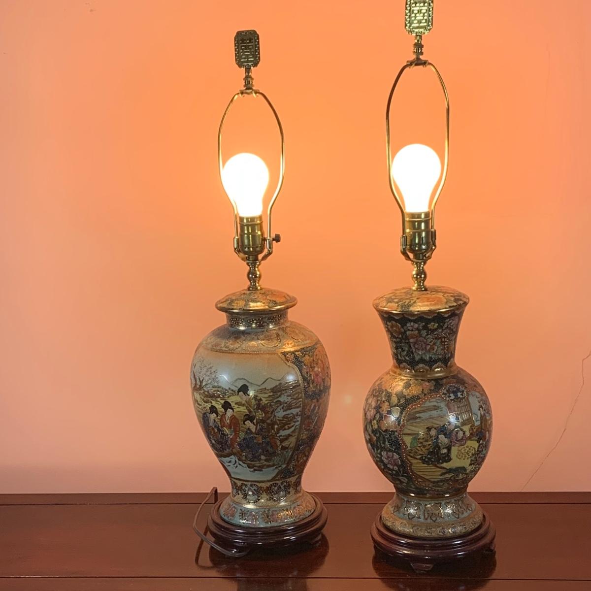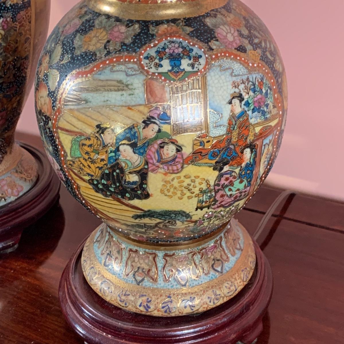 LOT:126: Set of 2 Japanses Satsuma Style Porcelain Table Lamps on Wood Bases