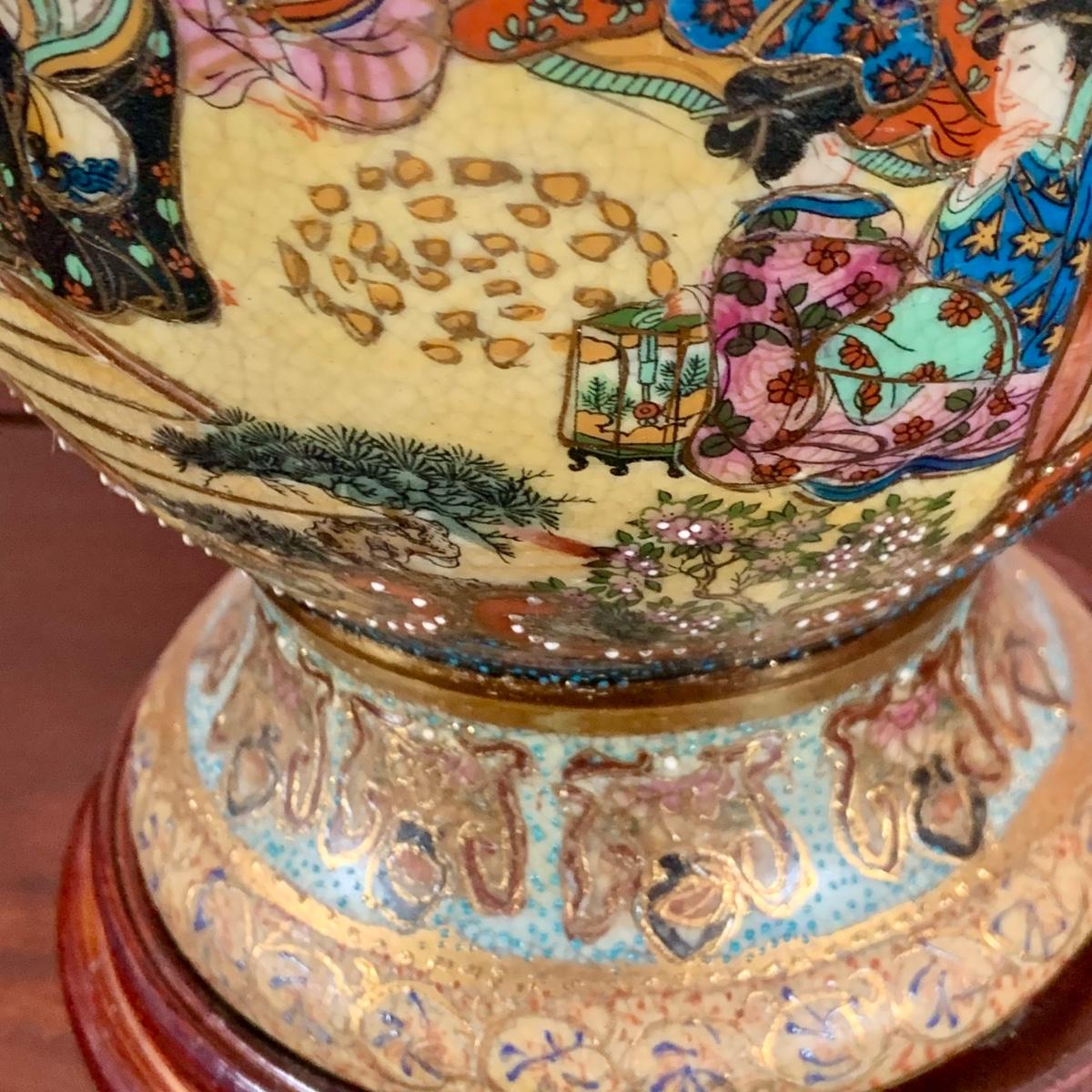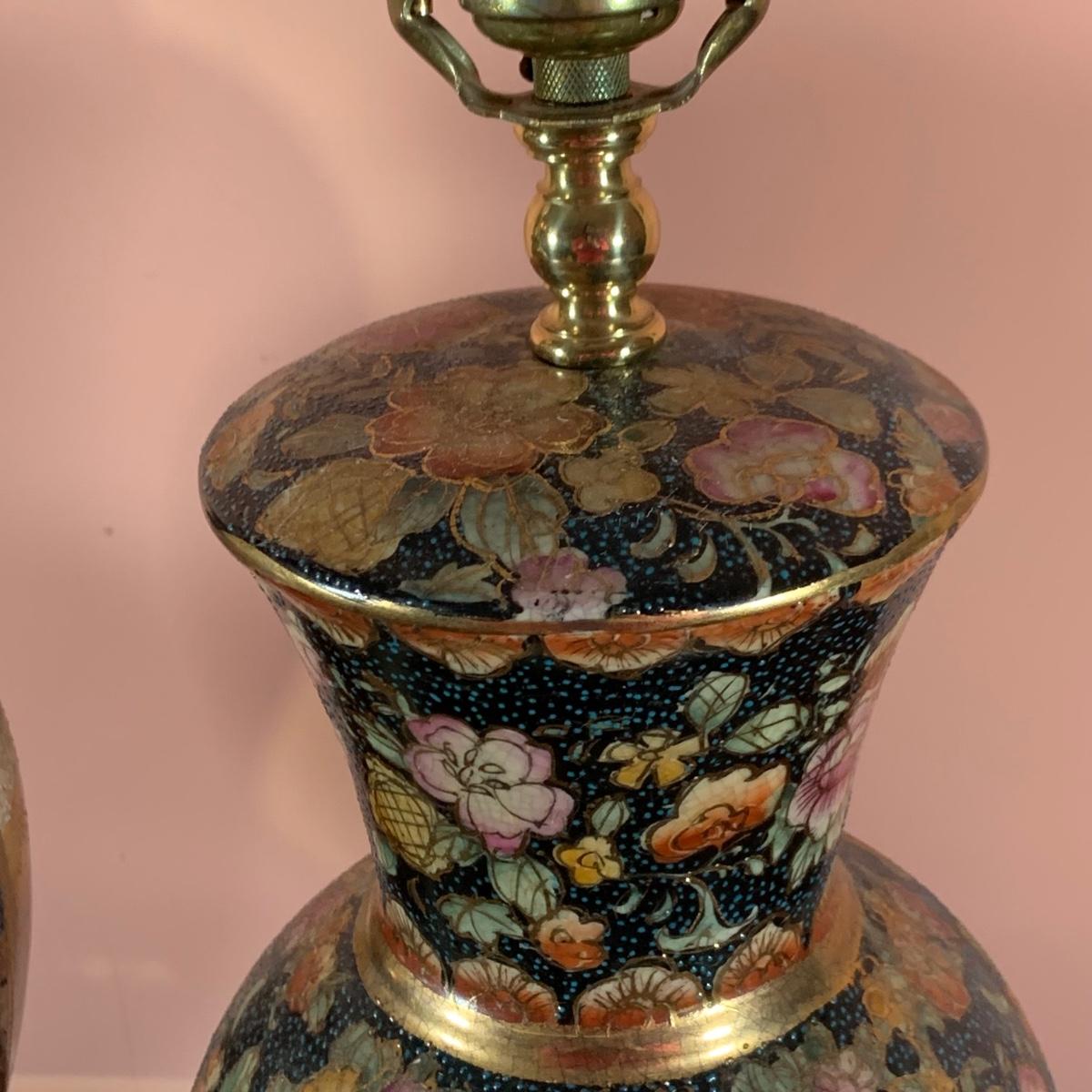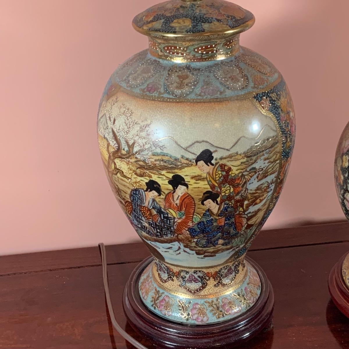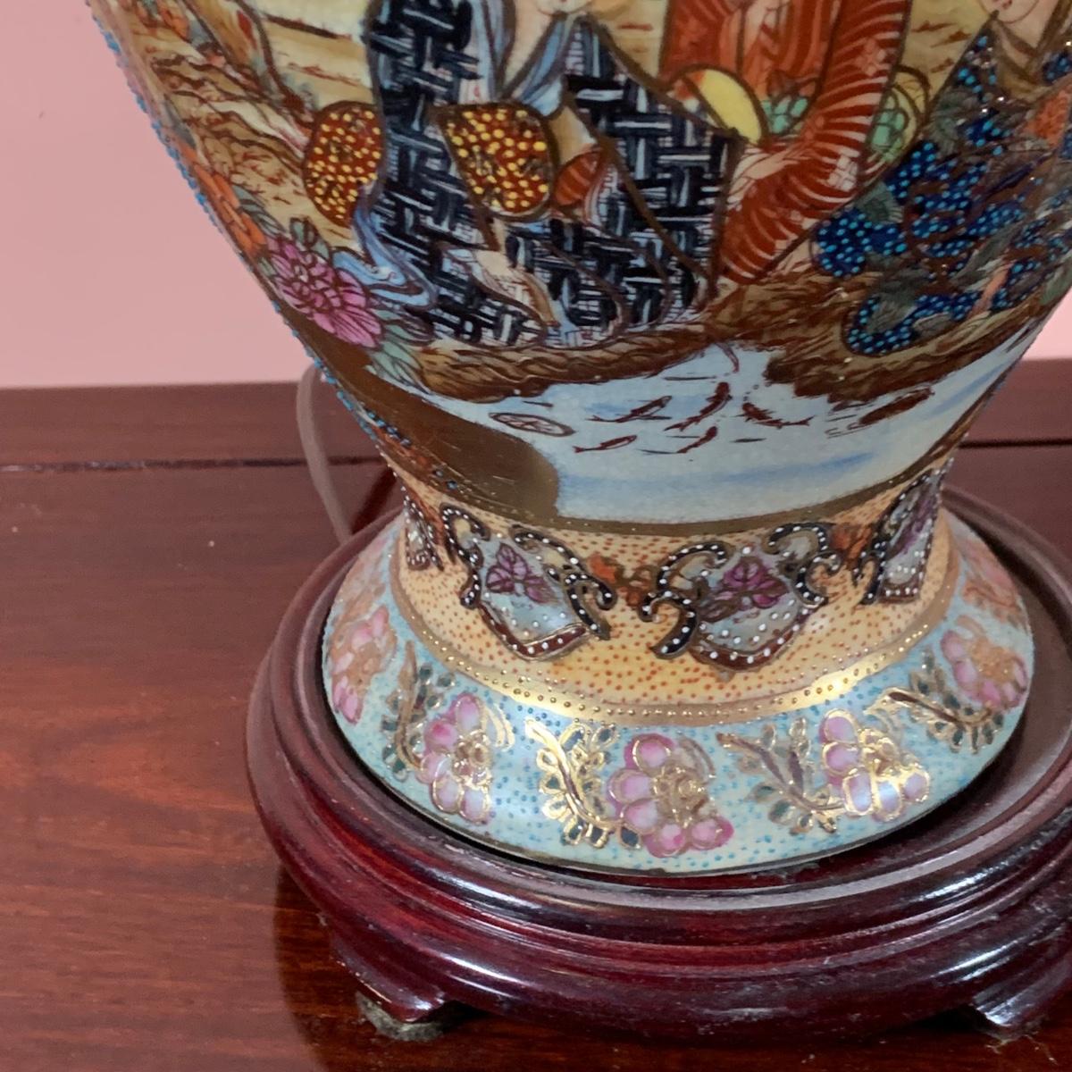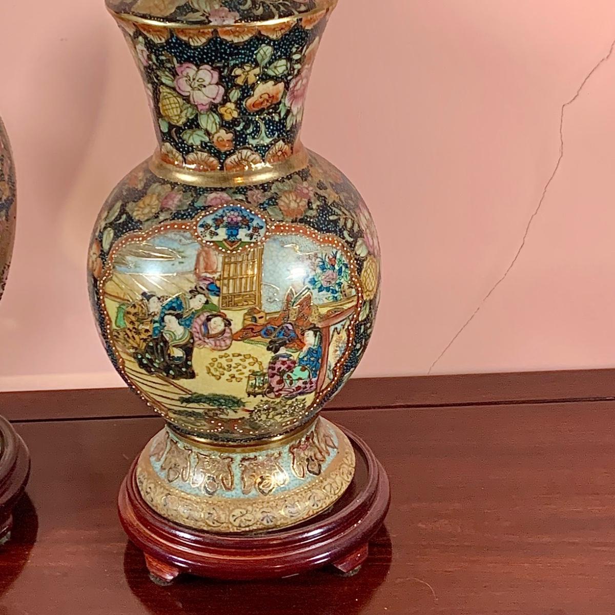 LOT:126: Set of 2 Japanses Satsuma Style Porcelain Table Lamps on Wood Bases