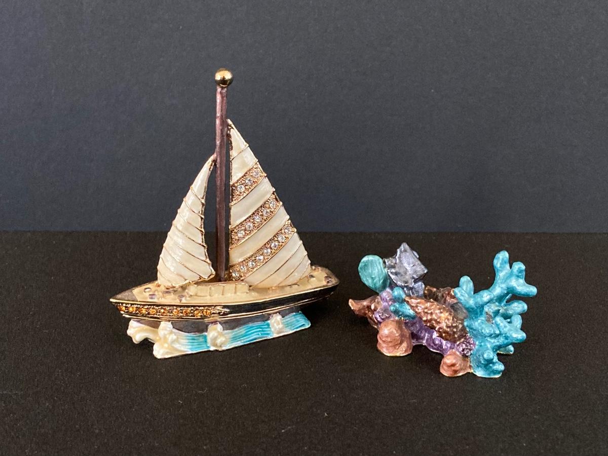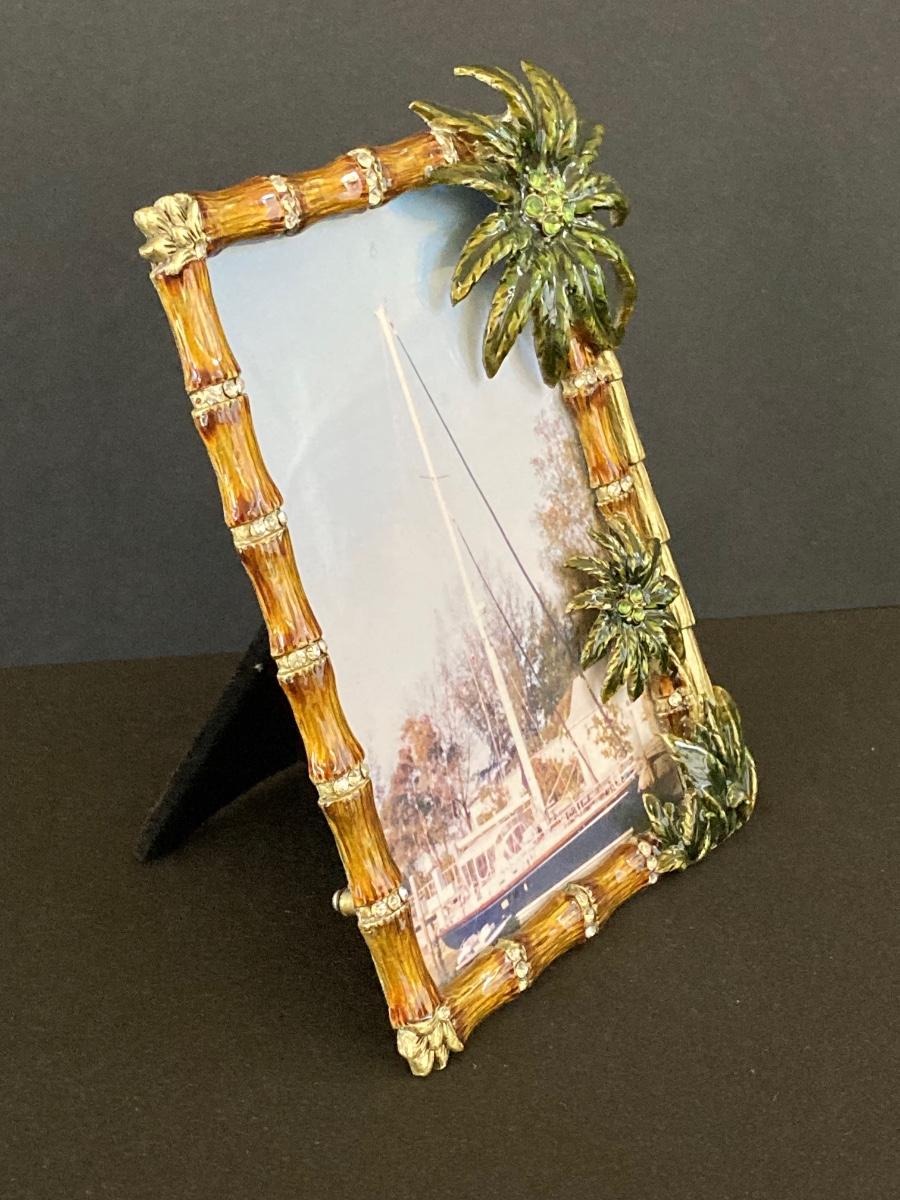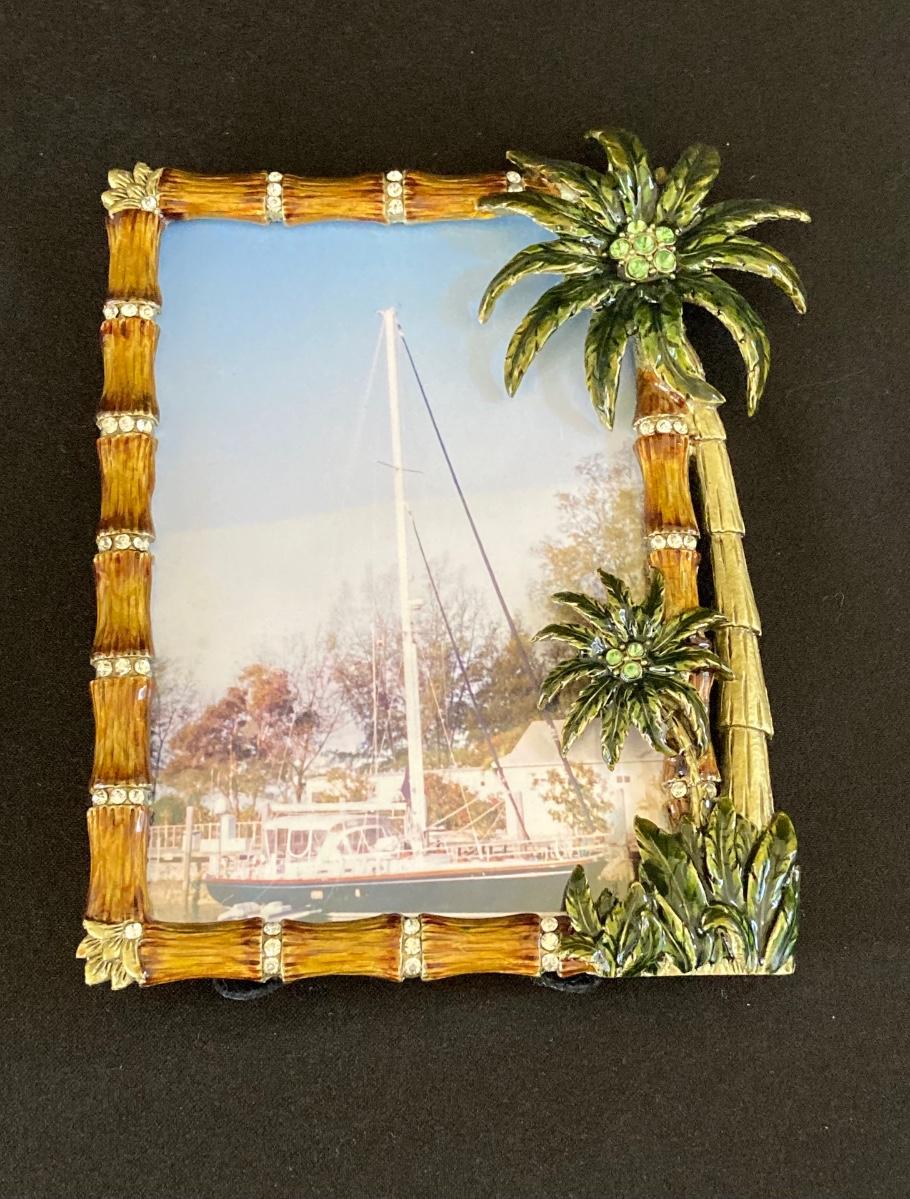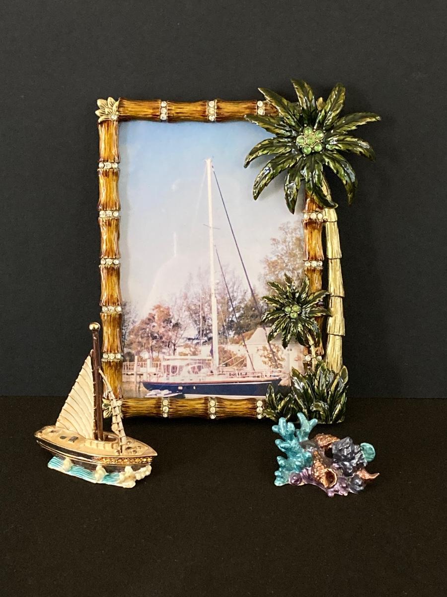 LOT 138: Jeweled Palm Tree Bamboo Picture Frame with Bejeweled Sailboat Trinket Box and Coral Reef