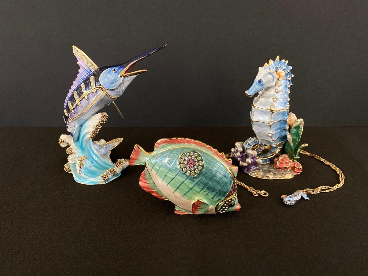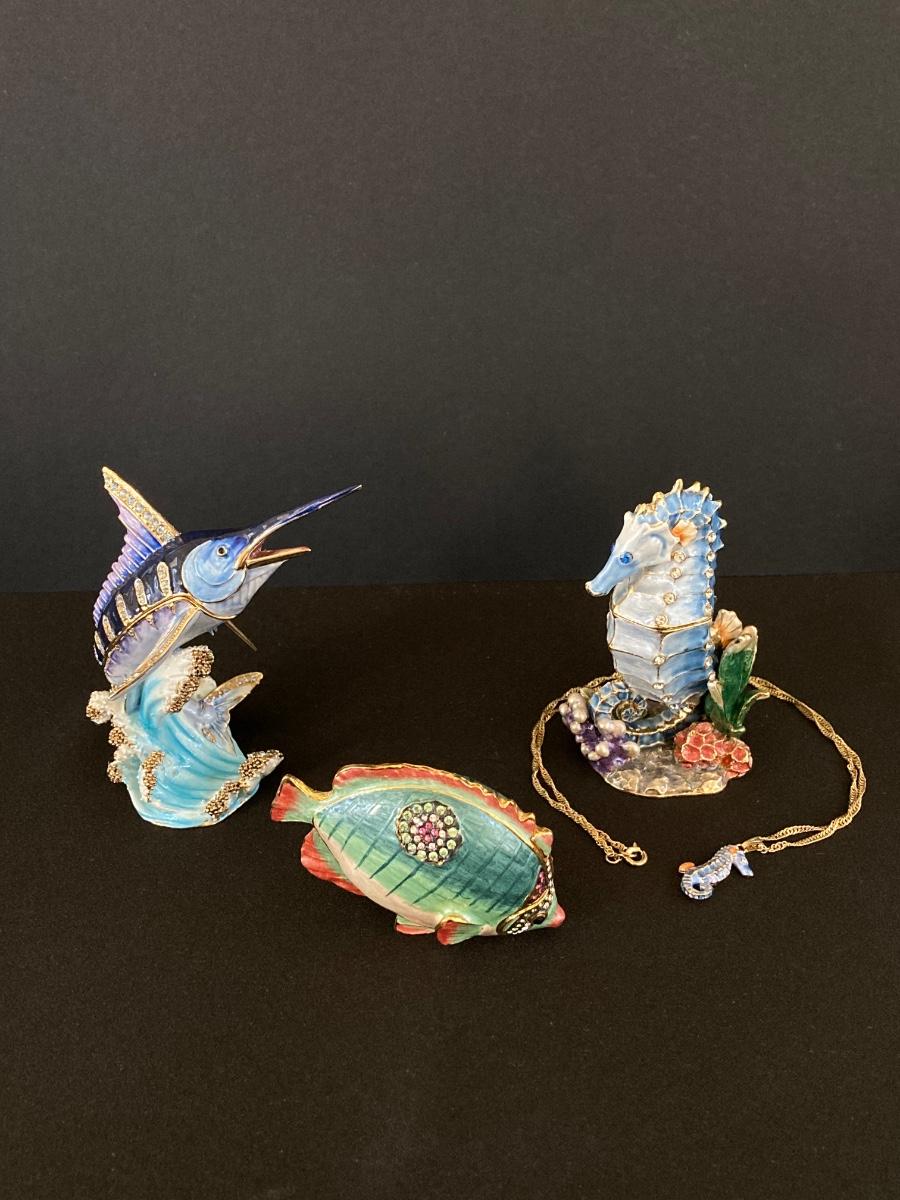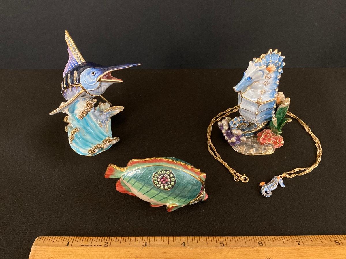 LOT 139: Bejeweled Sea Life Trinket Boxes - Marlin, Tropical Fish and Seahorse with Matching Necklace