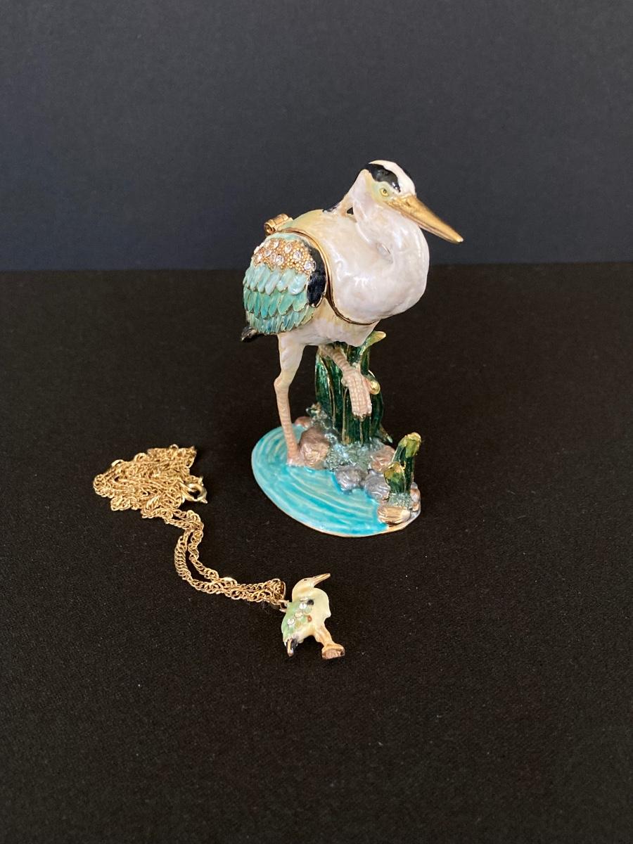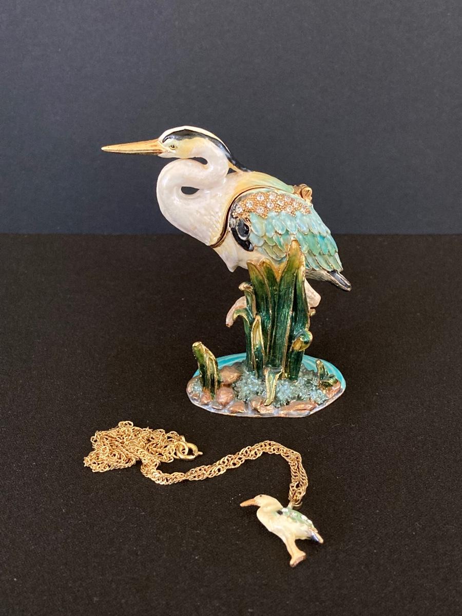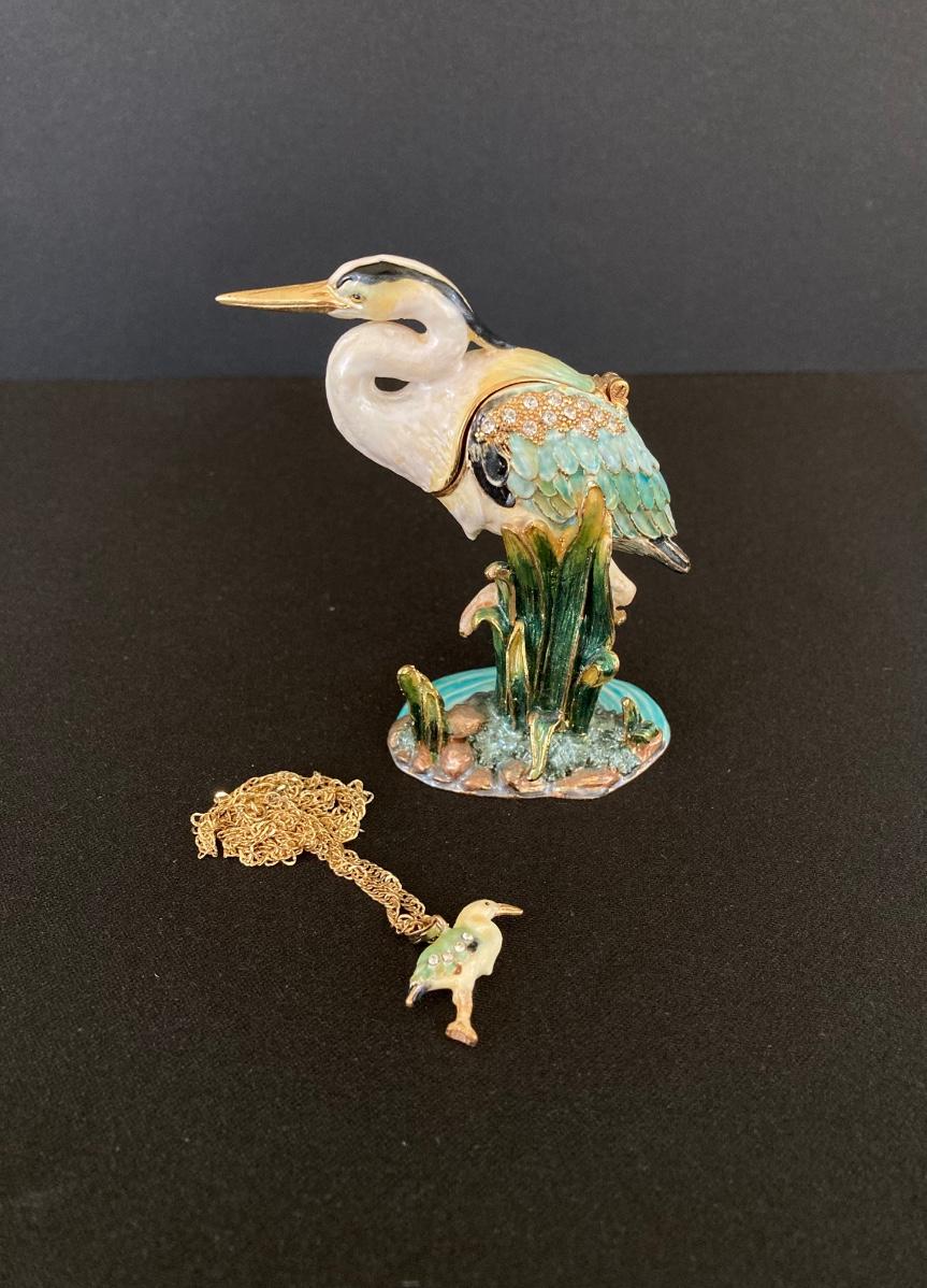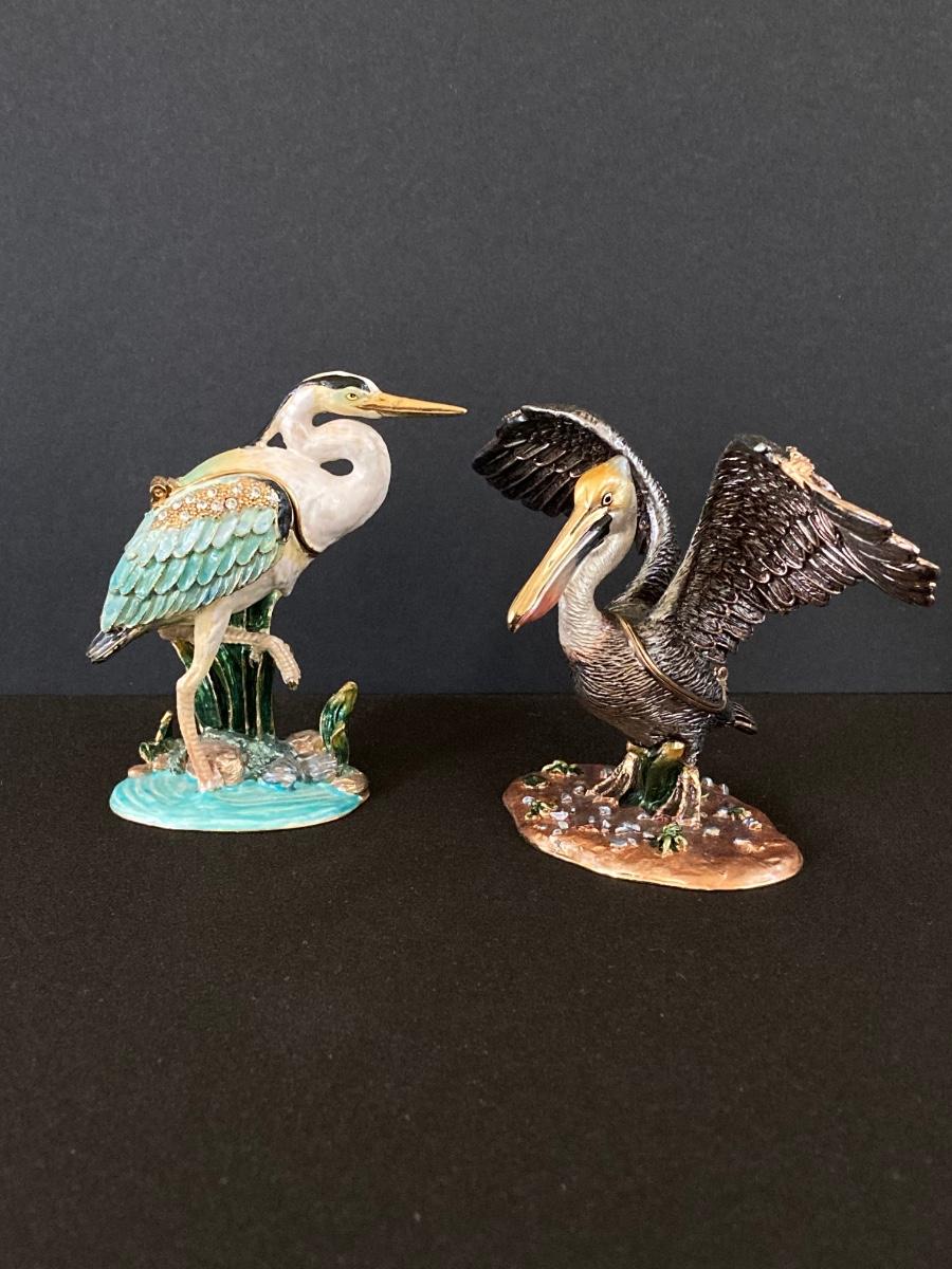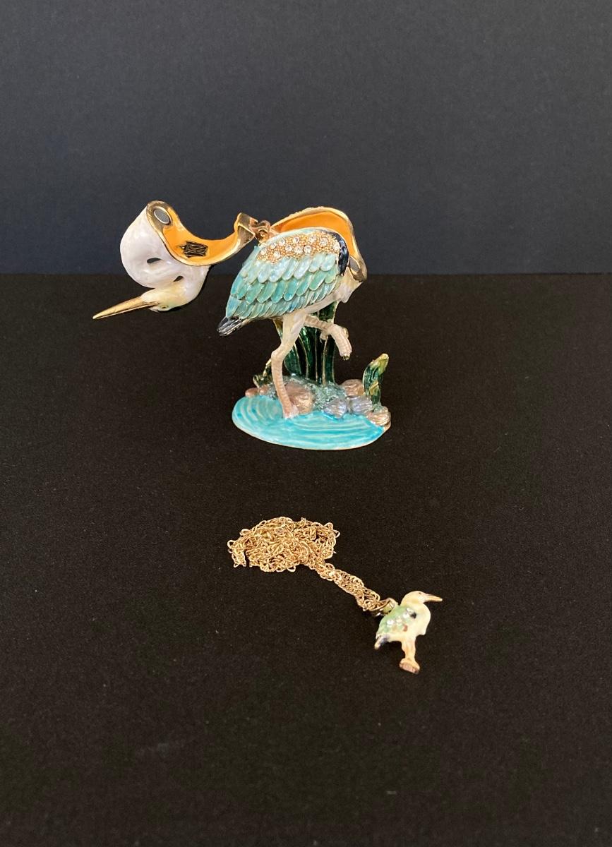 LOT 140: Tropical Bird Bejeweled Trinket Boxes - Pelican and White Heron with Matching Necklace