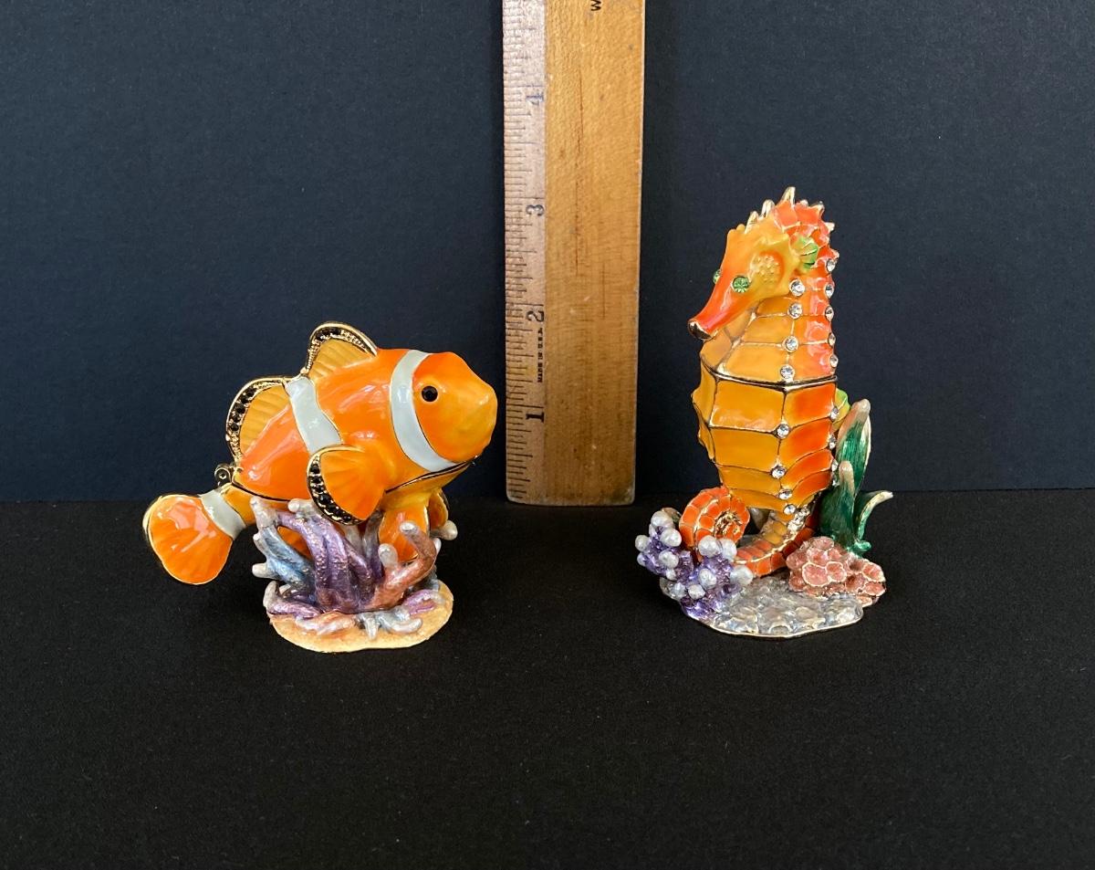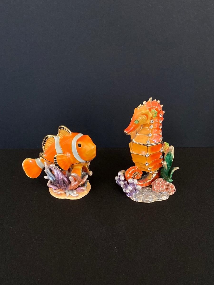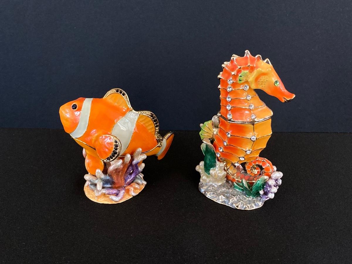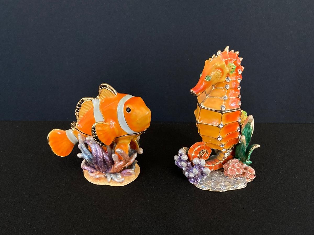 LOT 141: Bejeweled Hinged Trinket Boxes - Seahorse and Clownfish with Matching Necklace