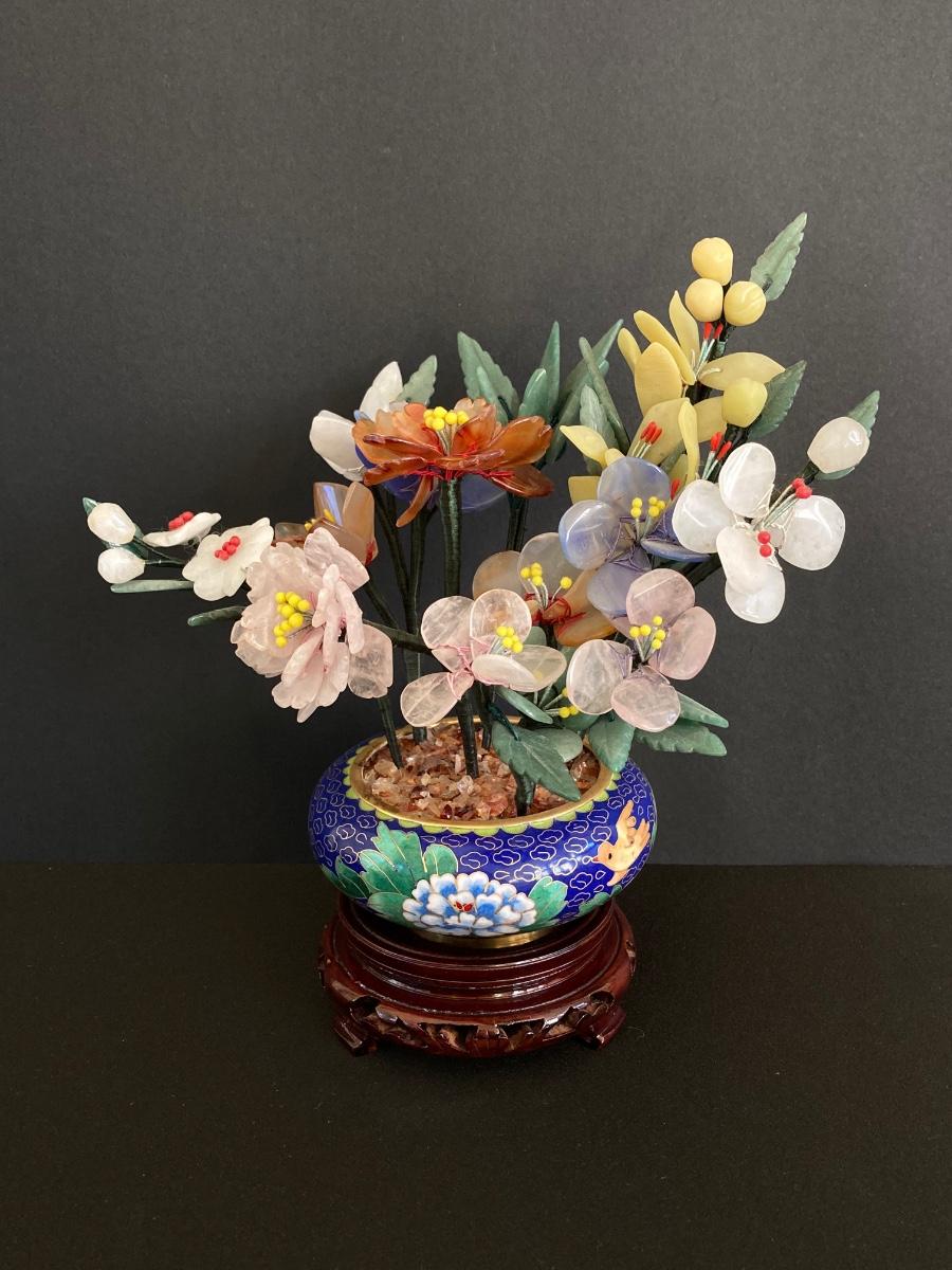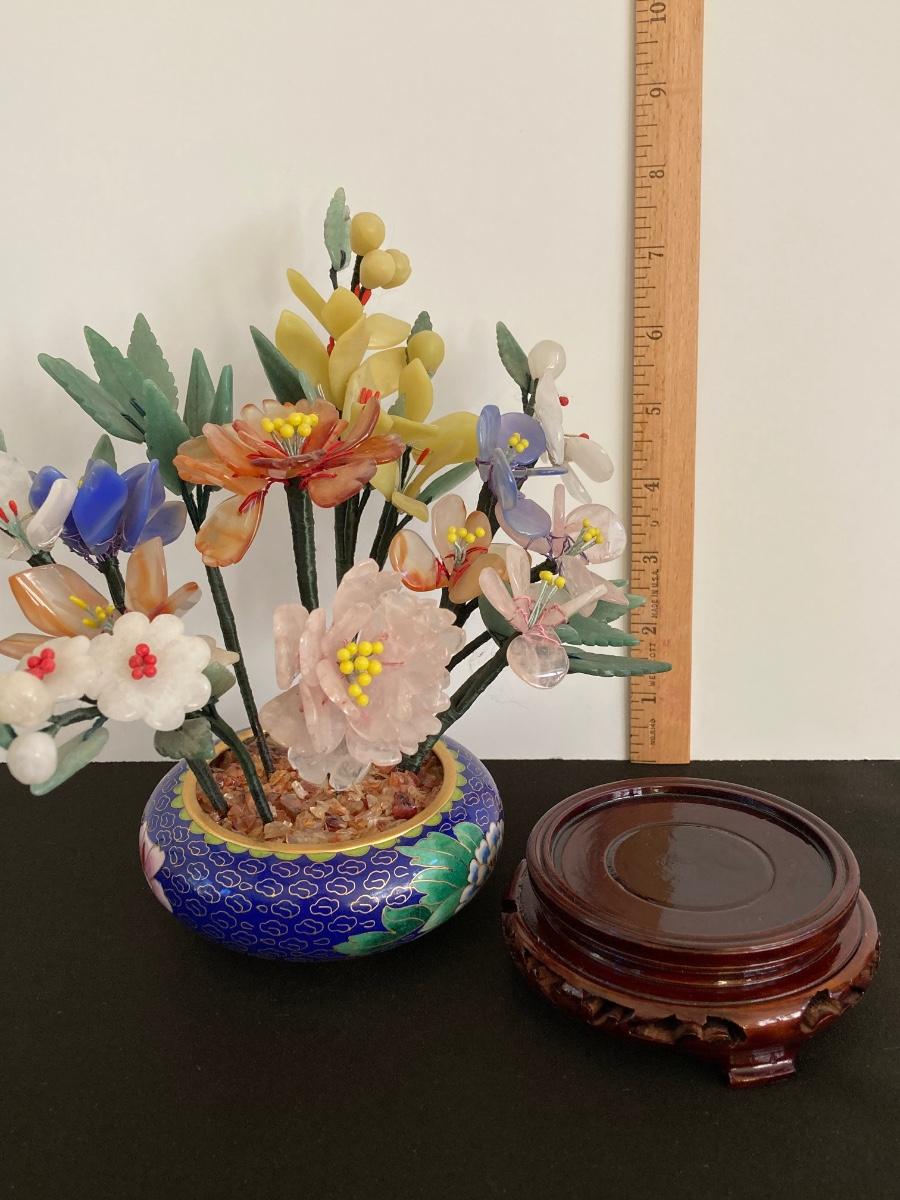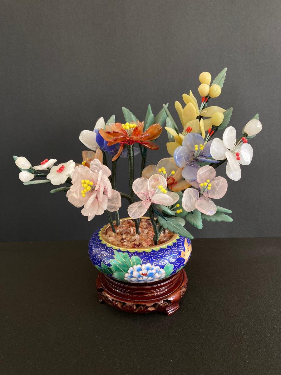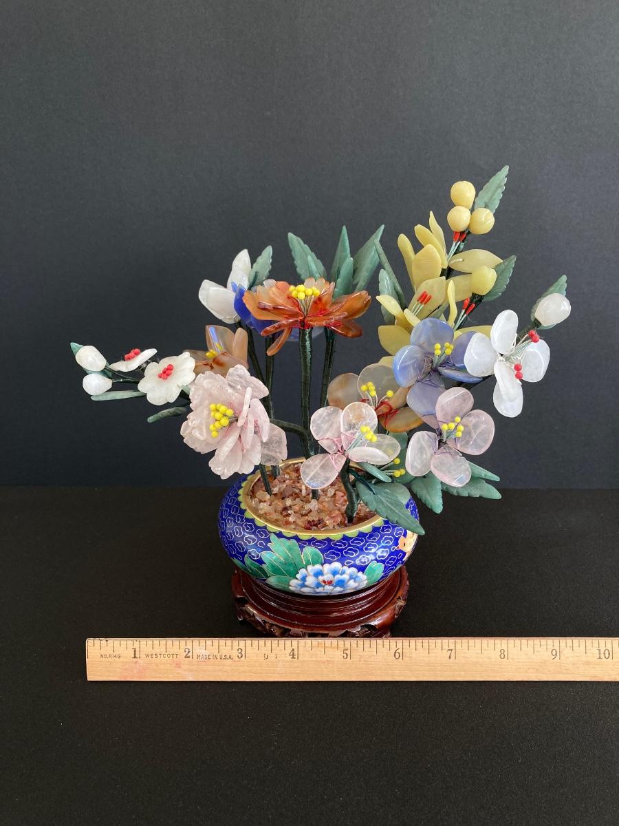 LOT 237: Vintage Quartz Stone Flowers in a Cloisonne Flower Pot