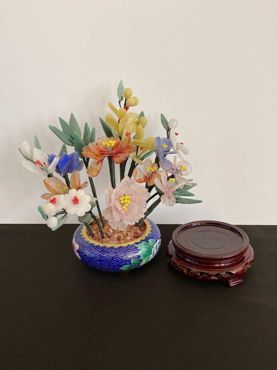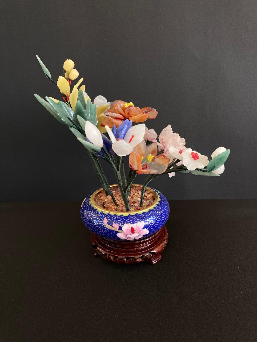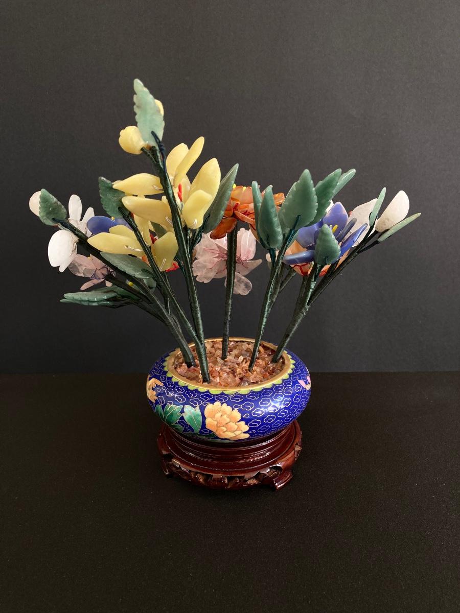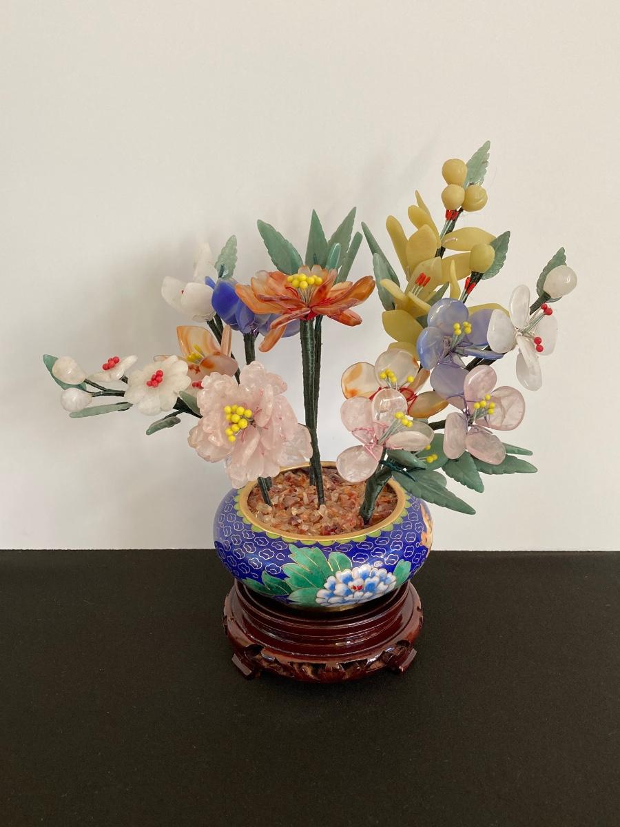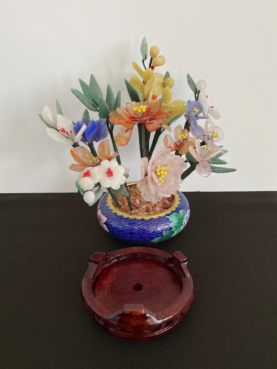 LOT 237: Vintage Quartz Stone Flowers in a Cloisonne Flower Pot