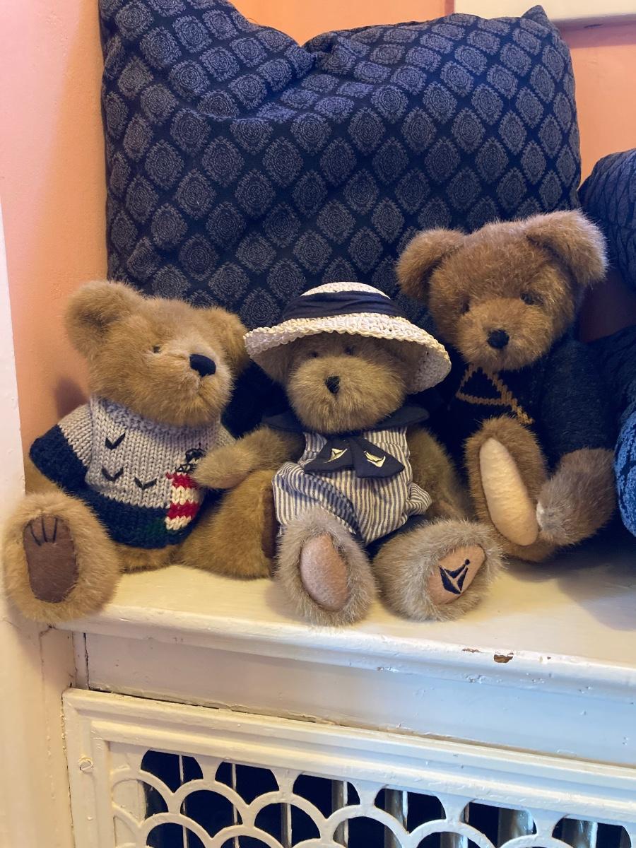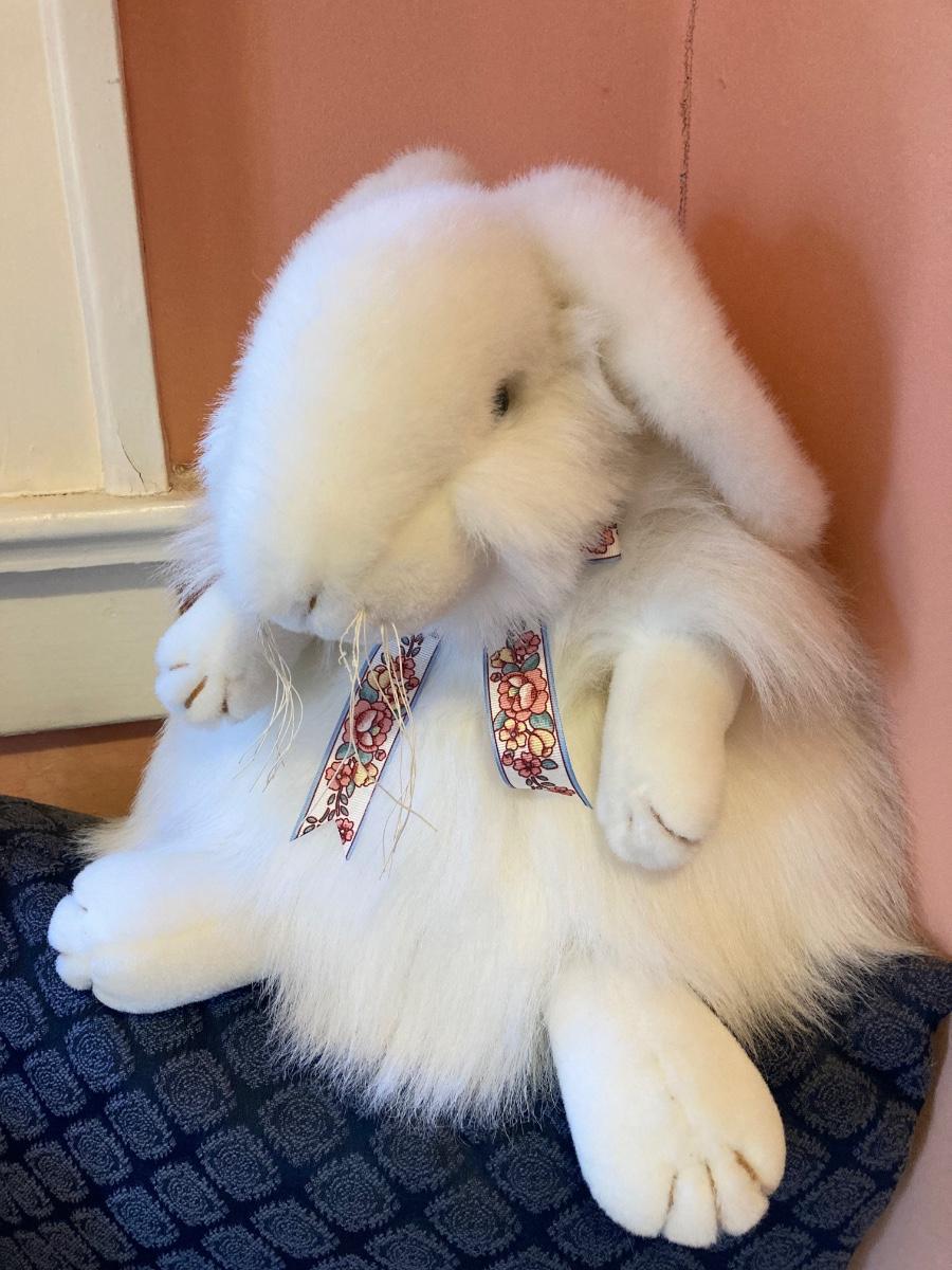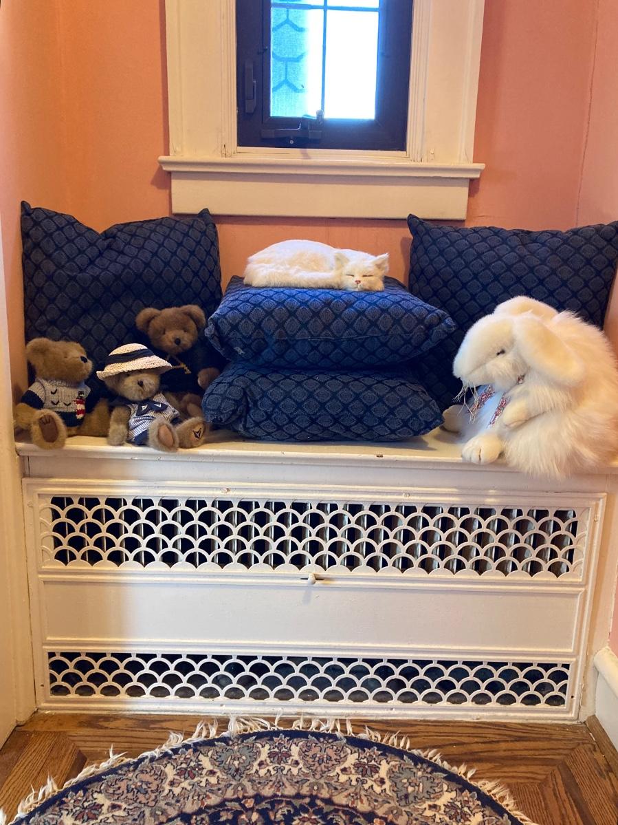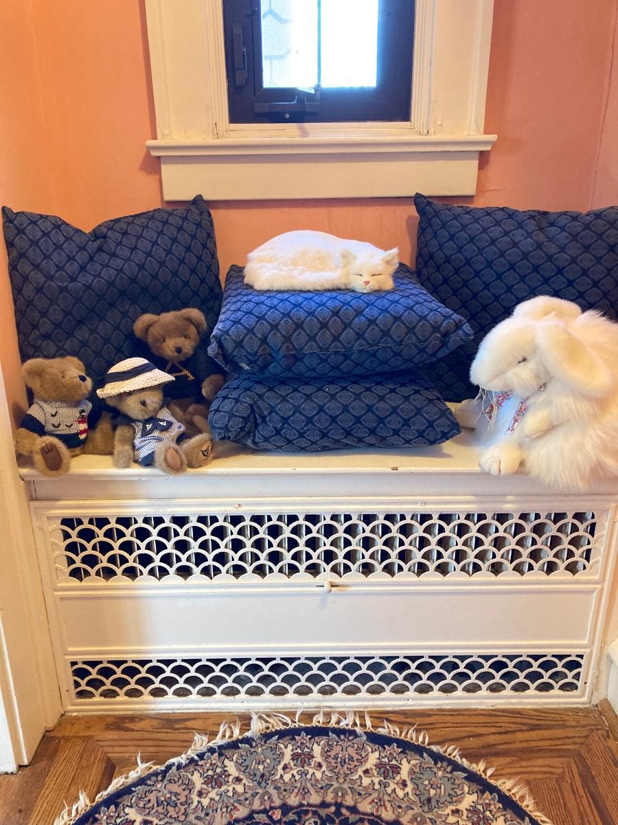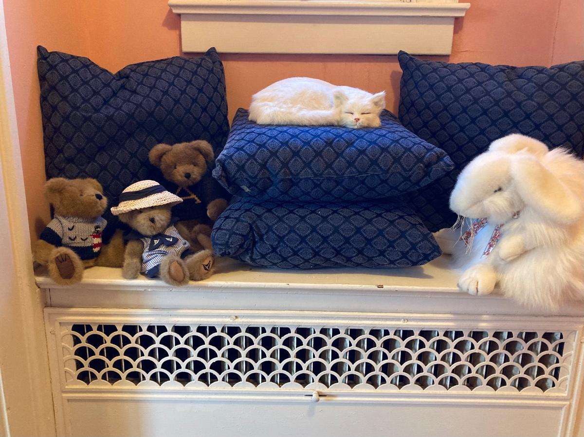 LOT 238: Boyd's Teddy Bears, Mary Meyer Bunny Rabbit, Cozy Sleeping Cat Figurine with Collection of Blue Accent Pillows