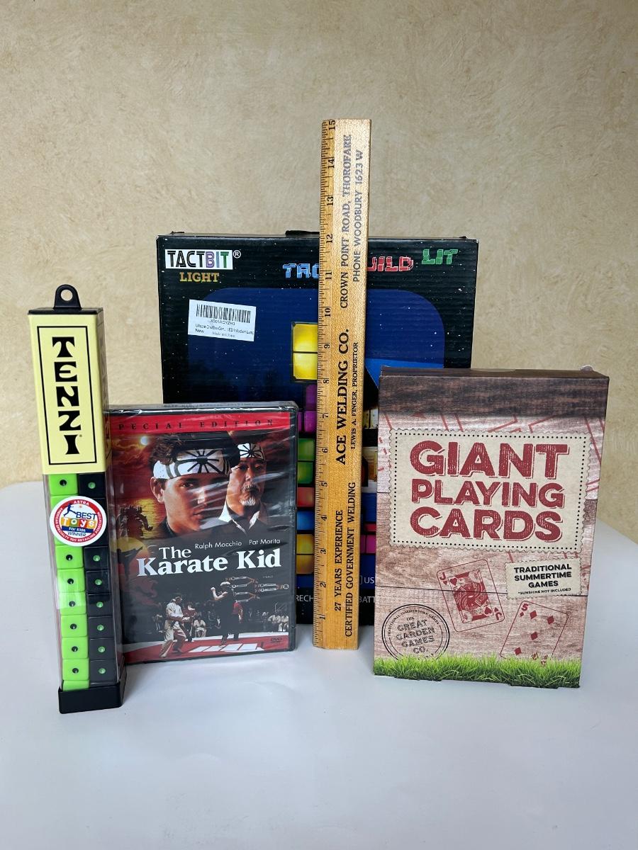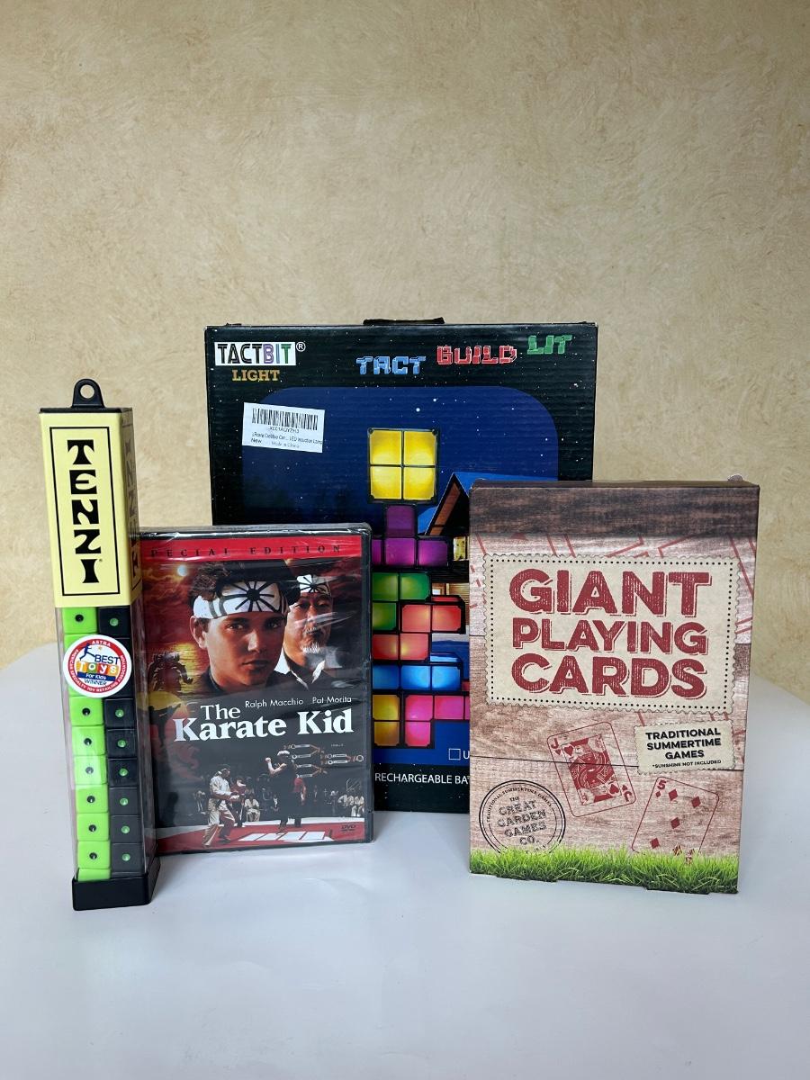 LOT 249B: Tacbit Building Blocks, Giant Playing Cards, Tenzi Dice Game And The Karate Kid DVD