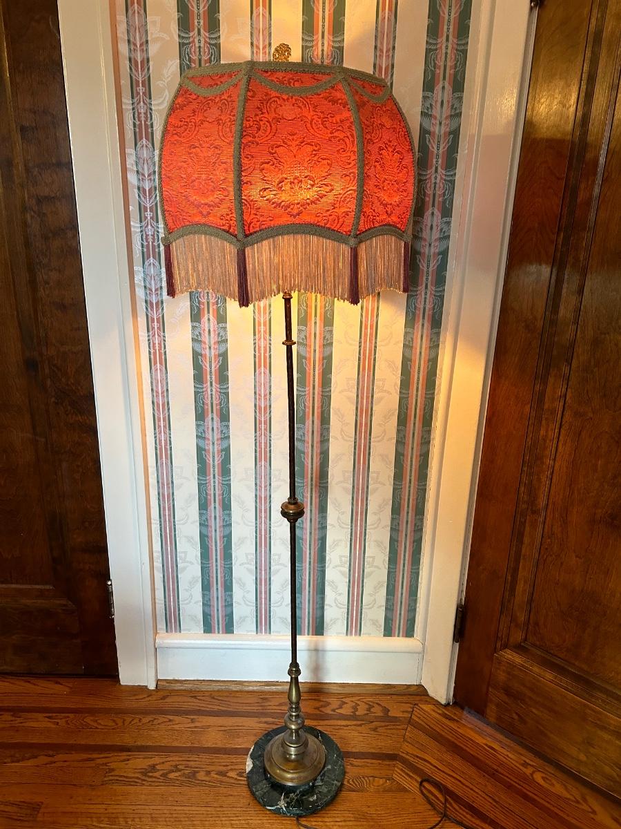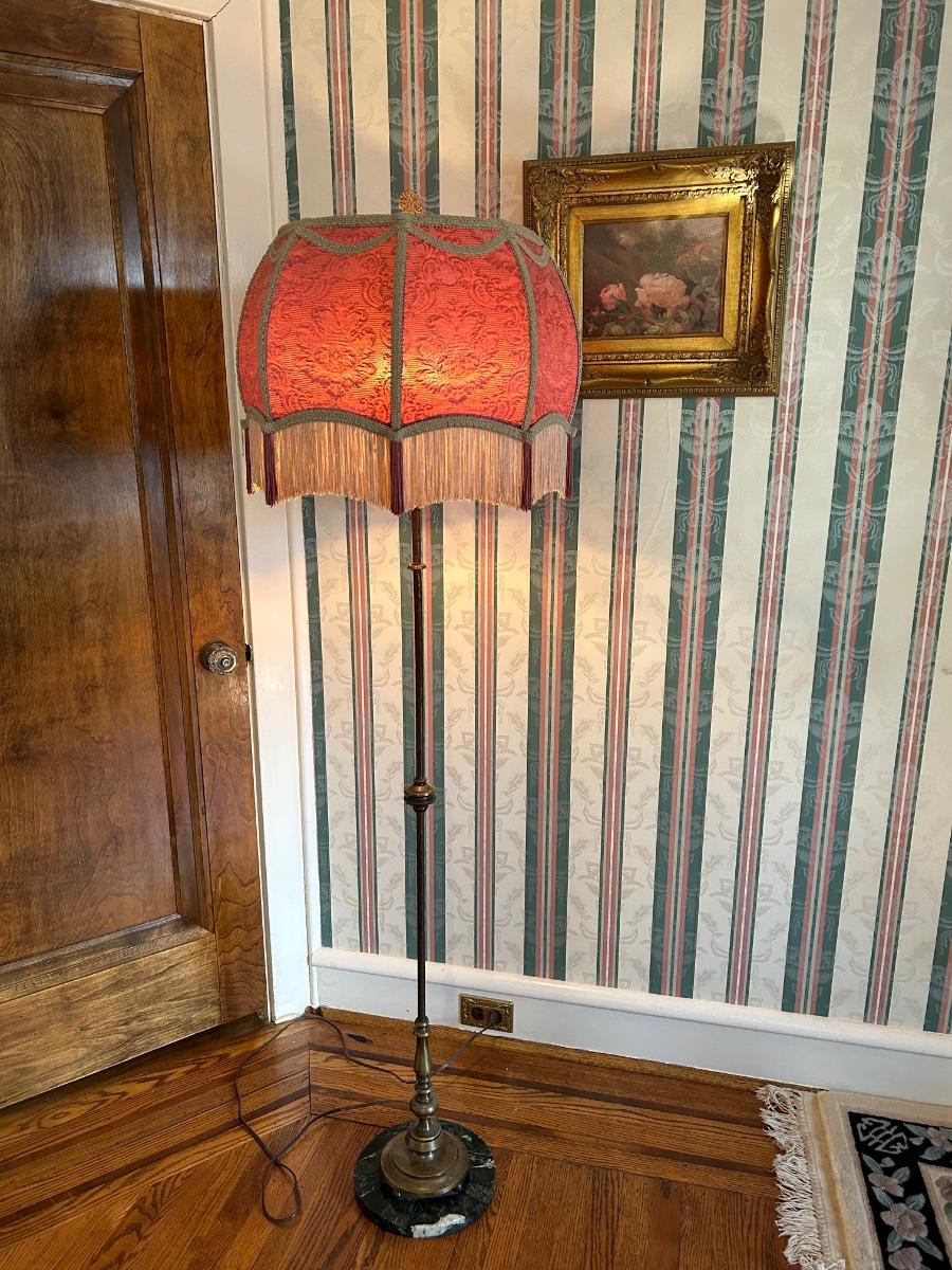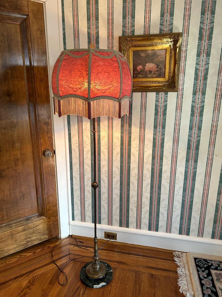 LOT 263: Marble Base Floor Lamp w/Fringed Lamp Shade, Floral Prints