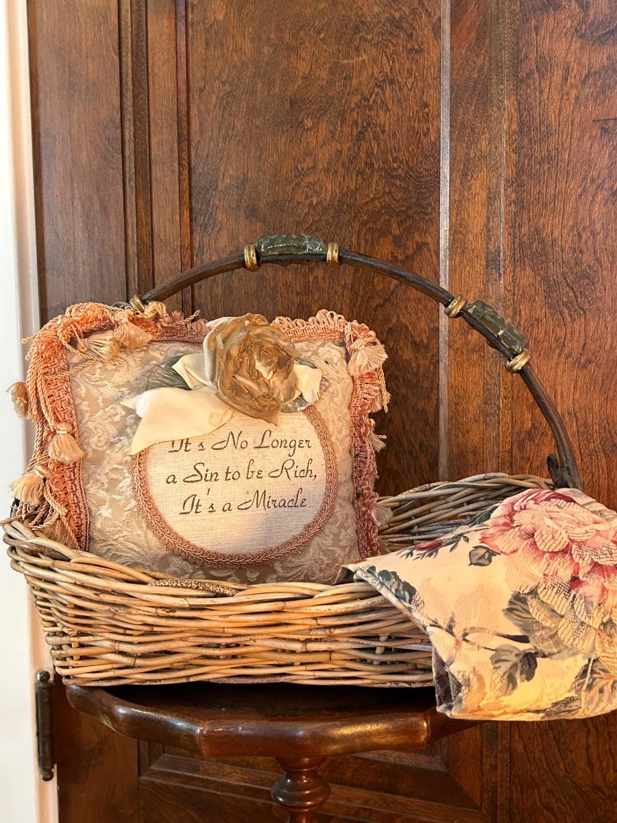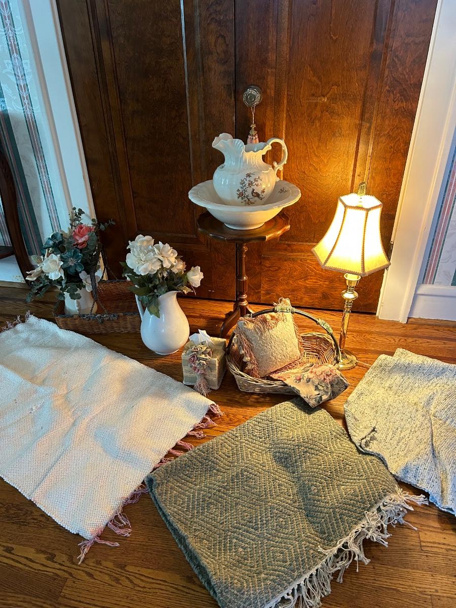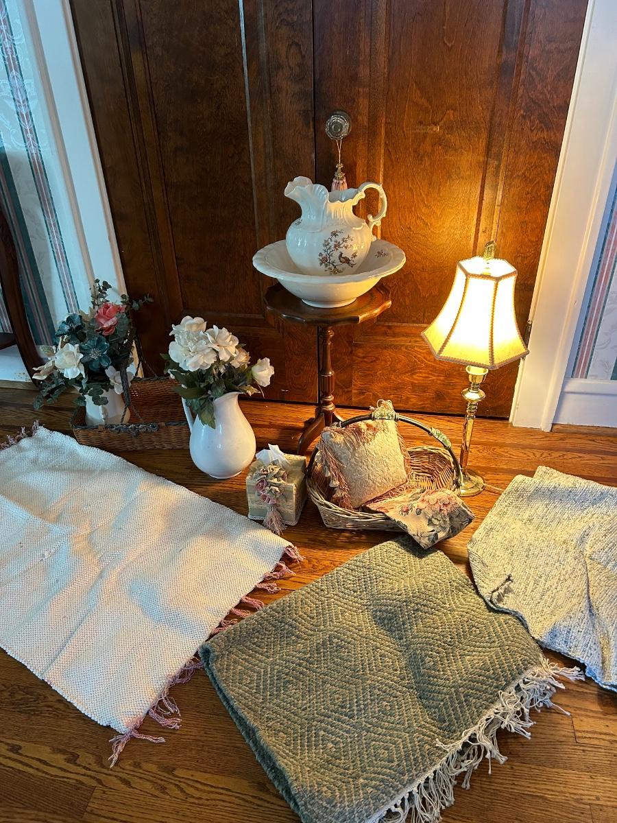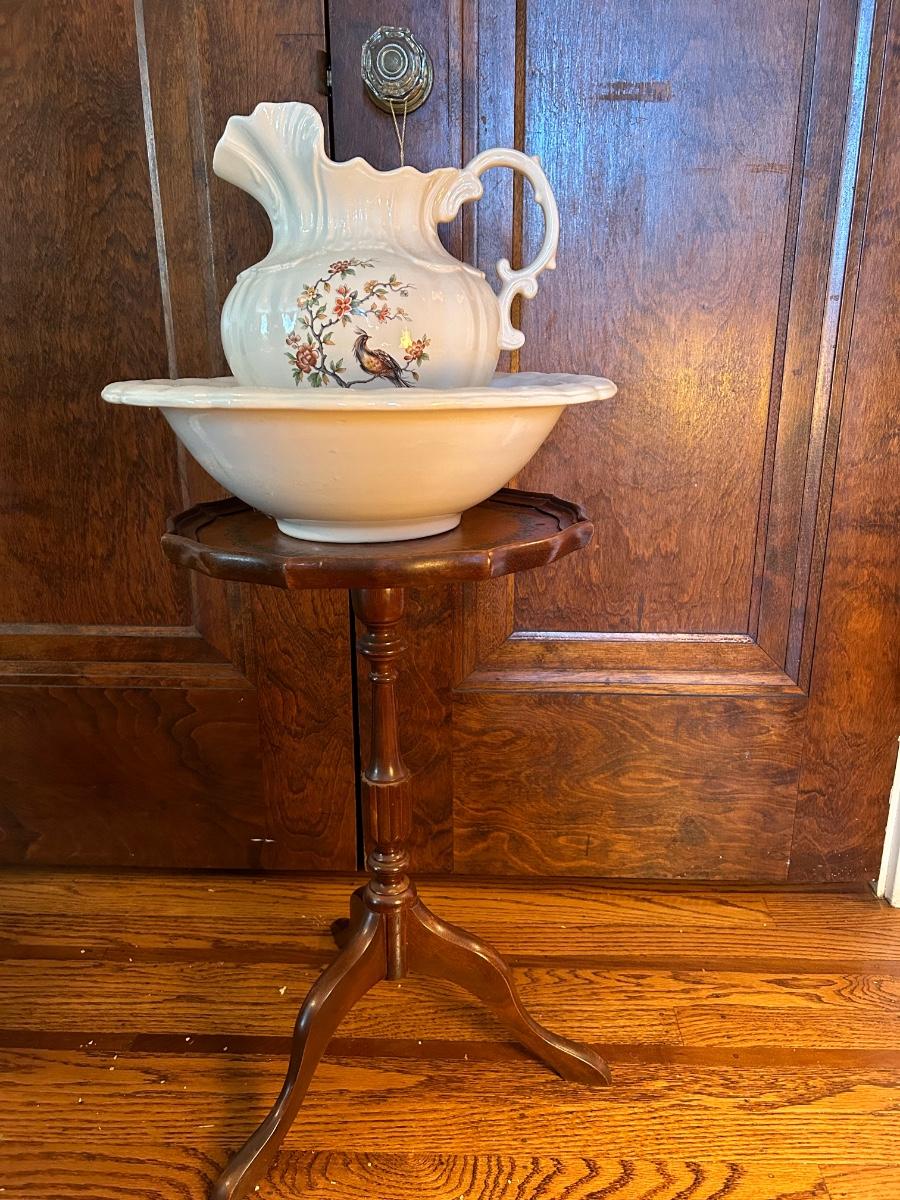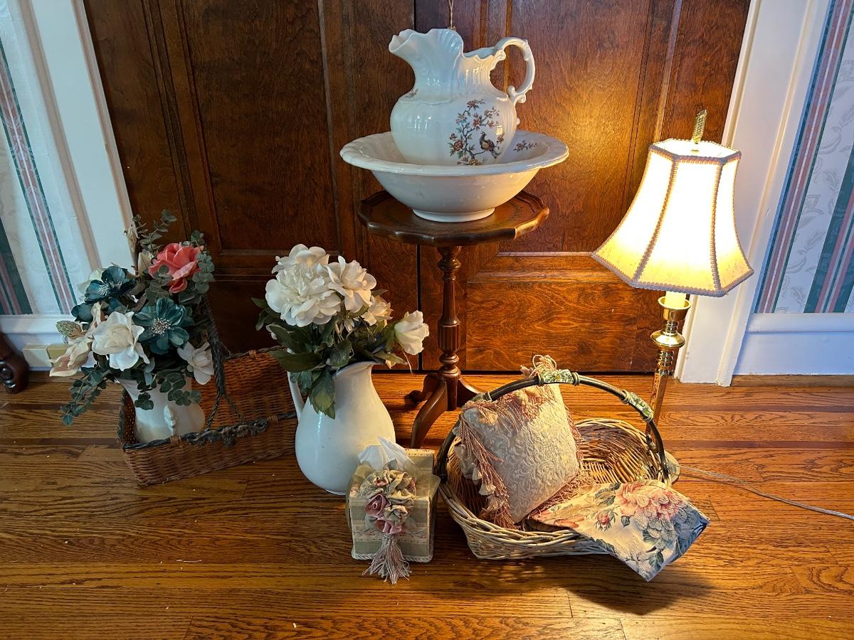 LOT 265BR: Home Decor Lot - Victorian Lamp, Hand Painted Pitcher, Plant Stand, Baskets, Rugs And More