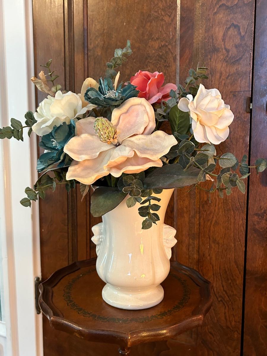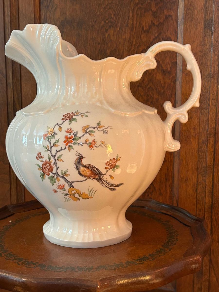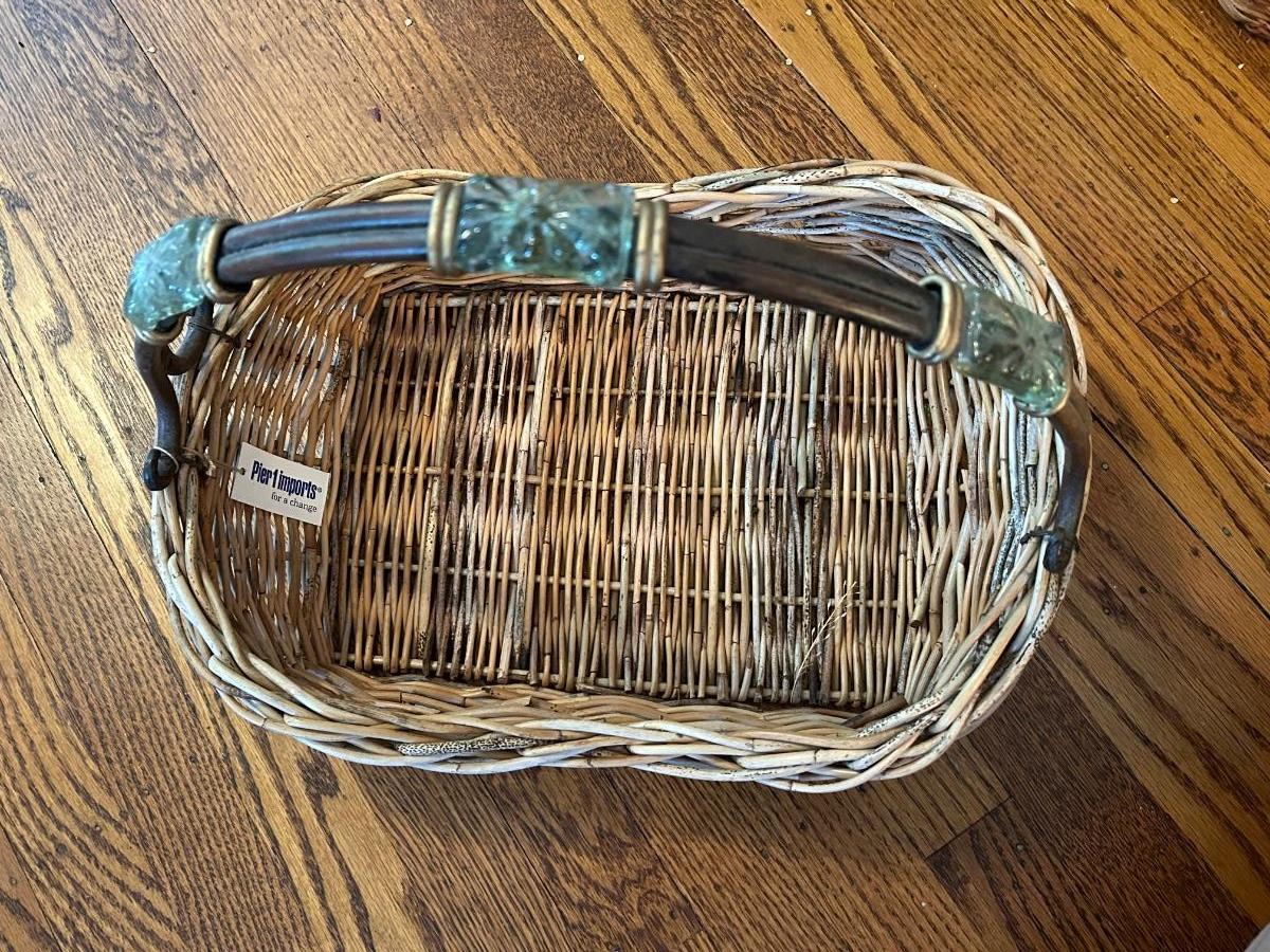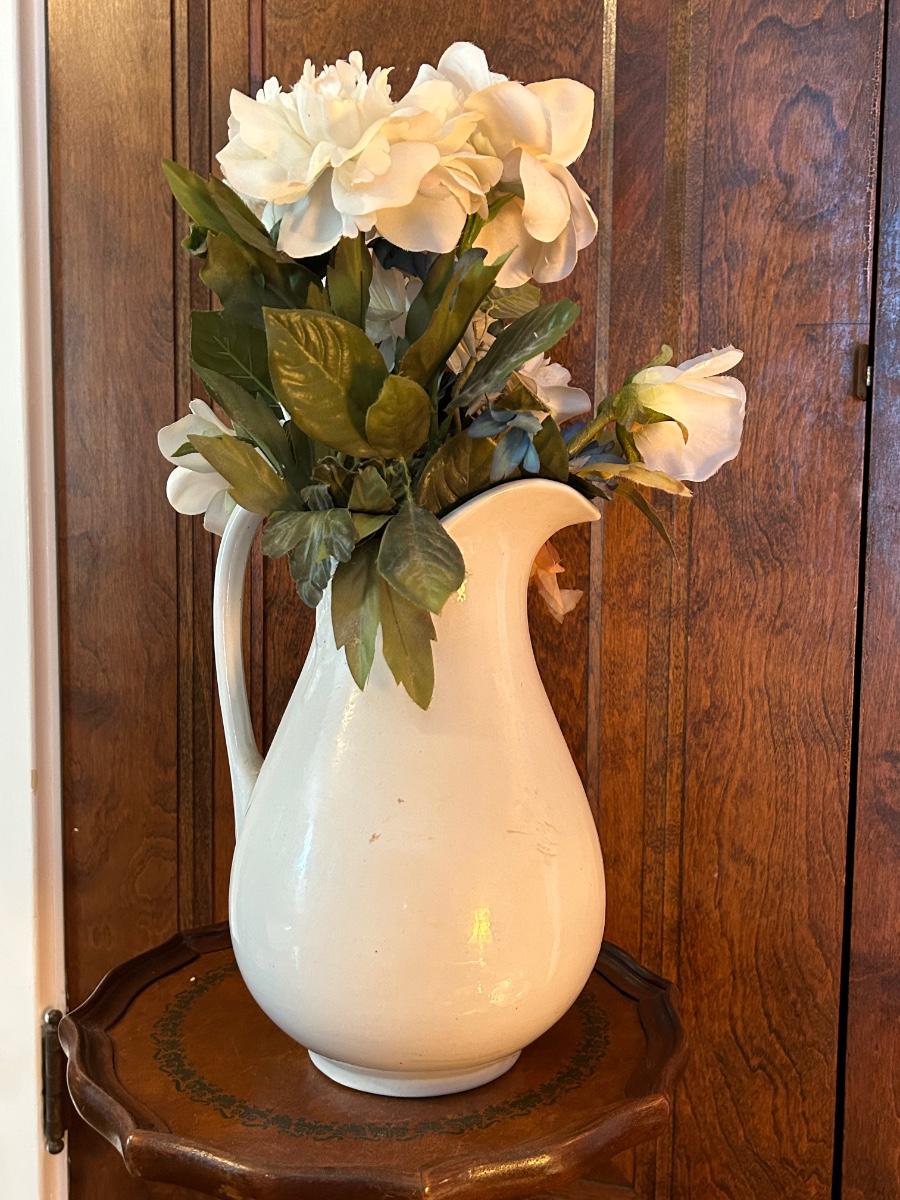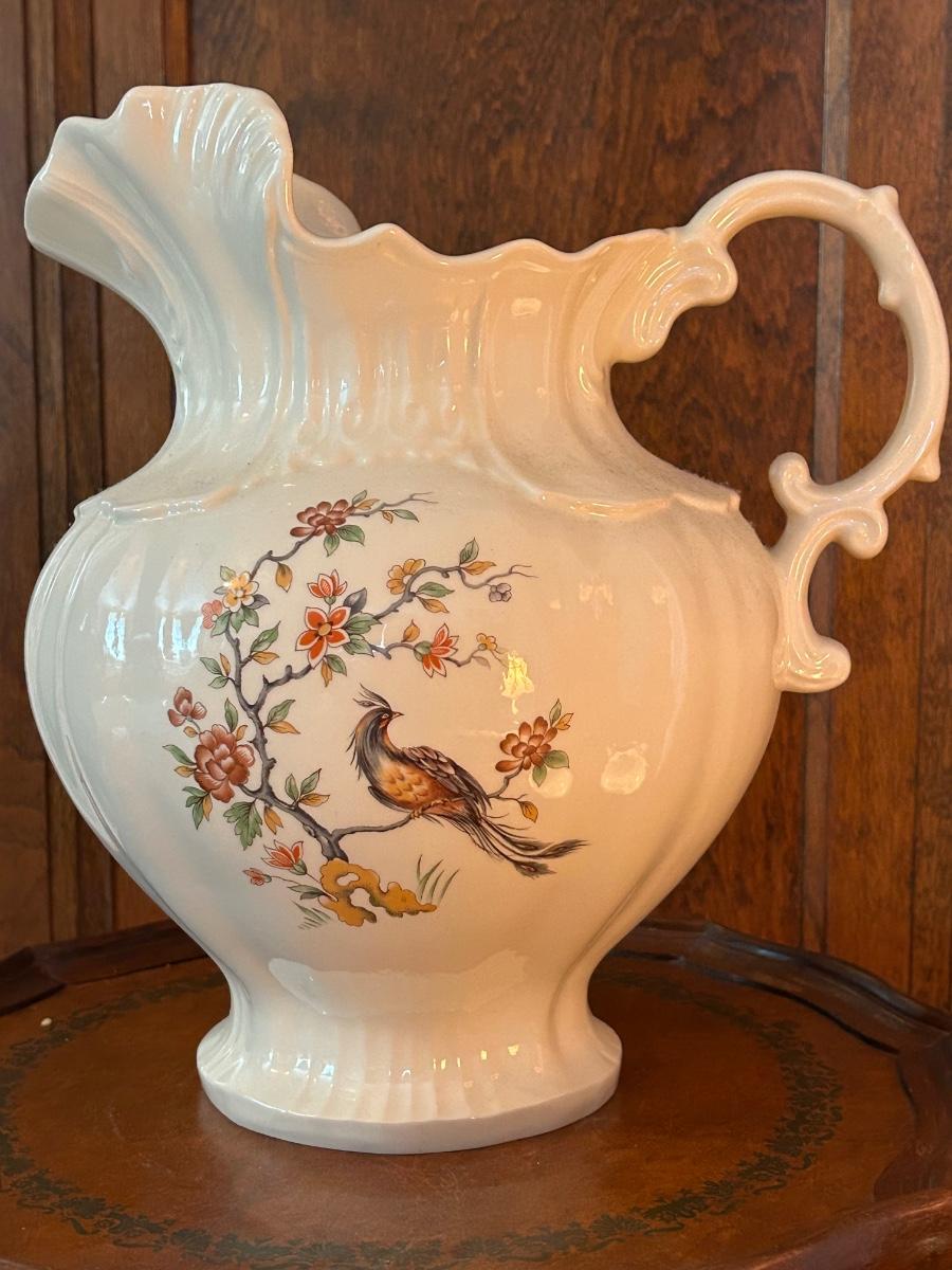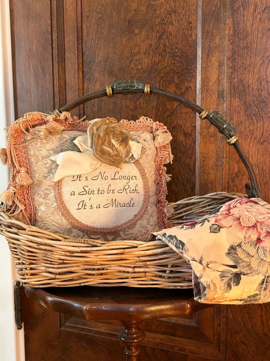 LOT 265BR: Home Decor Lot - Victorian Lamp, Hand Painted Pitcher, Plant Stand, Baskets, Rugs And More