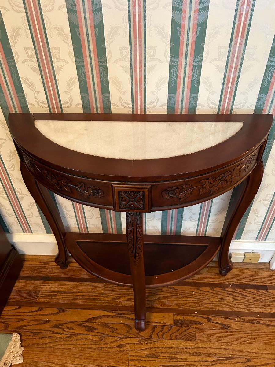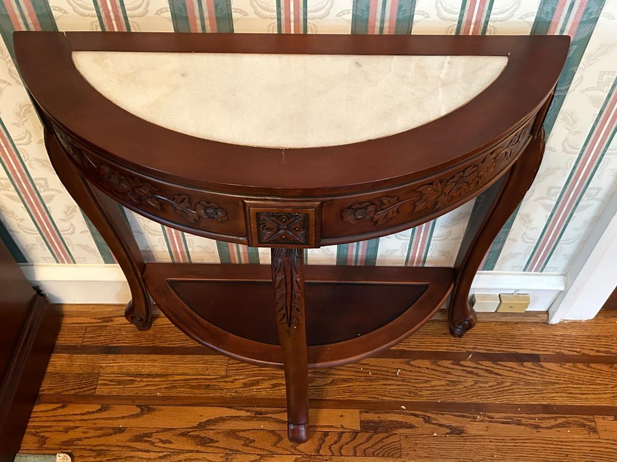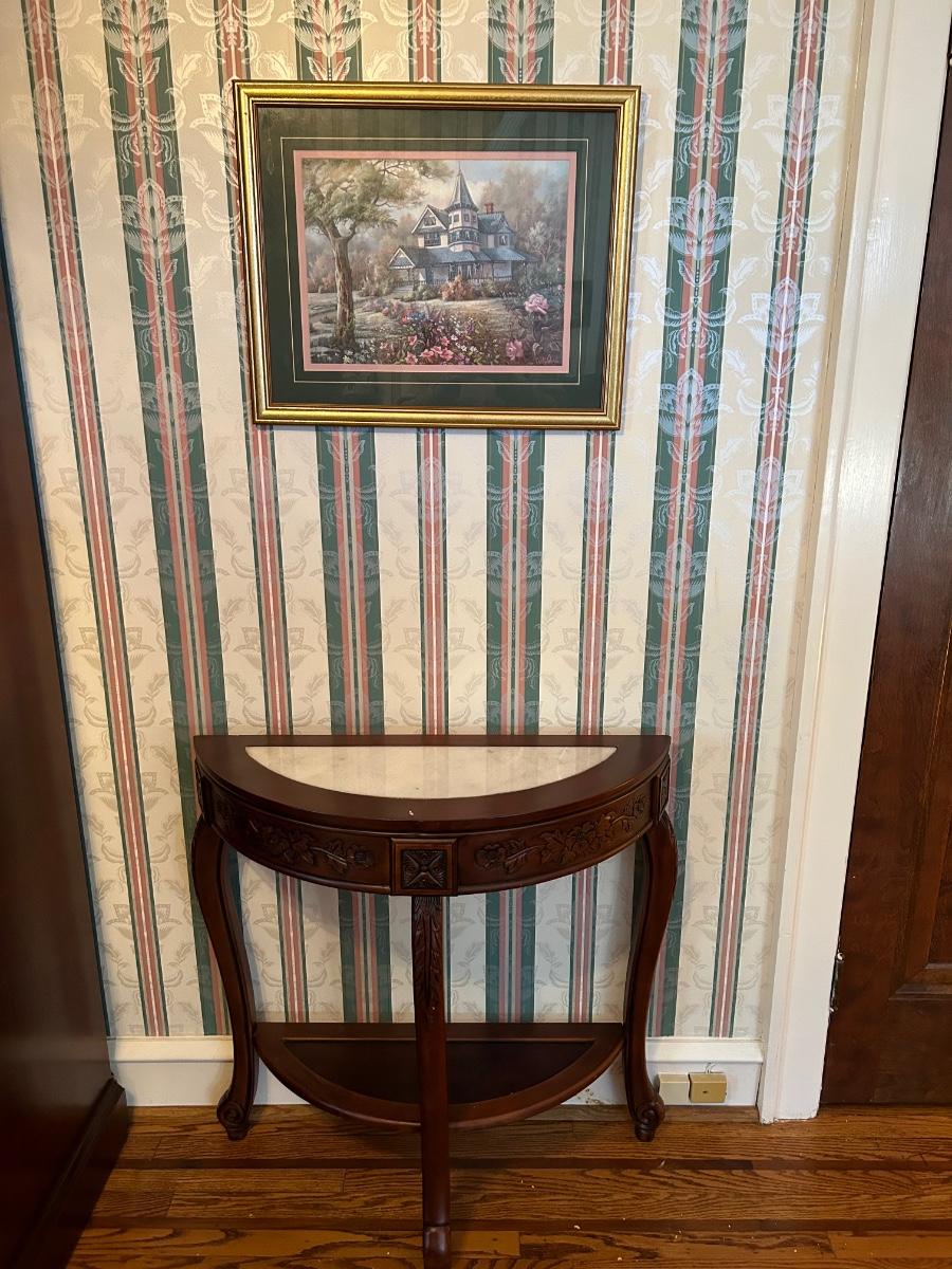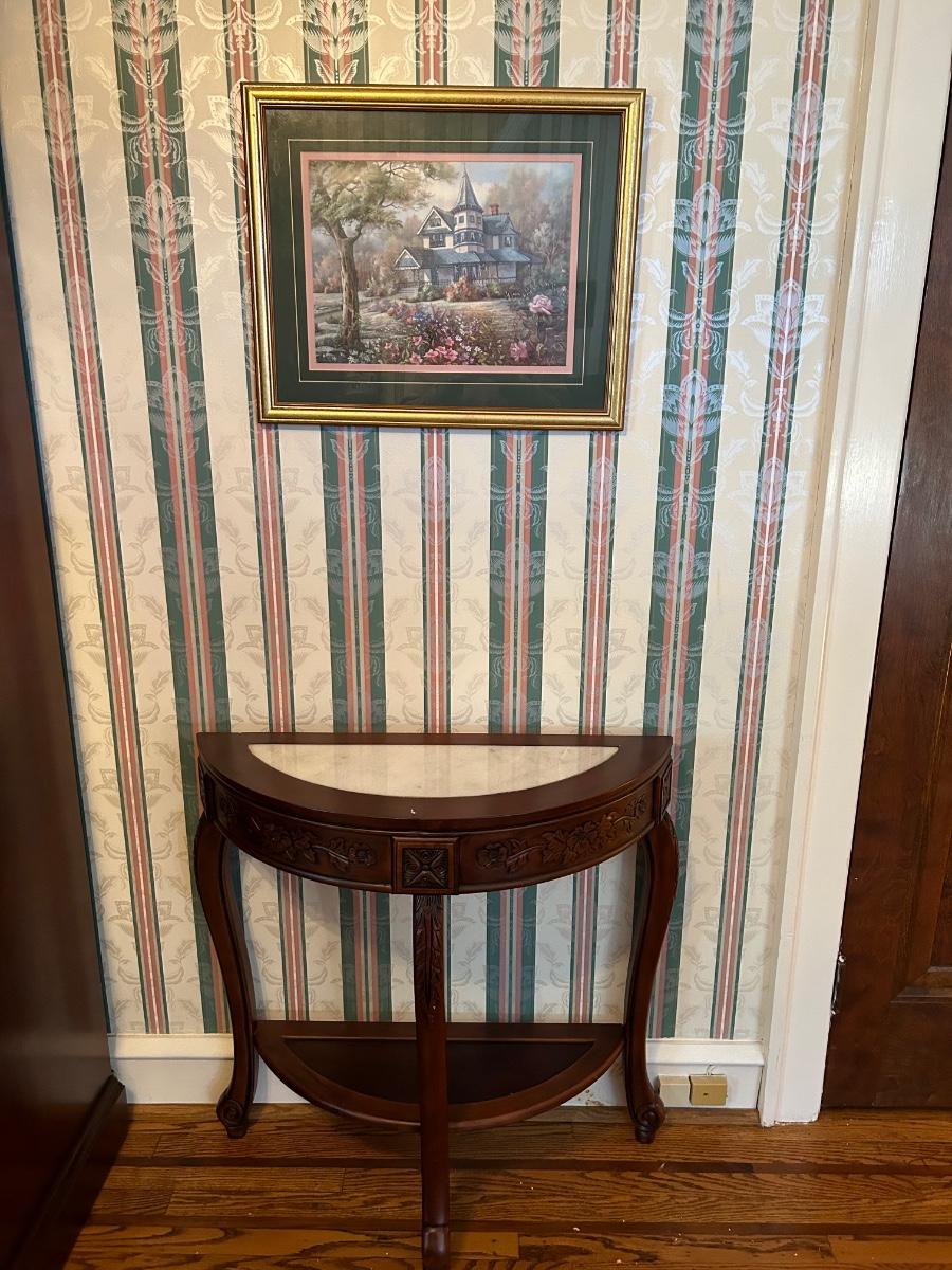 LOT 266BR: Wood Table With Marble Top And Framed Print Entitled “The Misty Rose”