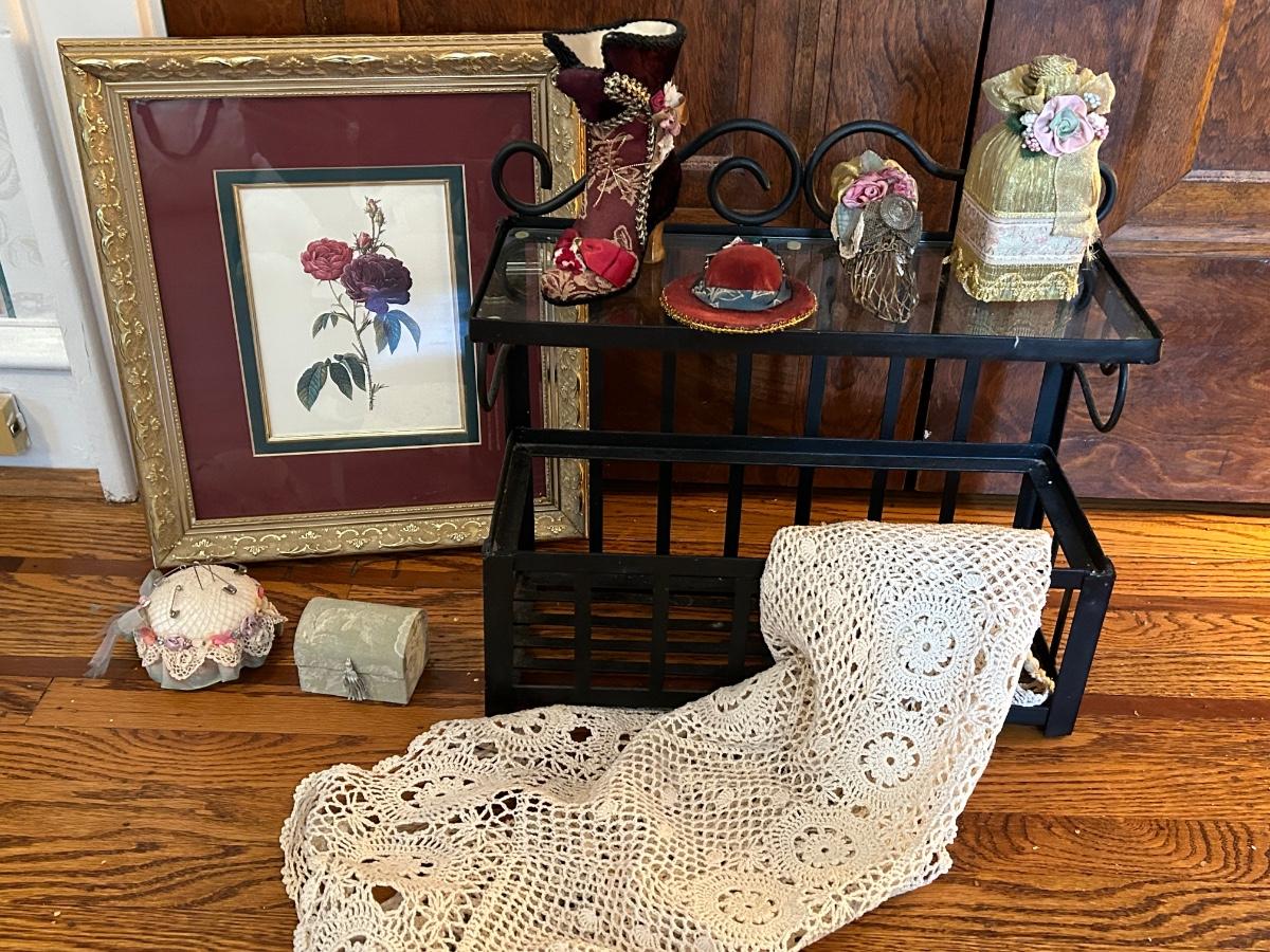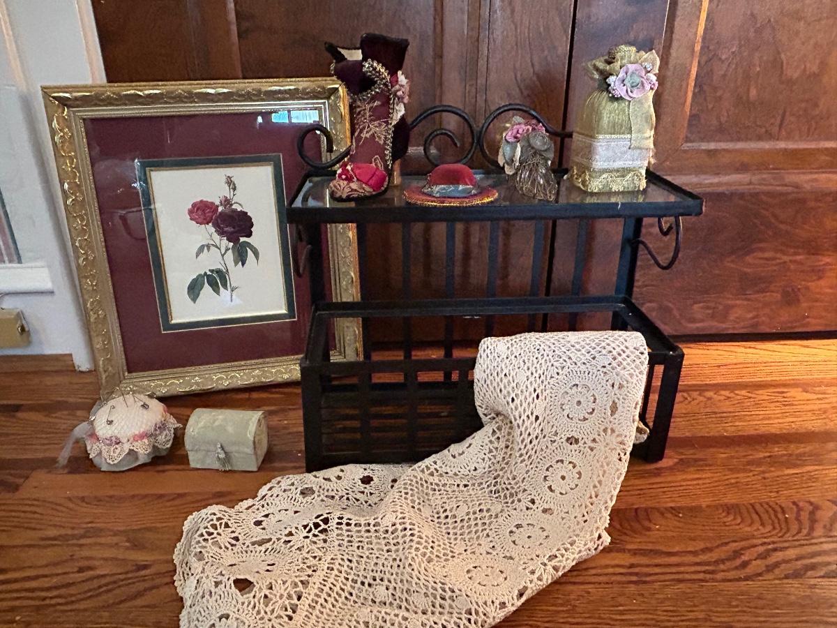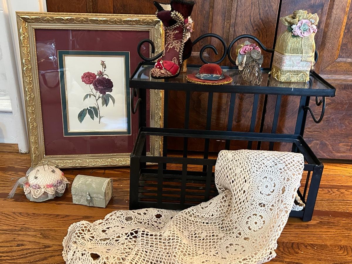 LOT 267BR: Home Accent Collection- Metal And Glass Shelf, Framed Rose Print And Victorian accents