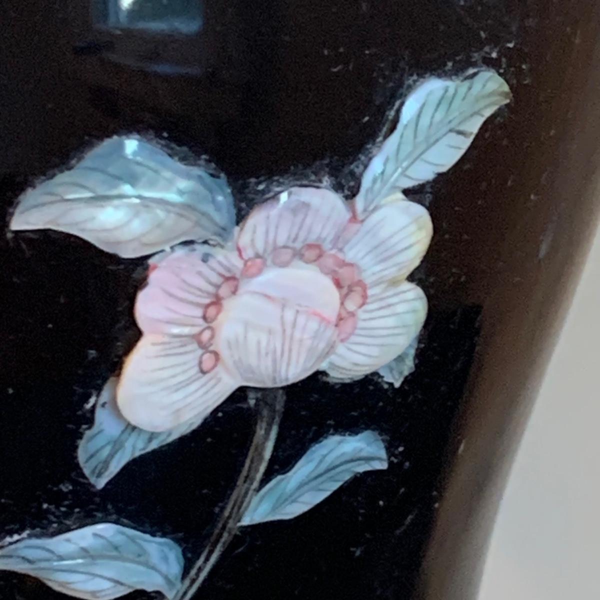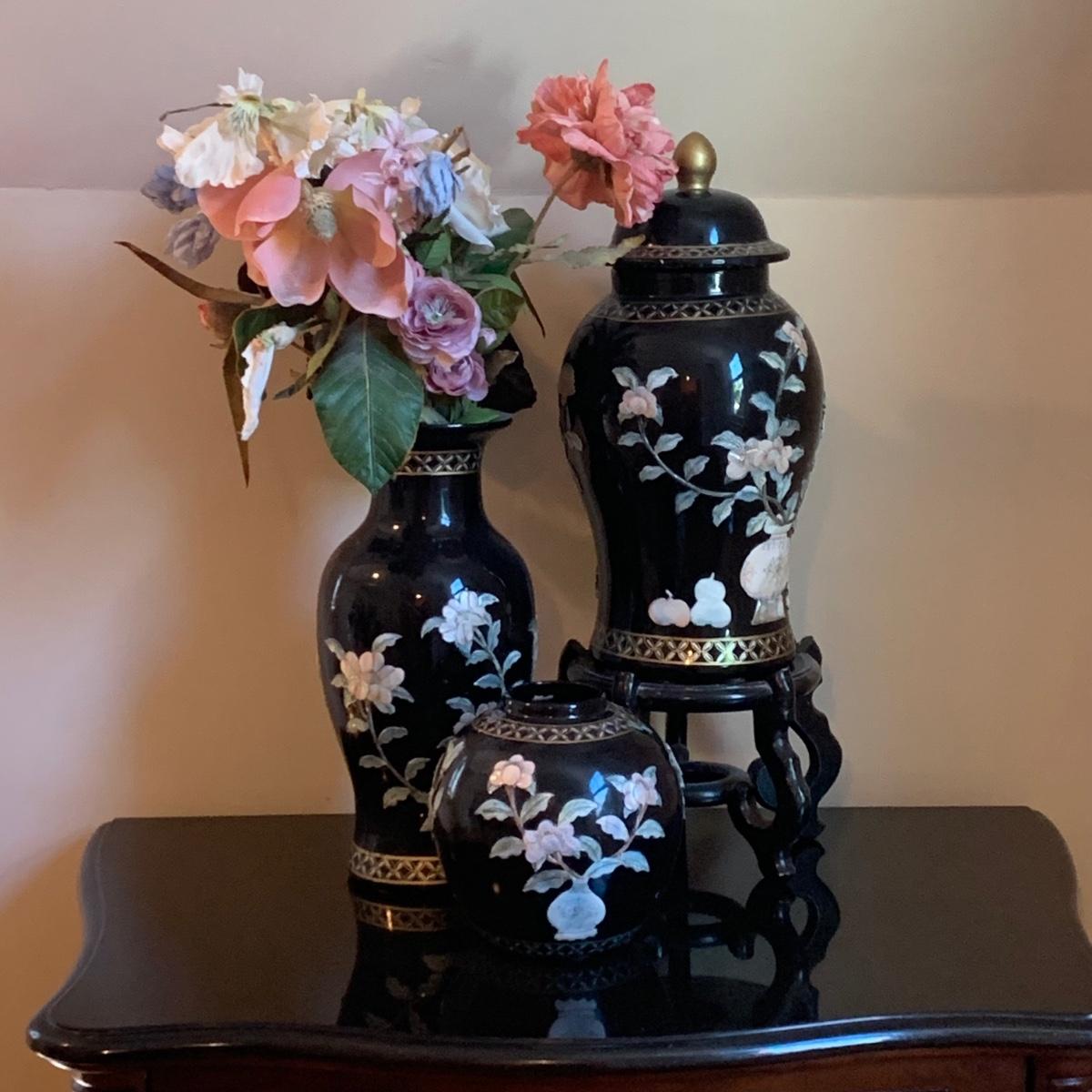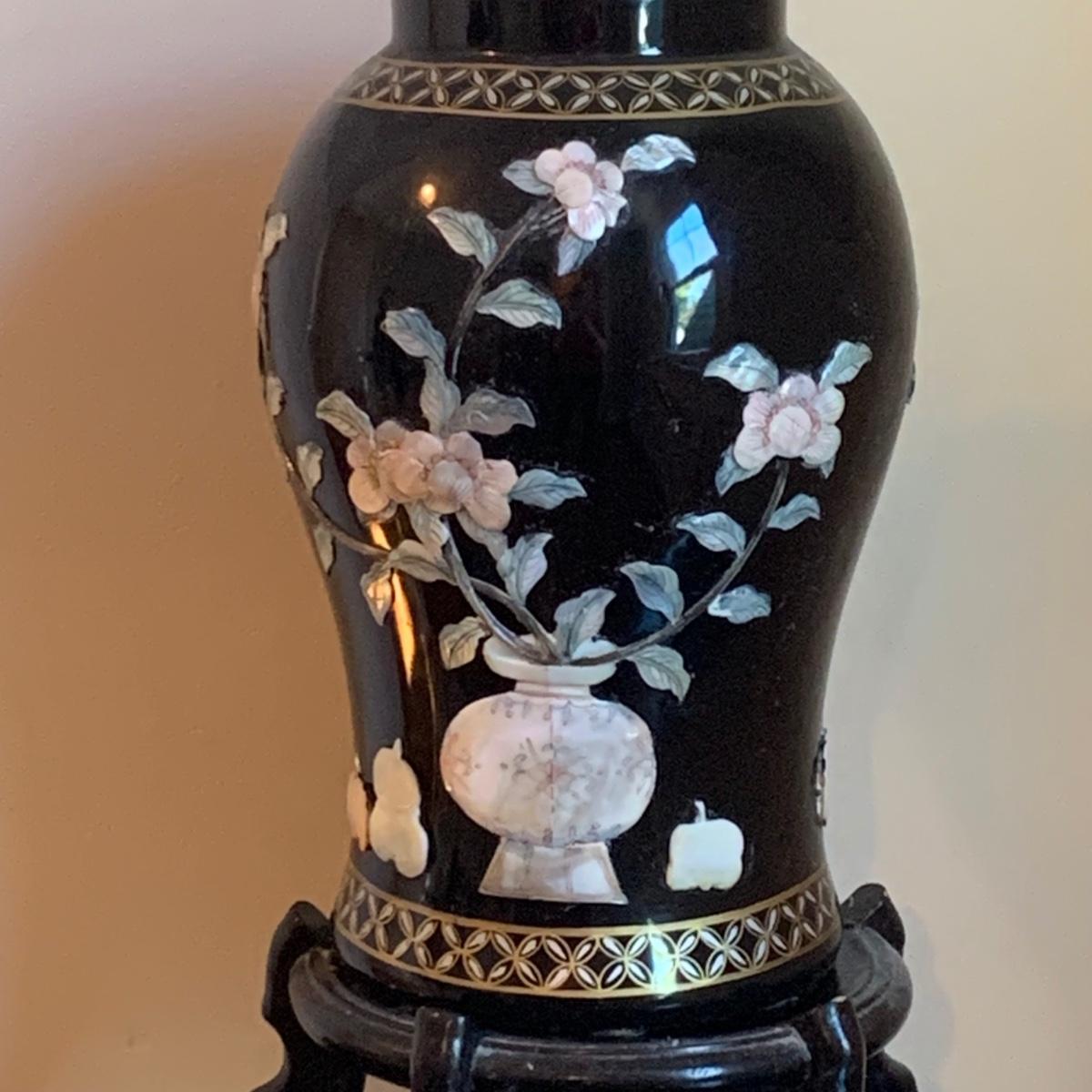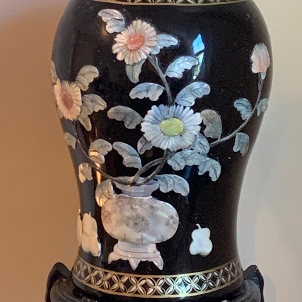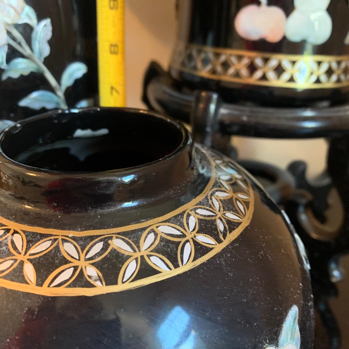 LOT 282: Vintage Pottery Vases with Mother of Pearl Floral Motif
