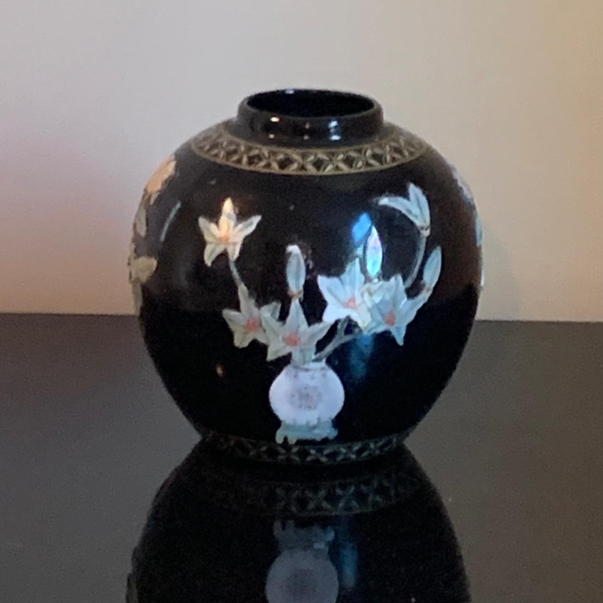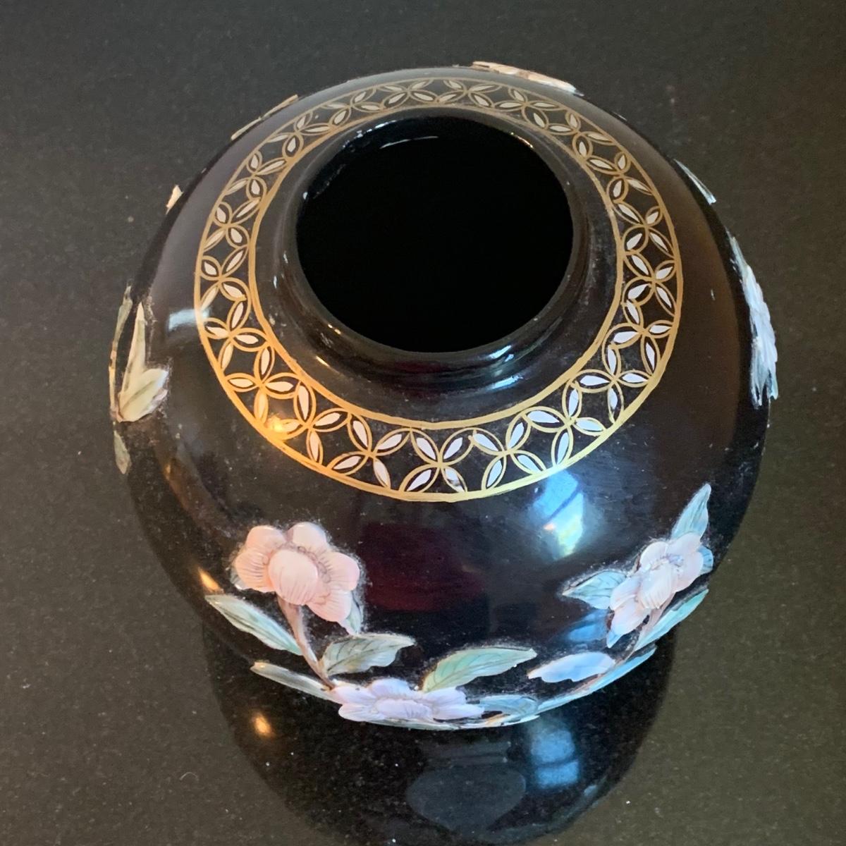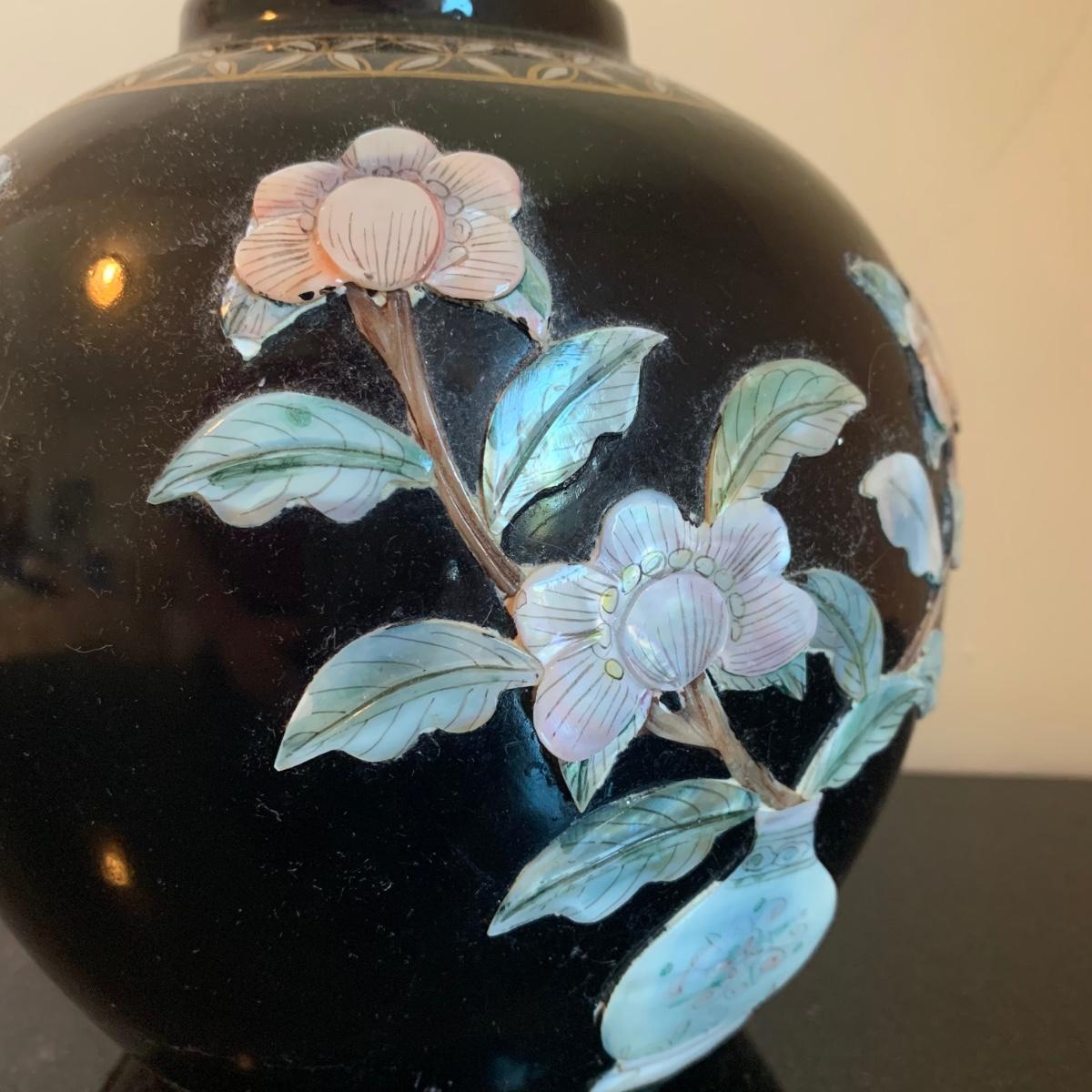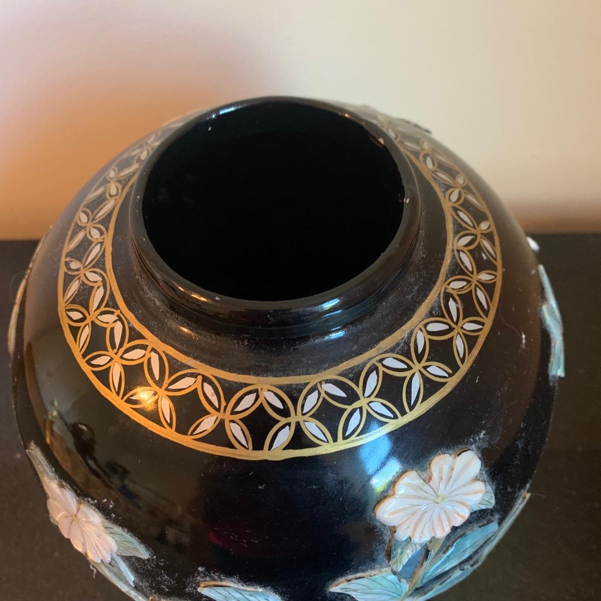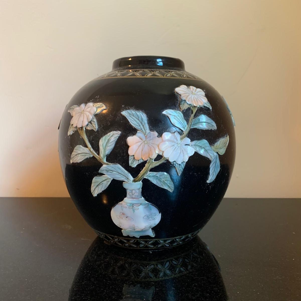 LOT 282: Vintage Pottery Vases with Mother of Pearl Floral Motif