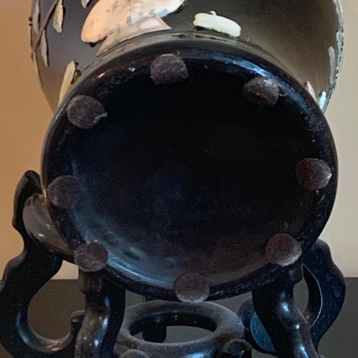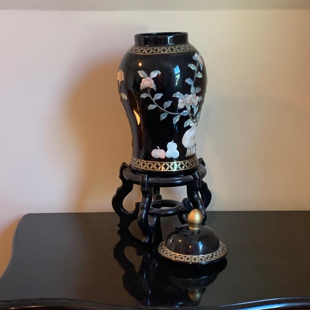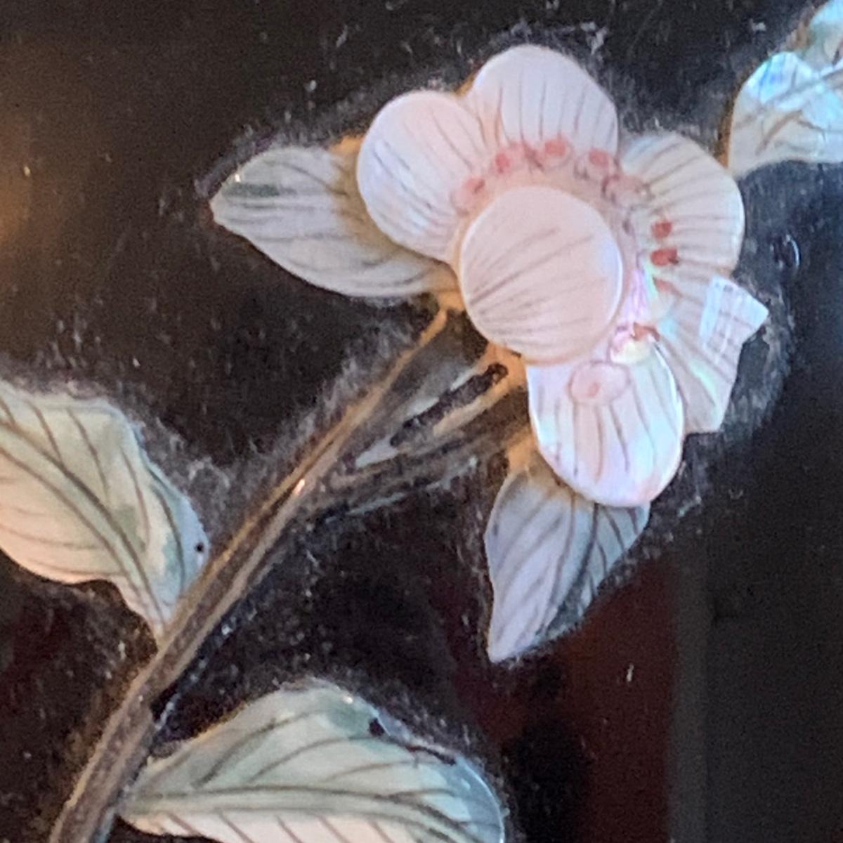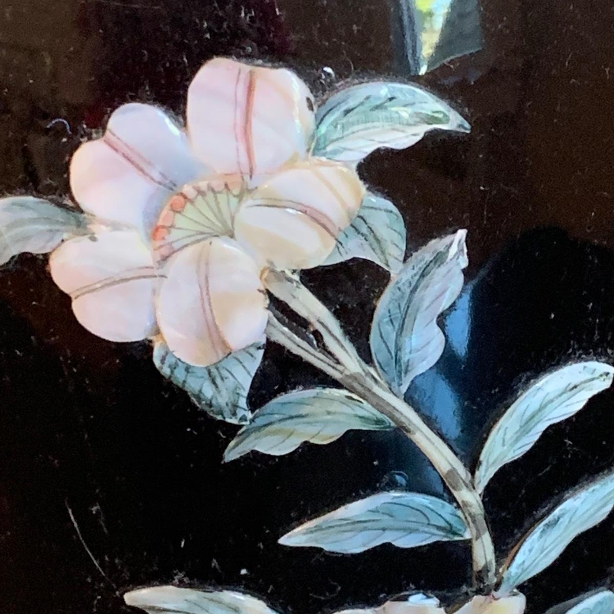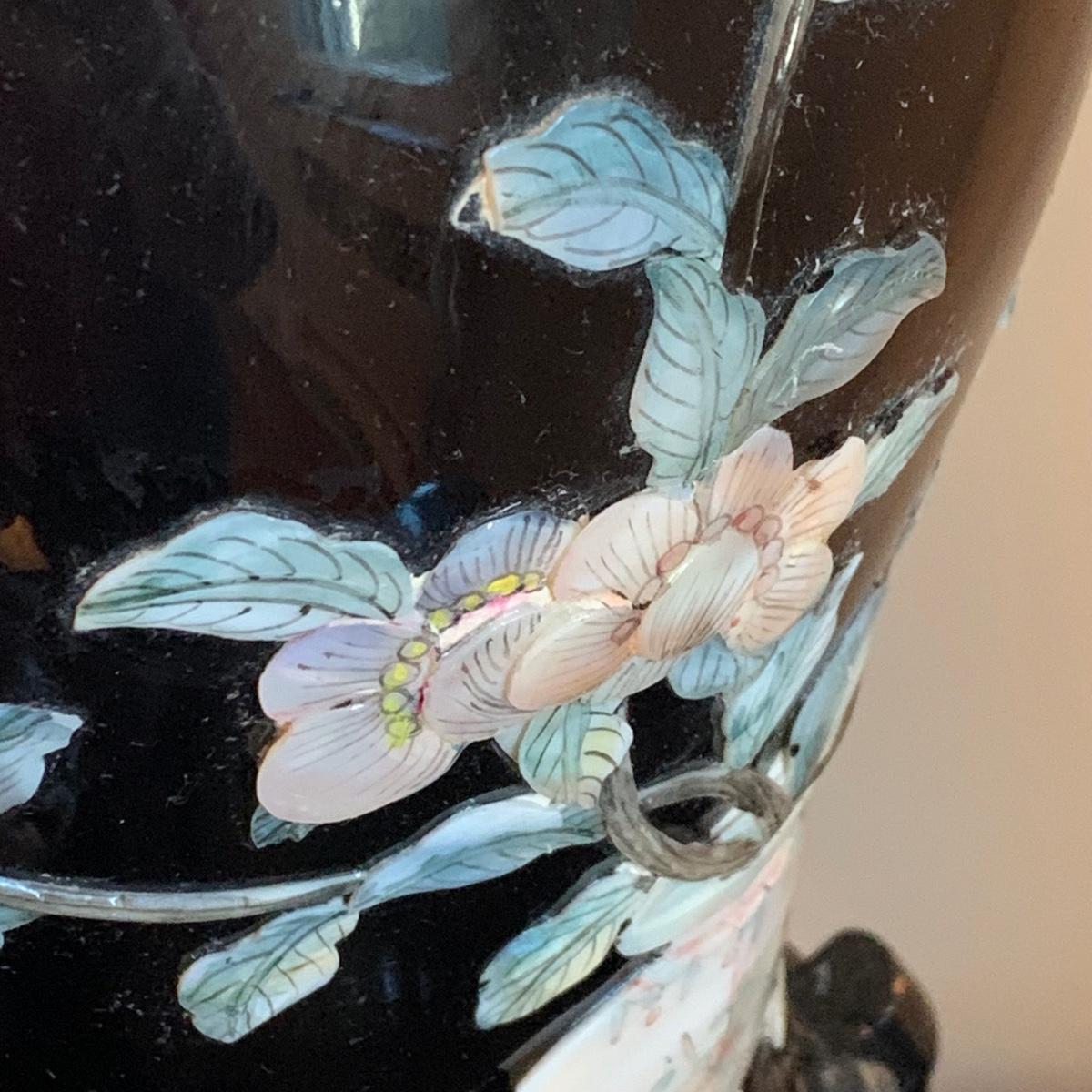 LOT 282: Vintage Pottery Vases with Mother of Pearl Floral Motif