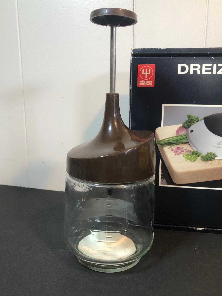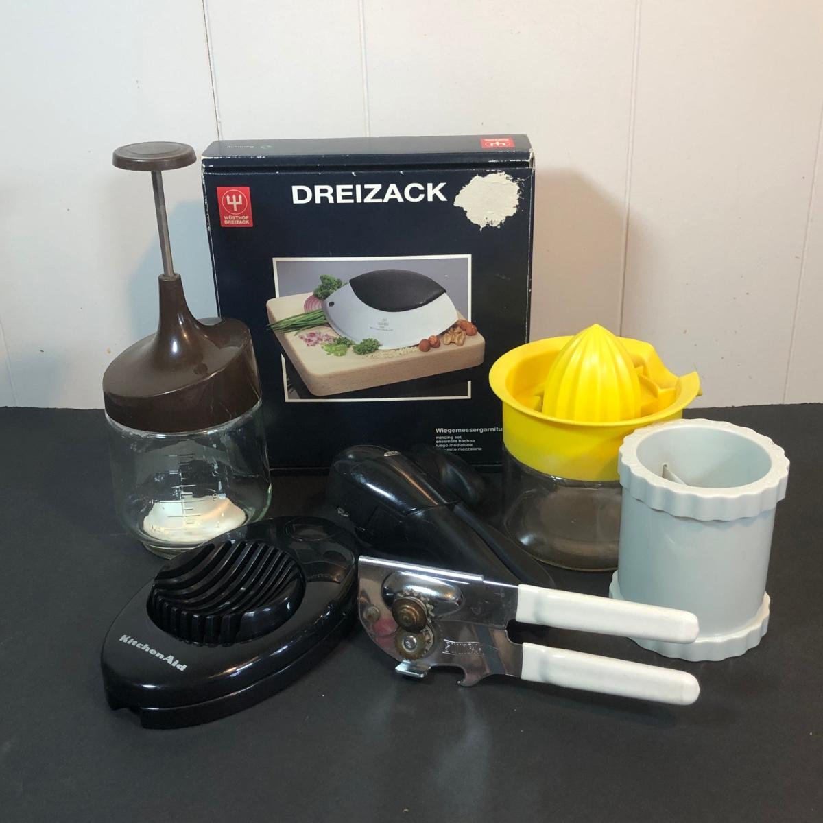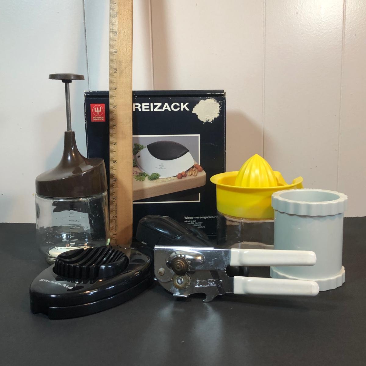 LOT 9K: Kitchen Gadgets - Wusthof Dreizack Mincing Set in Box, Kitchen Aid Egg Slicer, Juicer, Vintage Gemco Food Chopper & More