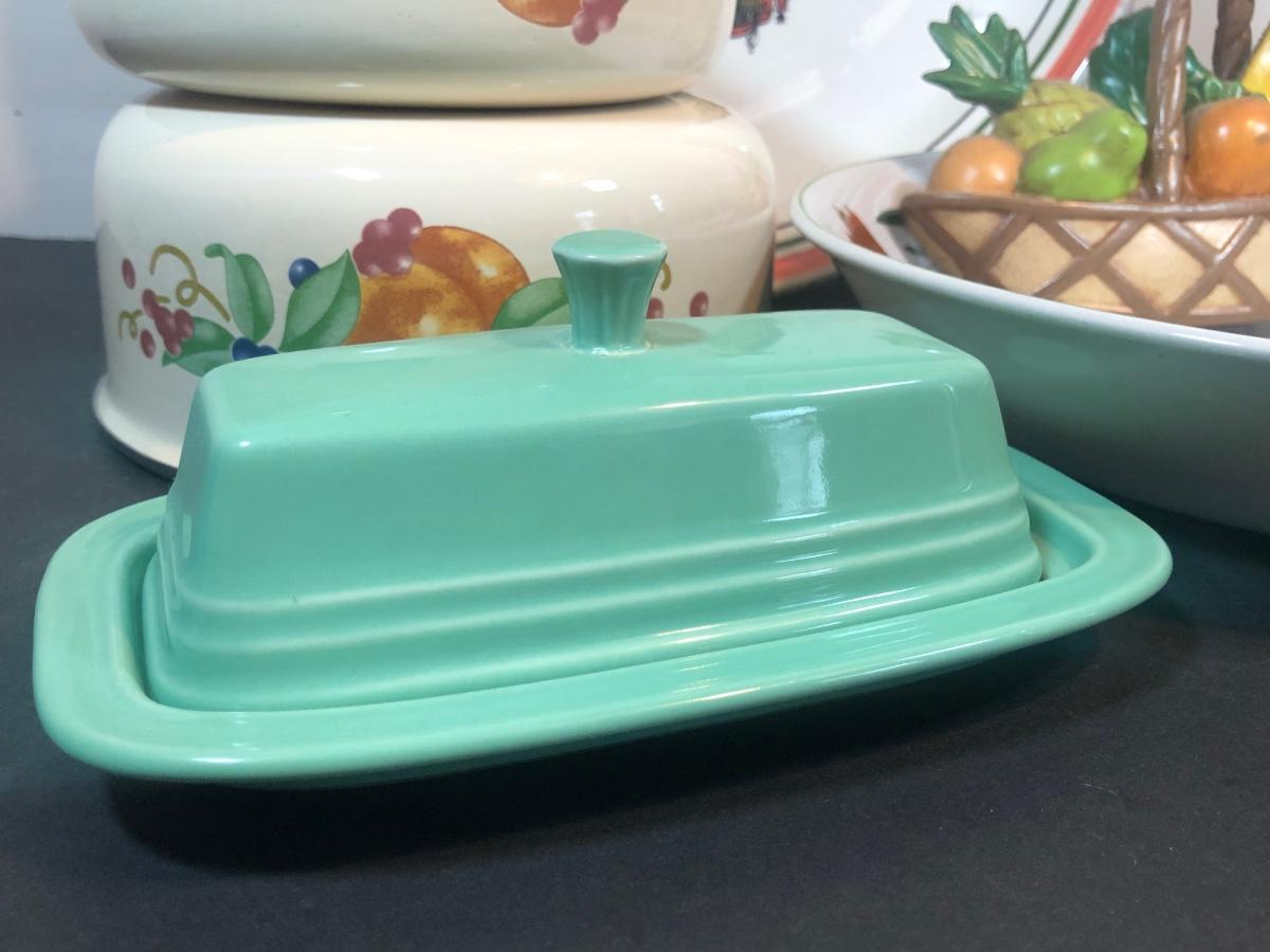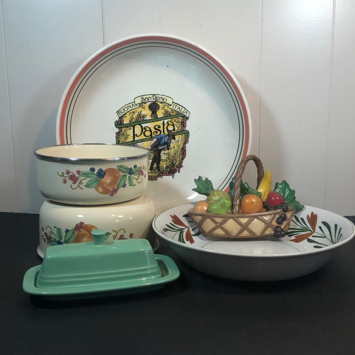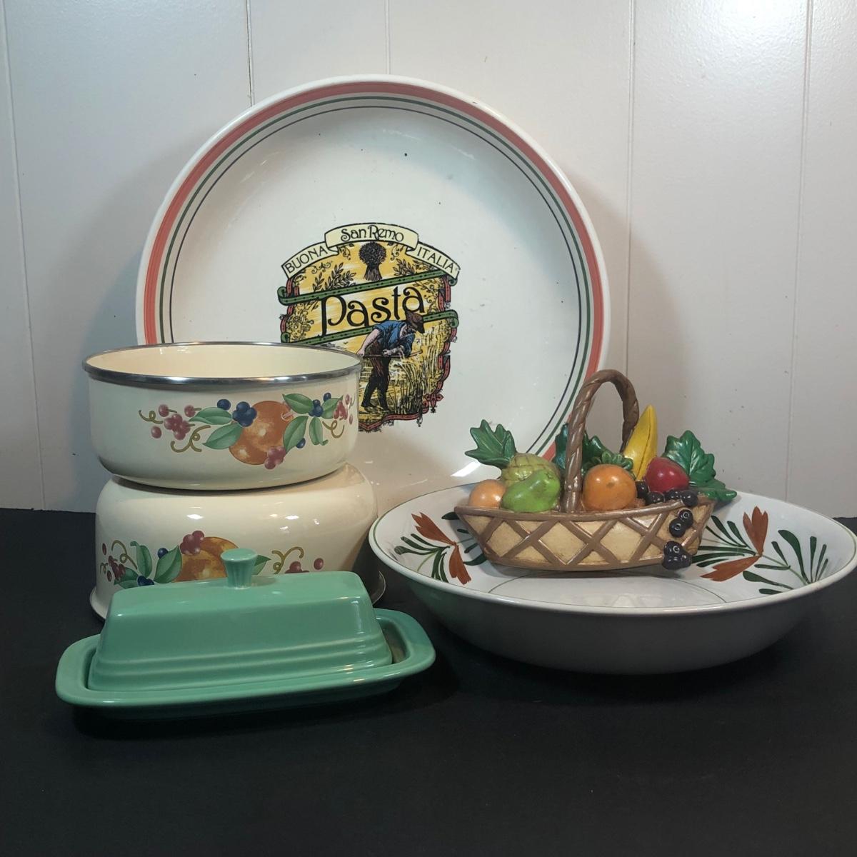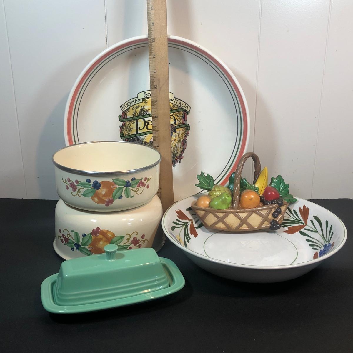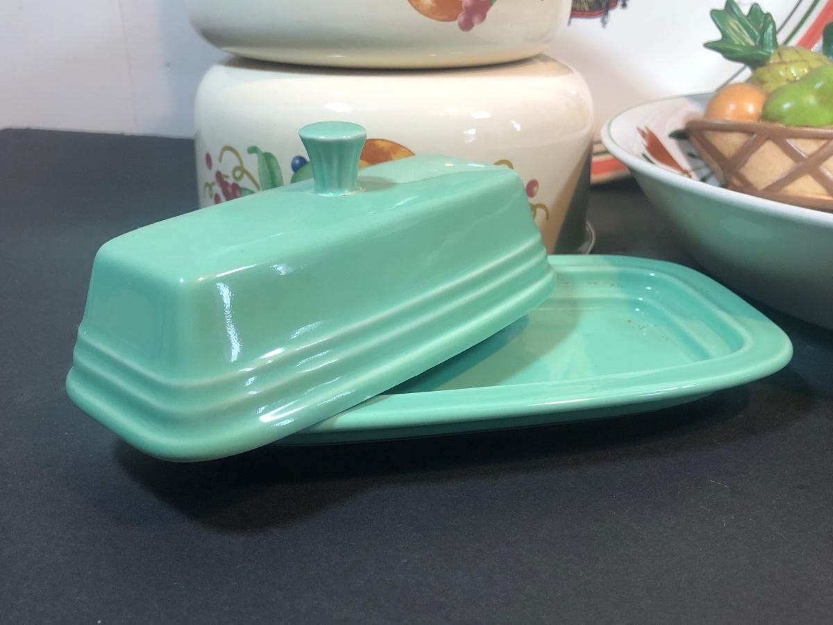 LOT 22K: Fiesta Butter Dish, Hand Painted Ide Bros Ideal Ironstone China Bowl, Corning Coordinates by Lincoware Abundance Enamel Pots & Himark Pasta Bowl