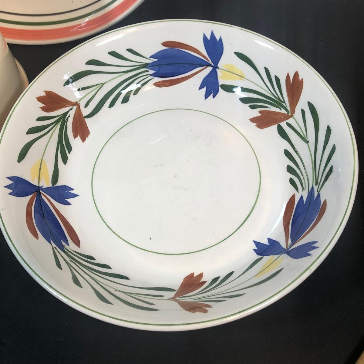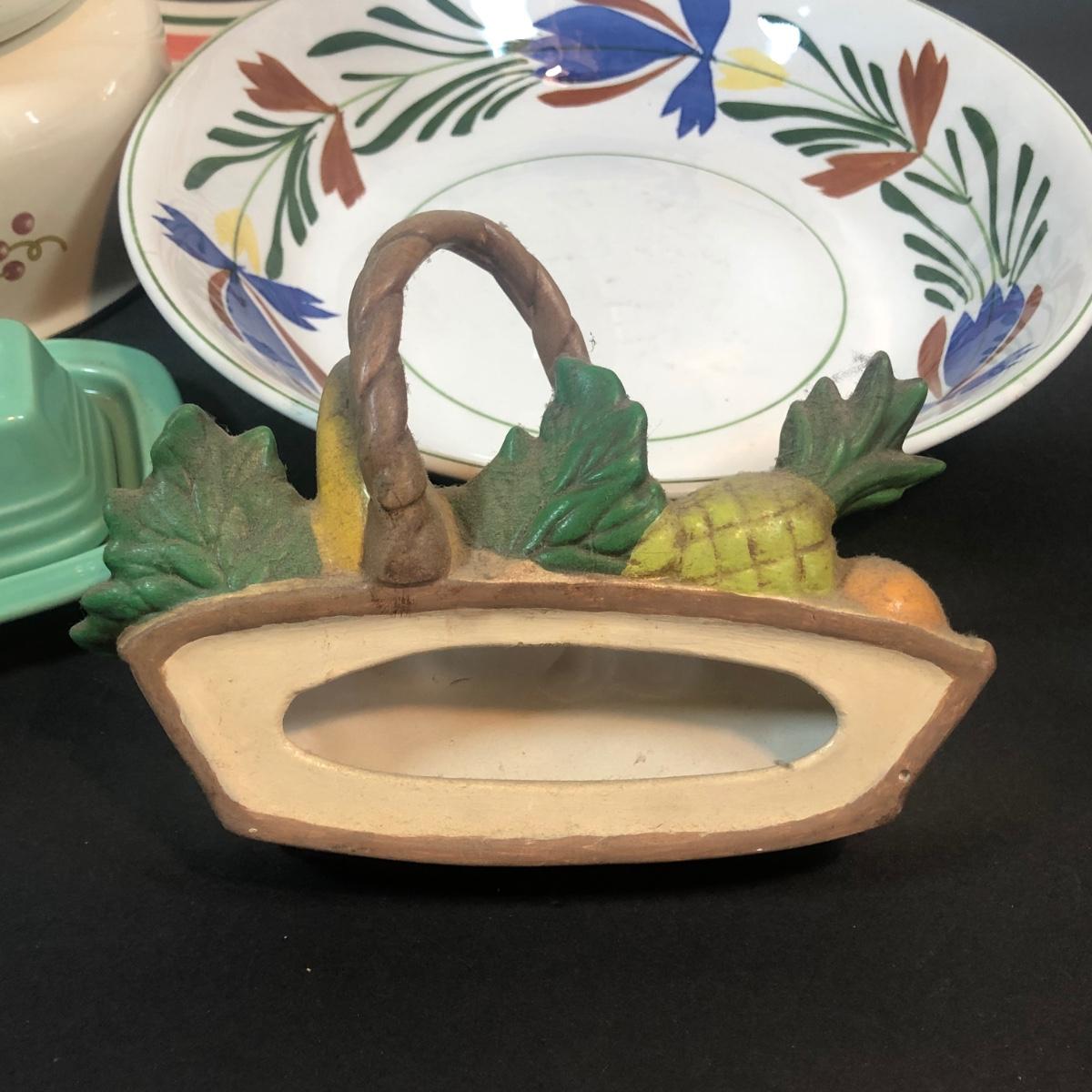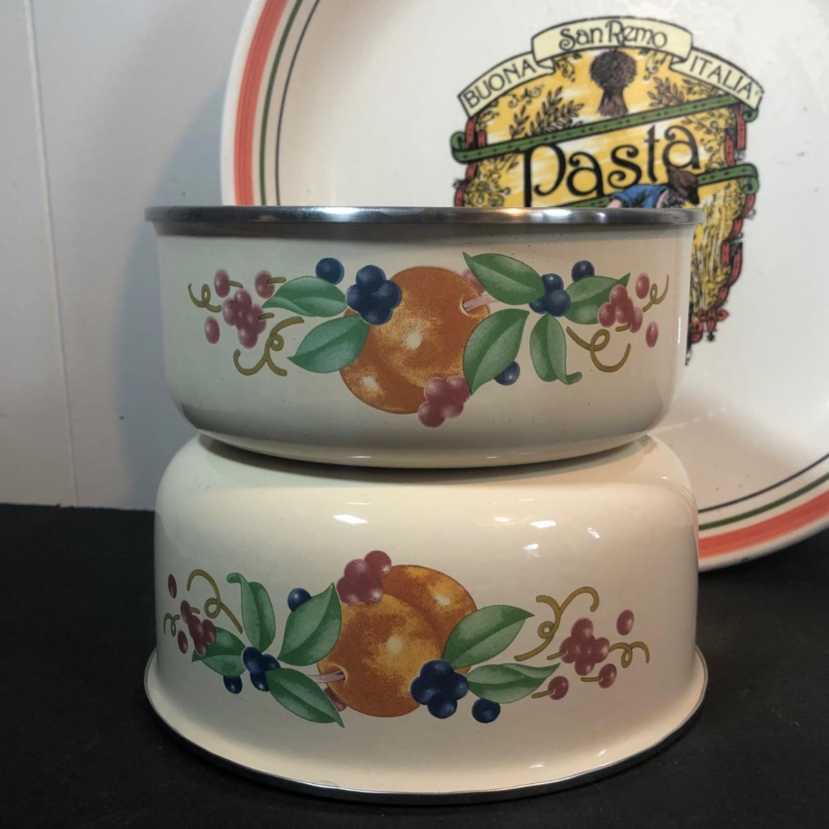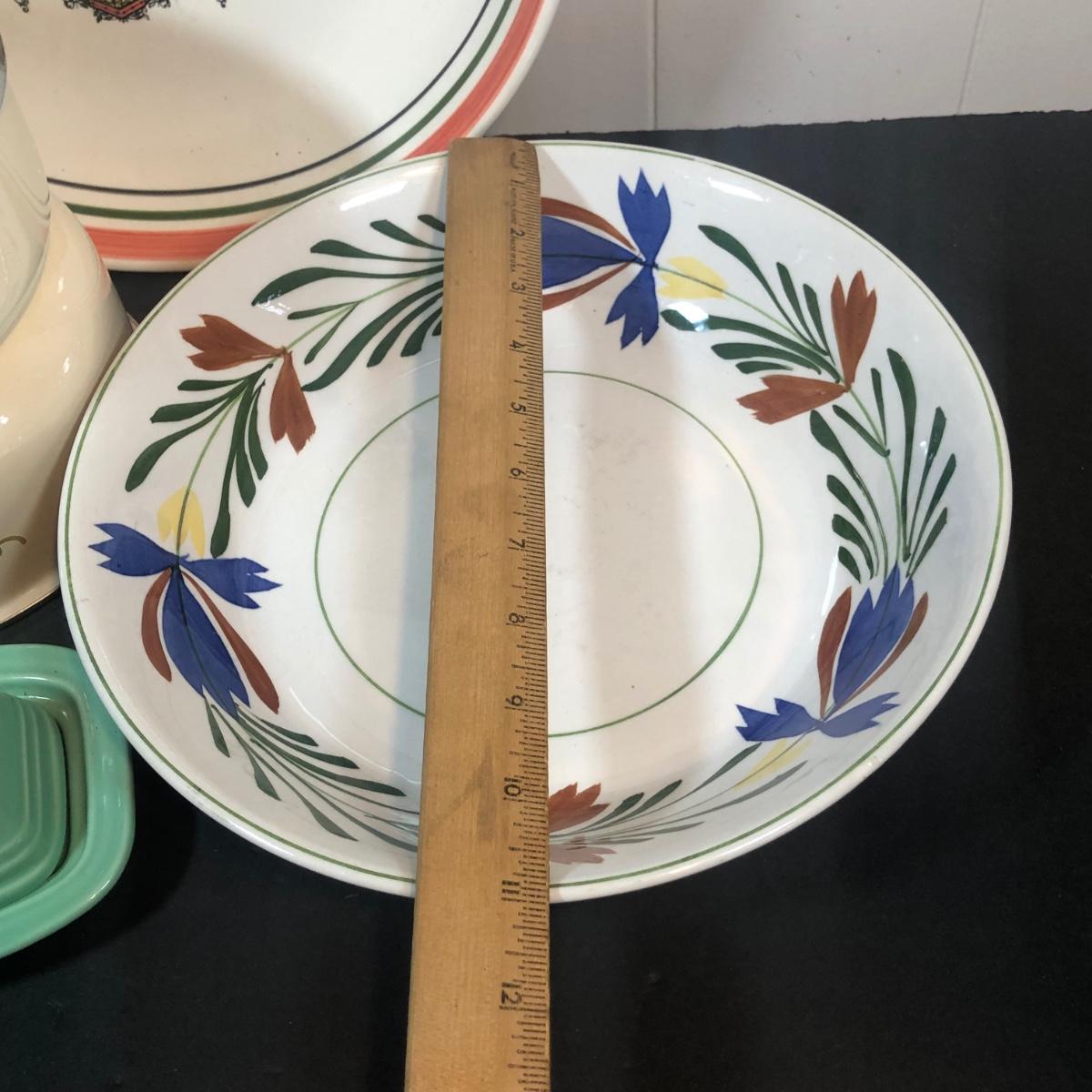 LOT 22K: Fiesta Butter Dish, Hand Painted Ide Bros Ideal Ironstone China Bowl, Corning Coordinates by Lincoware Abundance Enamel Pots & Himark Pasta Bowl