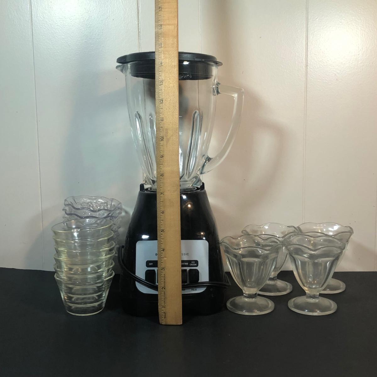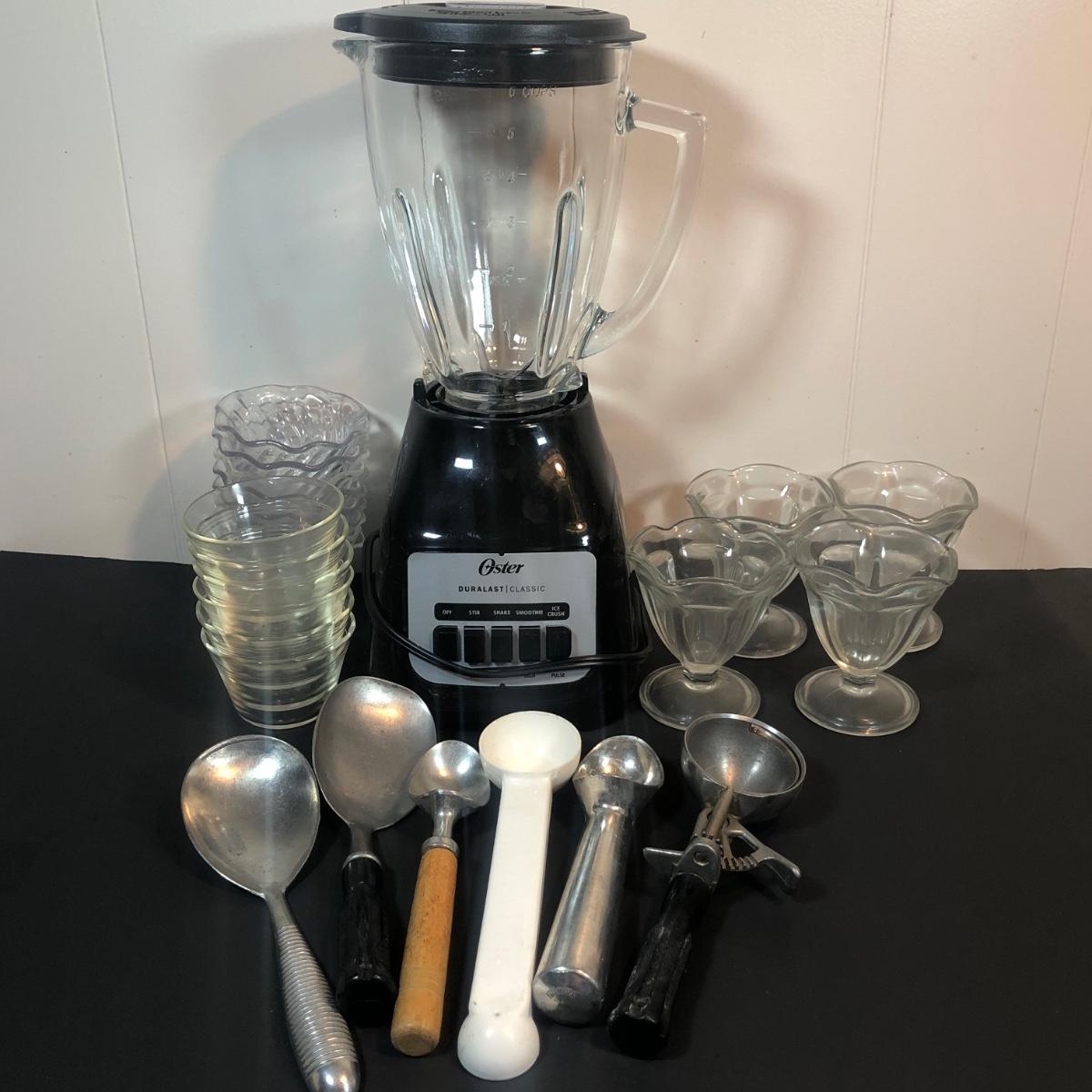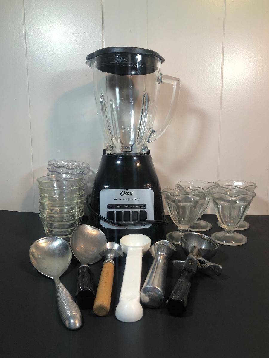 LOT 28K: Oster Duralast Classic Blender w/ Ice Cream Scoops, Sundae Cups & Pyrex Custard Dishes