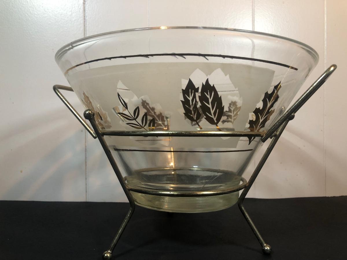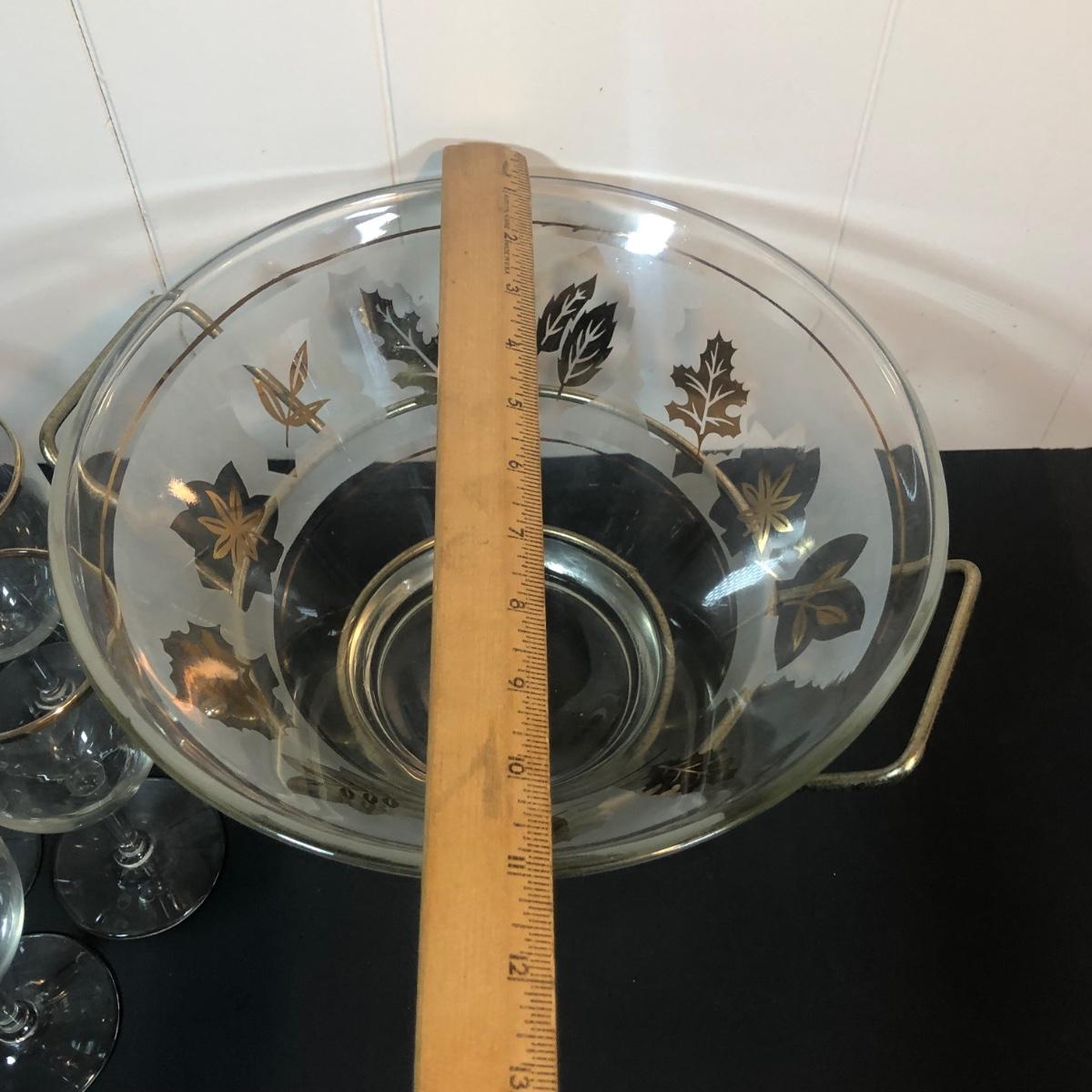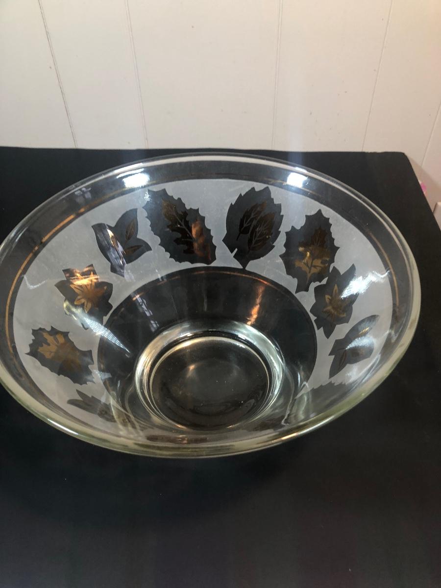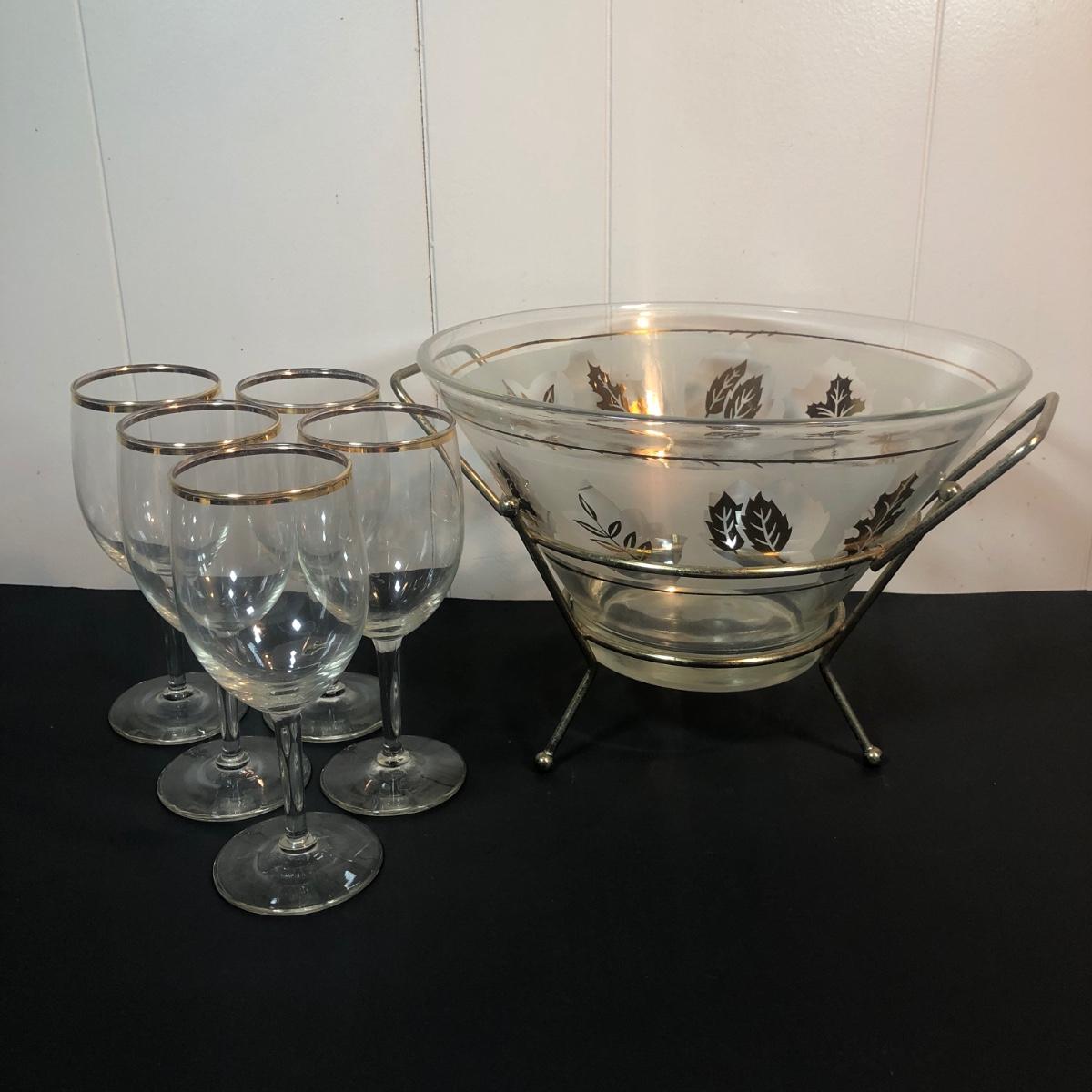 LOT 29K: Vintage Libbey Gold Leaf Frosted Glass Serving Bowl & Gold Rim Stemmed Glasses