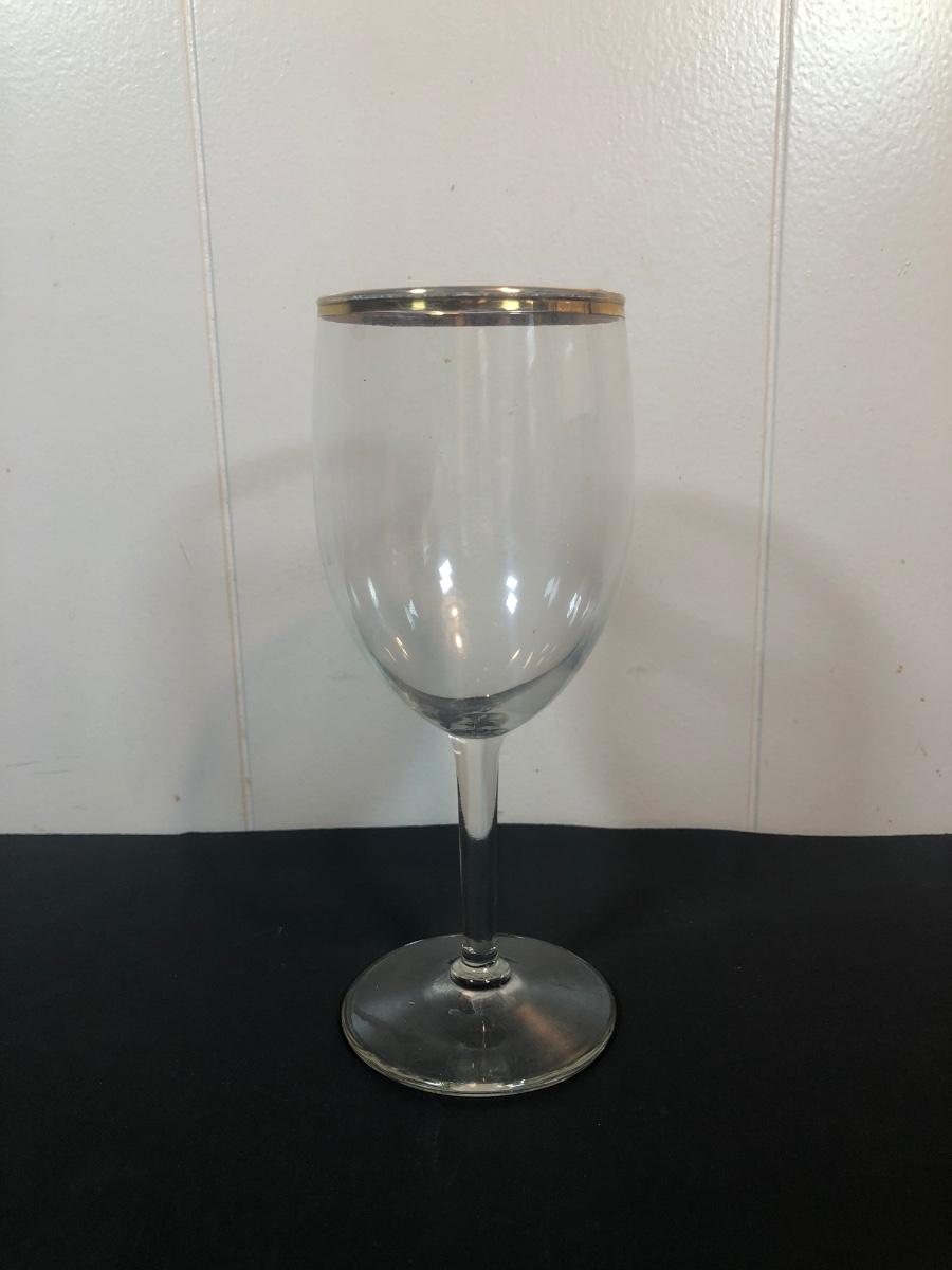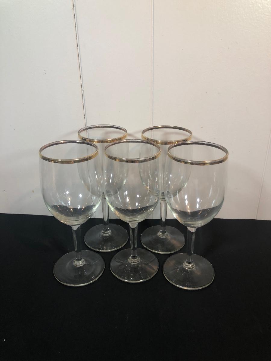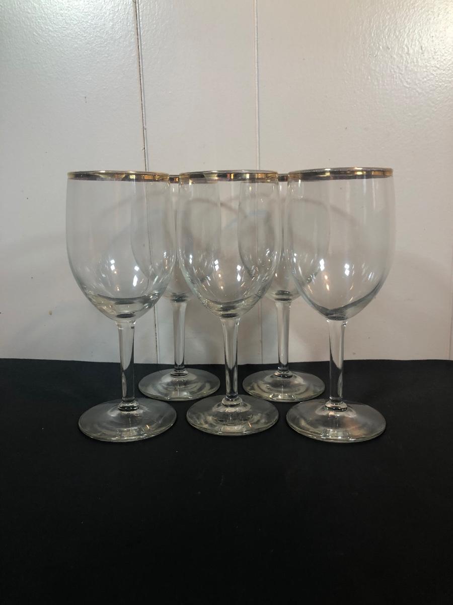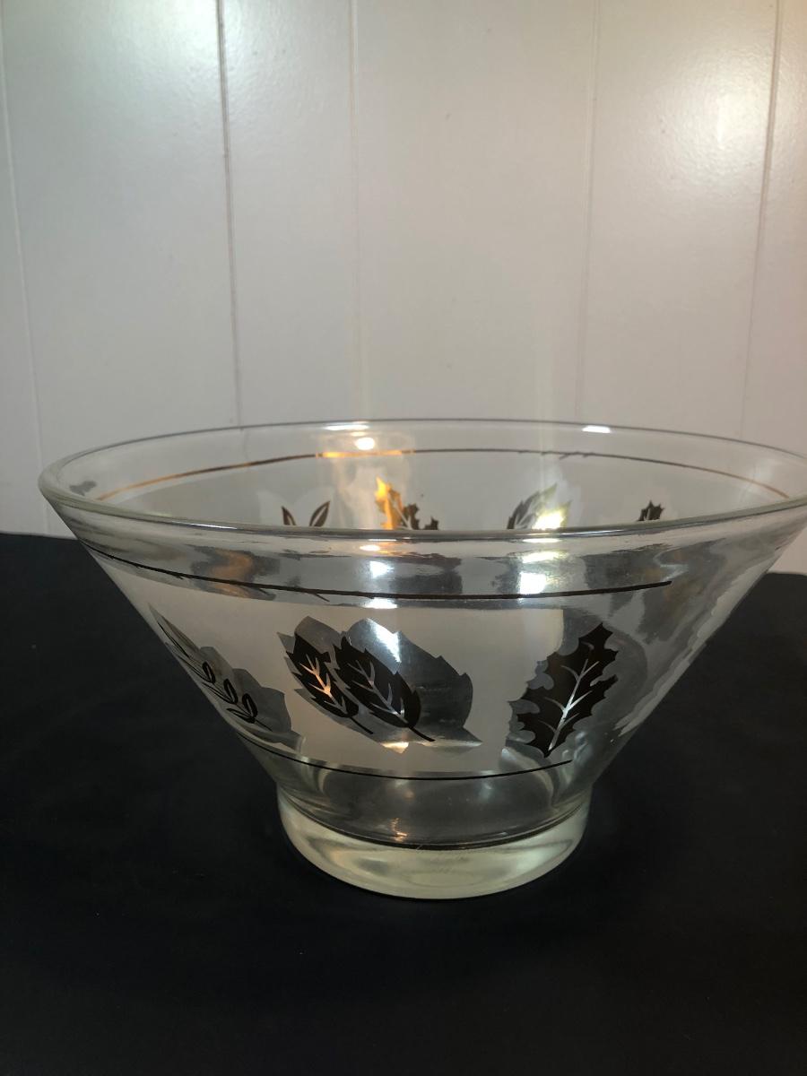 LOT 29K: Vintage Libbey Gold Leaf Frosted Glass Serving Bowl & Gold Rim Stemmed Glasses
