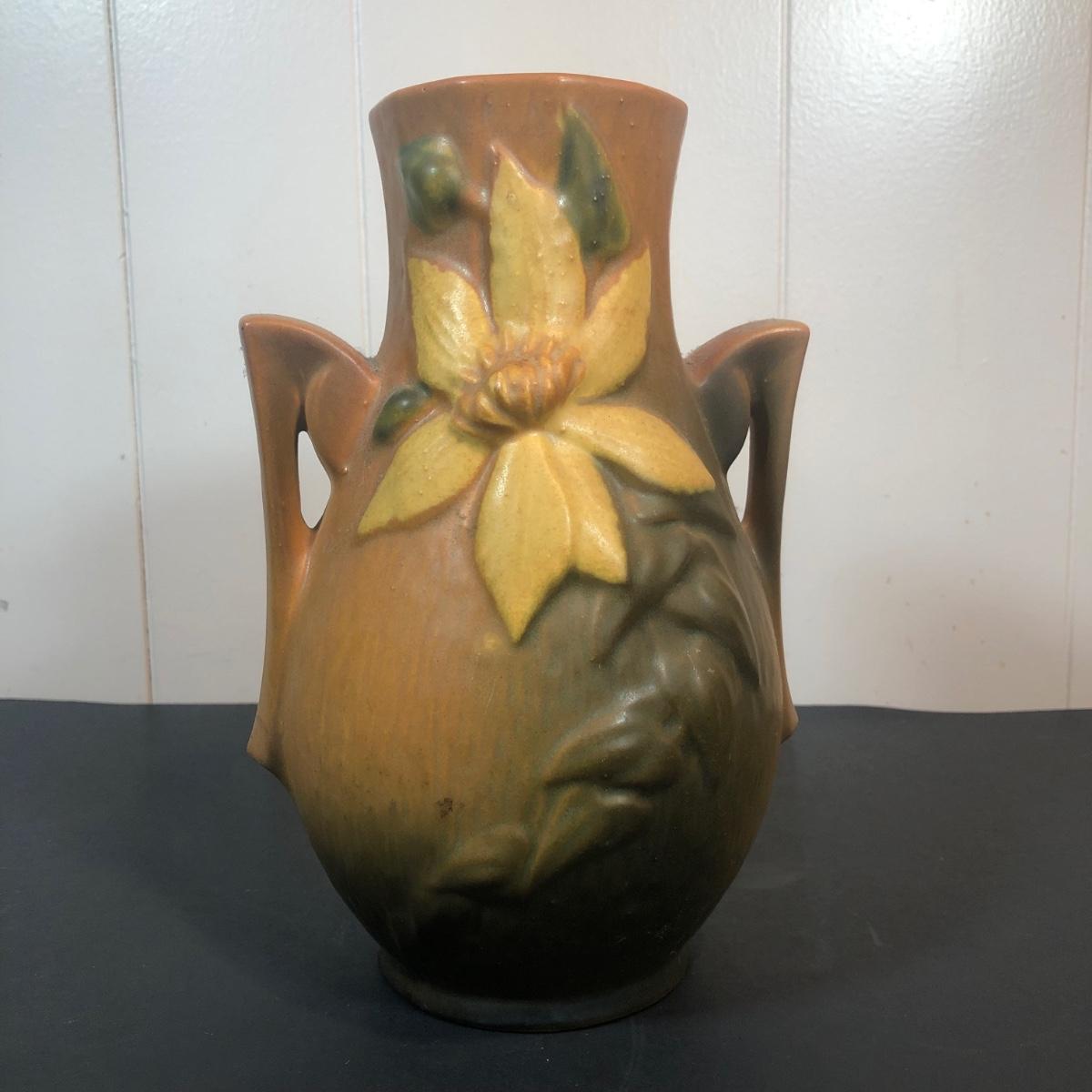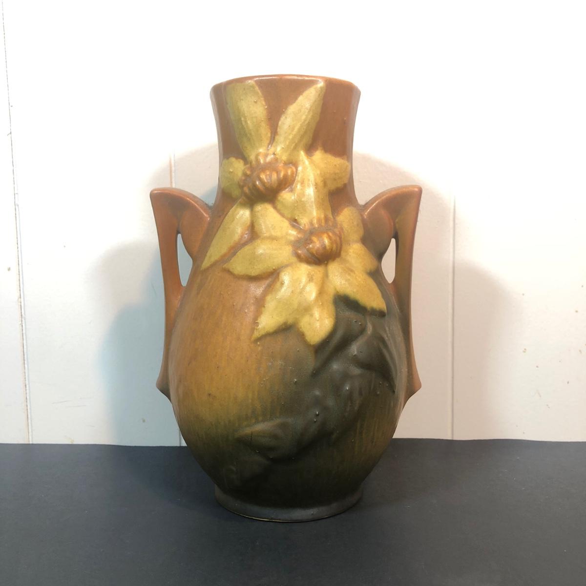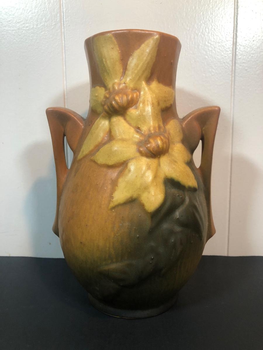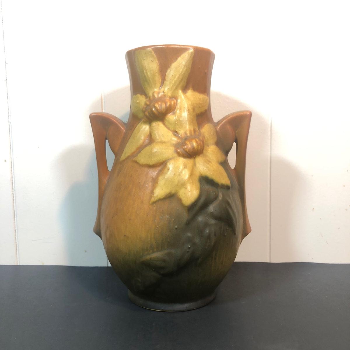 LOT 31L: Vintage 1940s Roseville USA Art Pottery Clematis Pattern Brown Double Handle Vase (108-8")