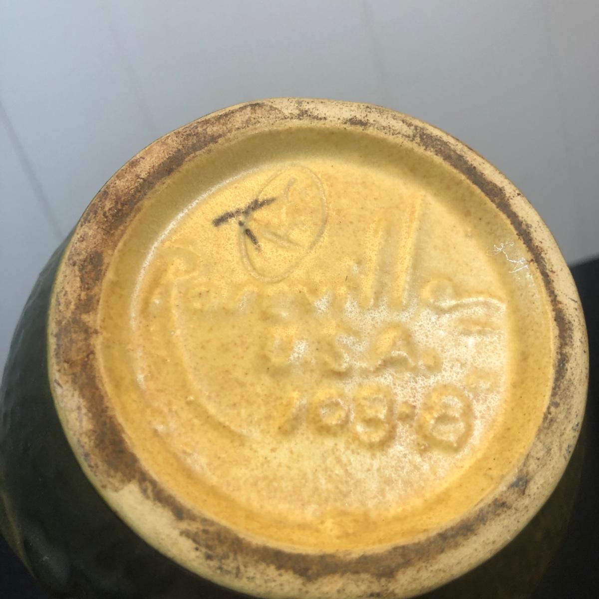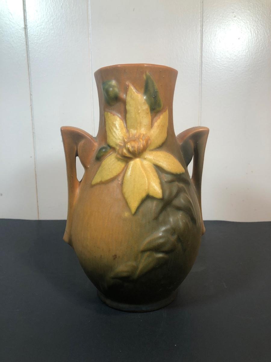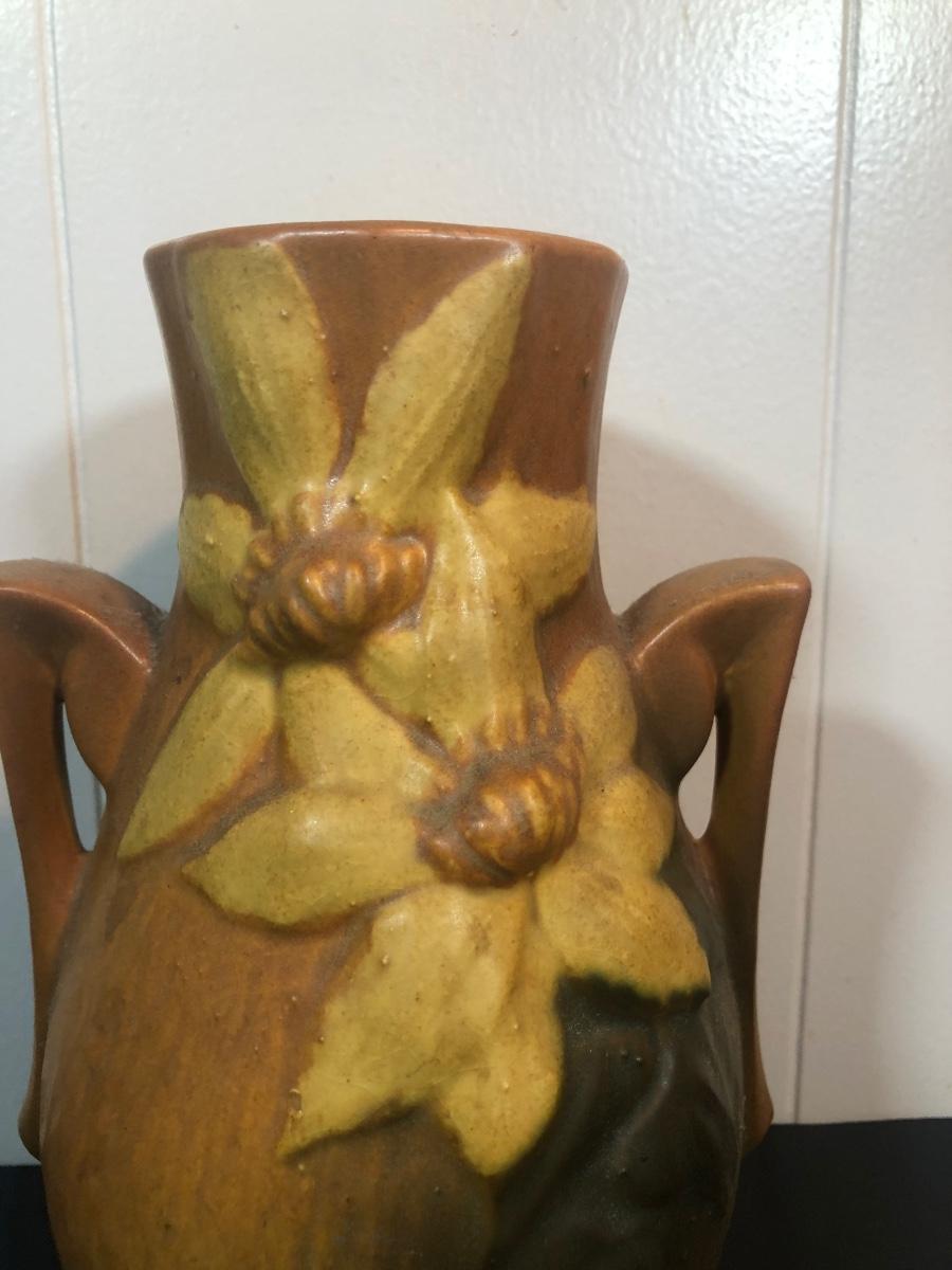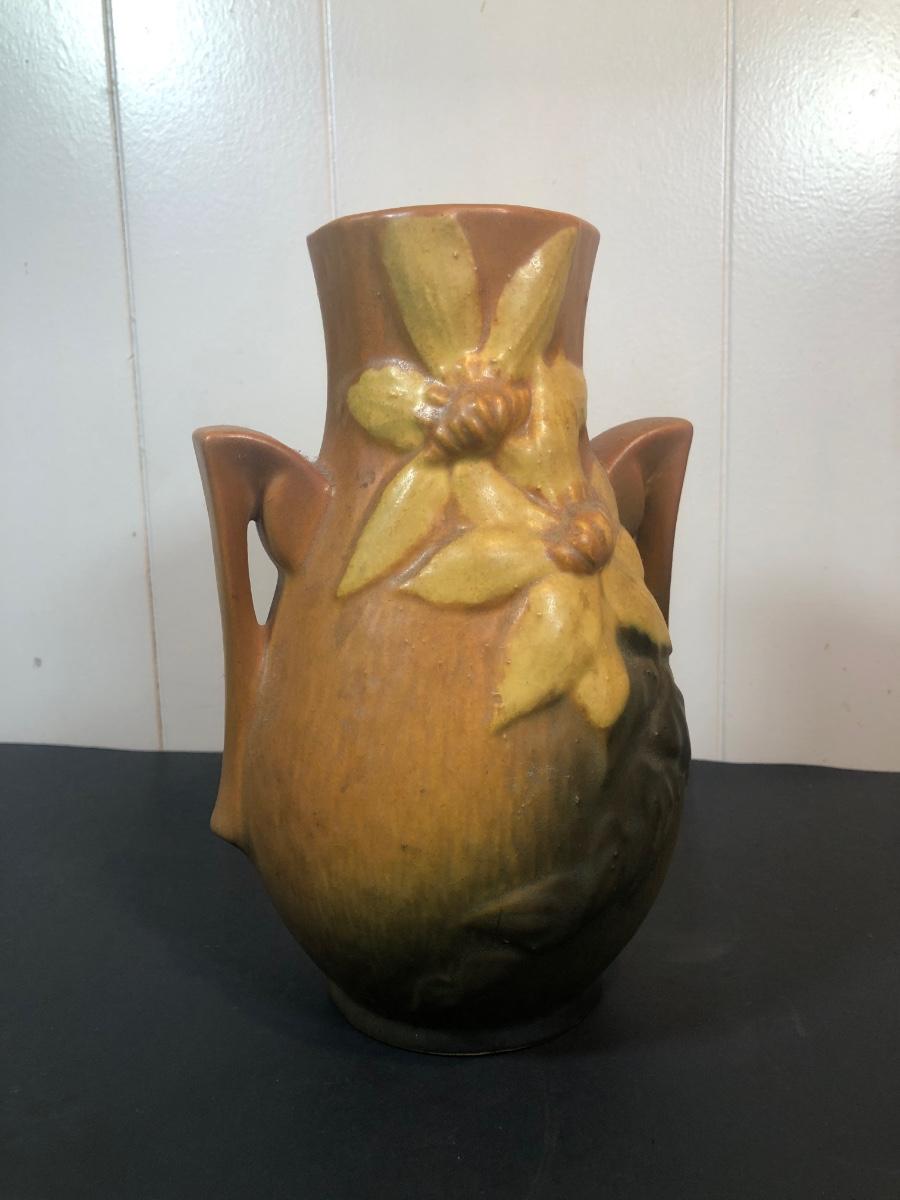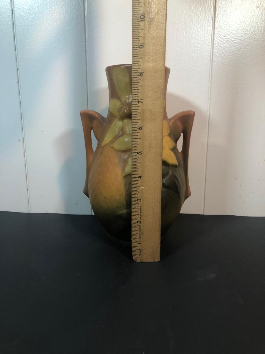 LOT 31L: Vintage 1940s Roseville USA Art Pottery Clematis Pattern Brown Double Handle Vase (108-8")