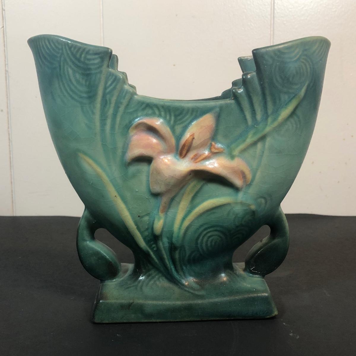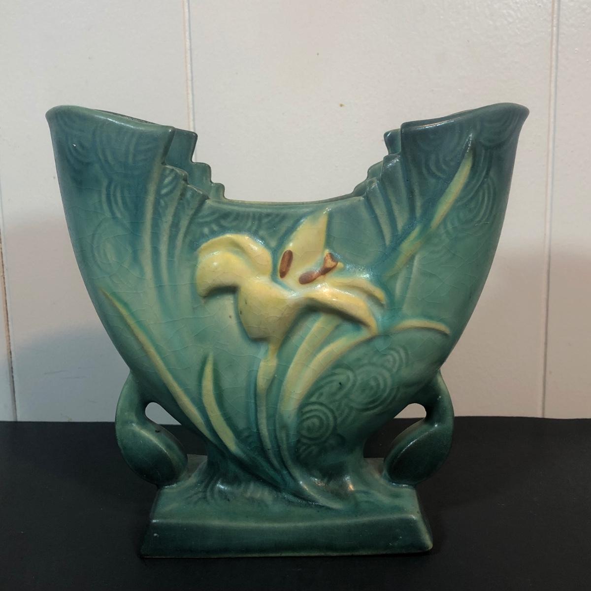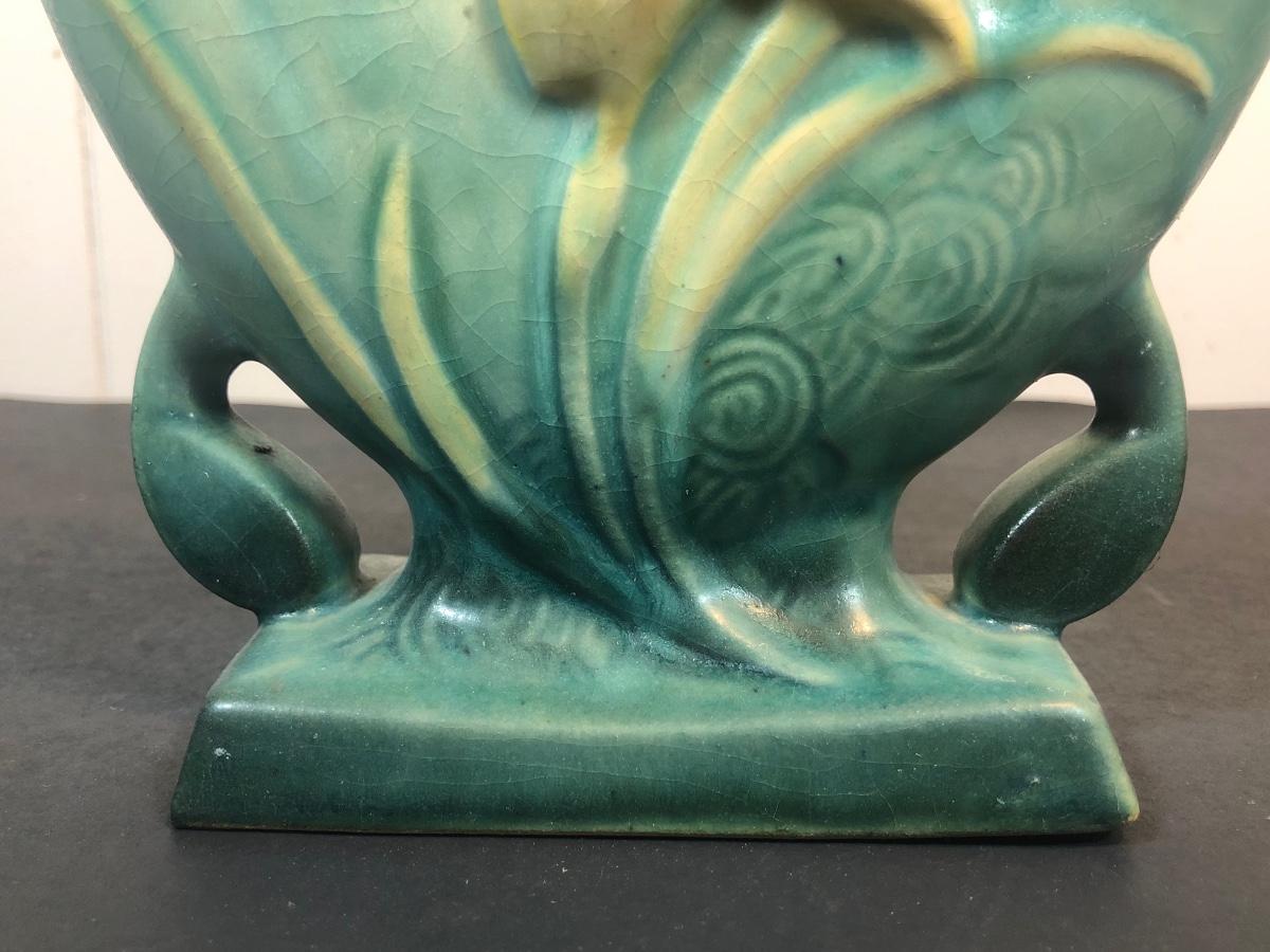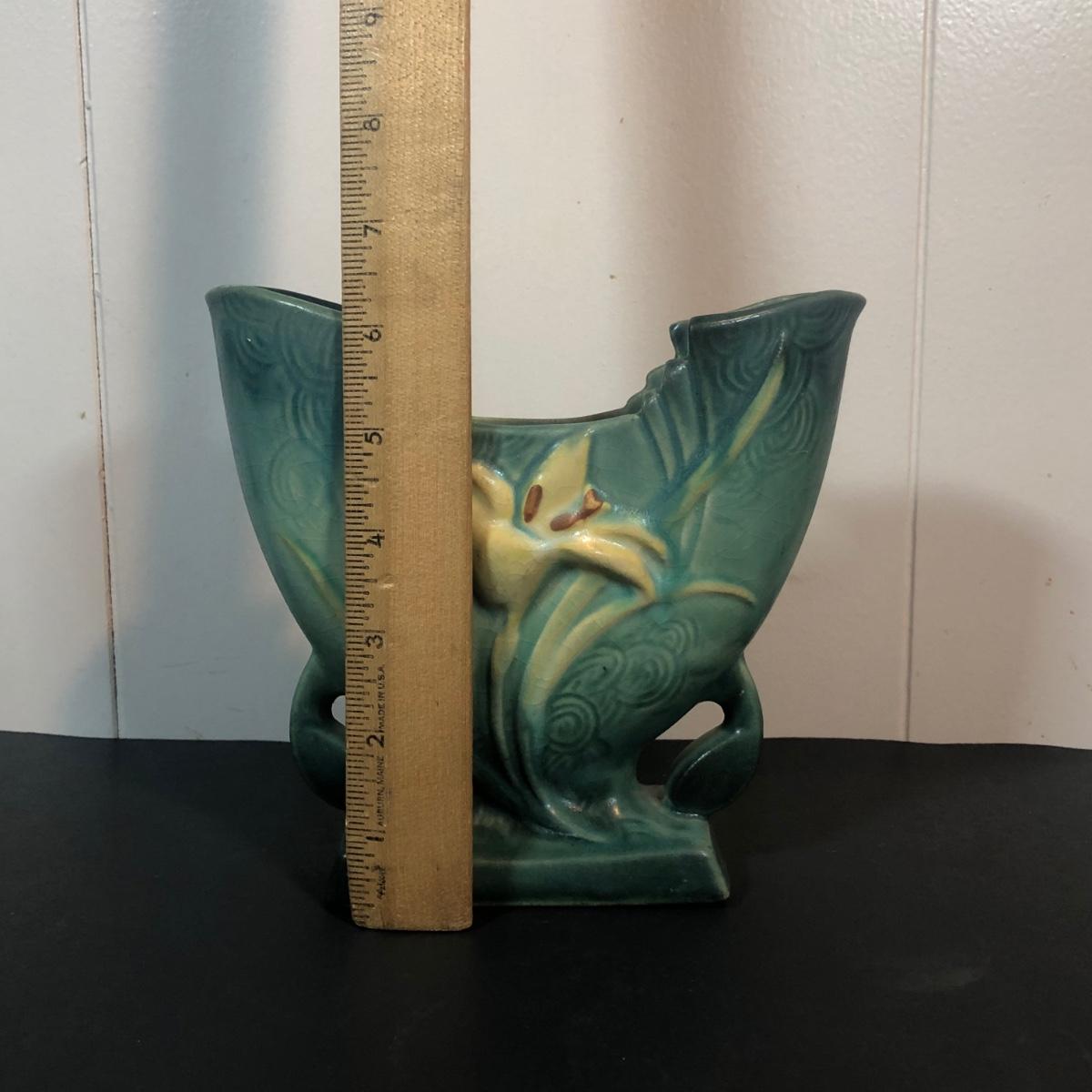 LOT 32L: Vintage Roseville USA Art Pottery Zephyr Lily Blue Fan Vase (205-6")