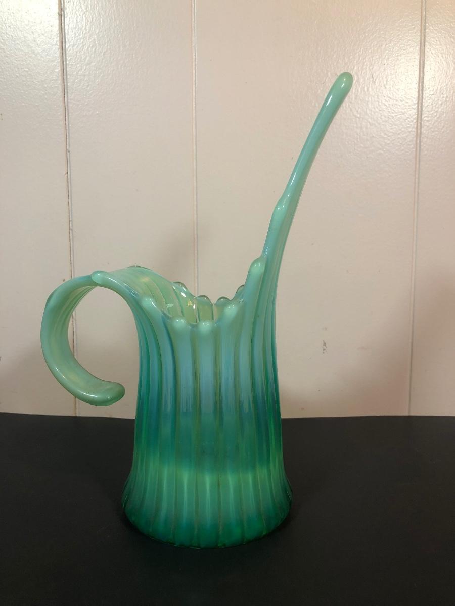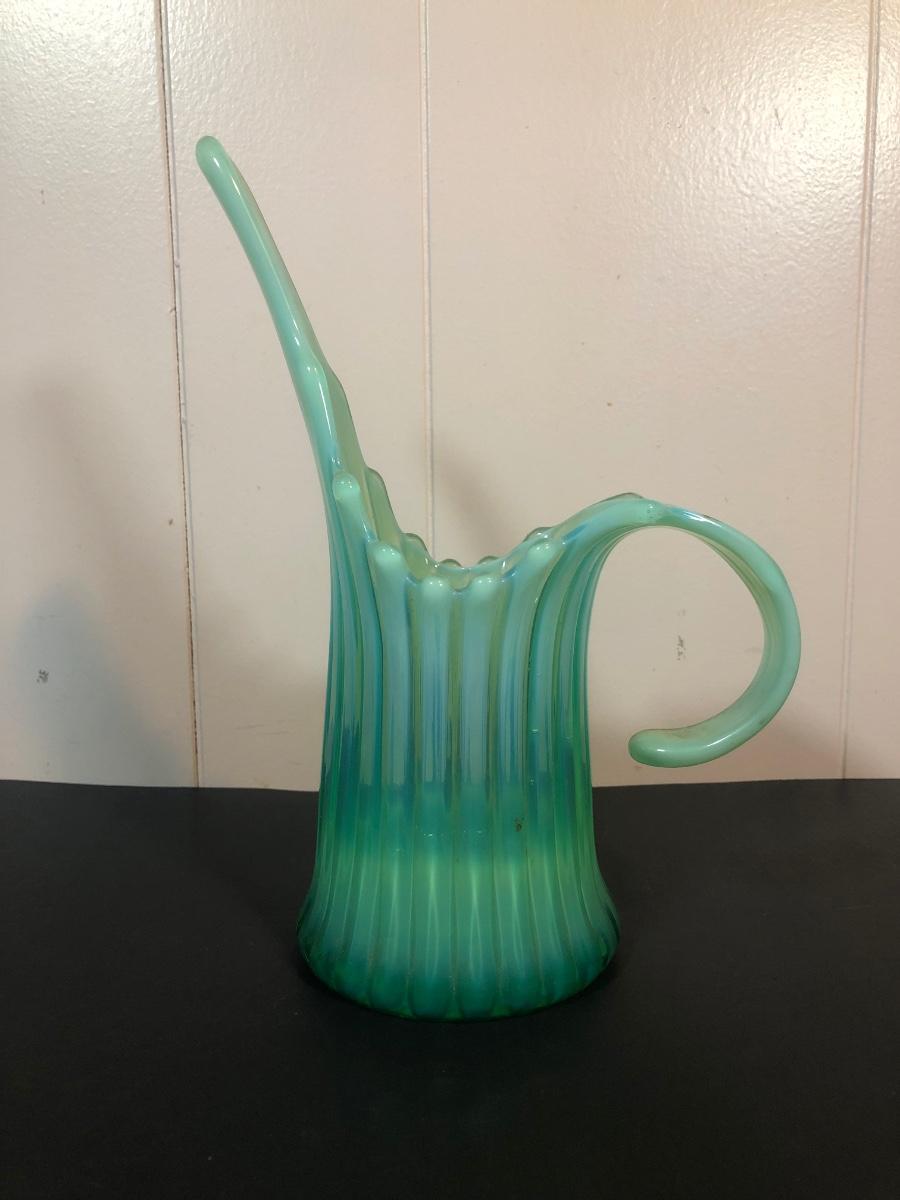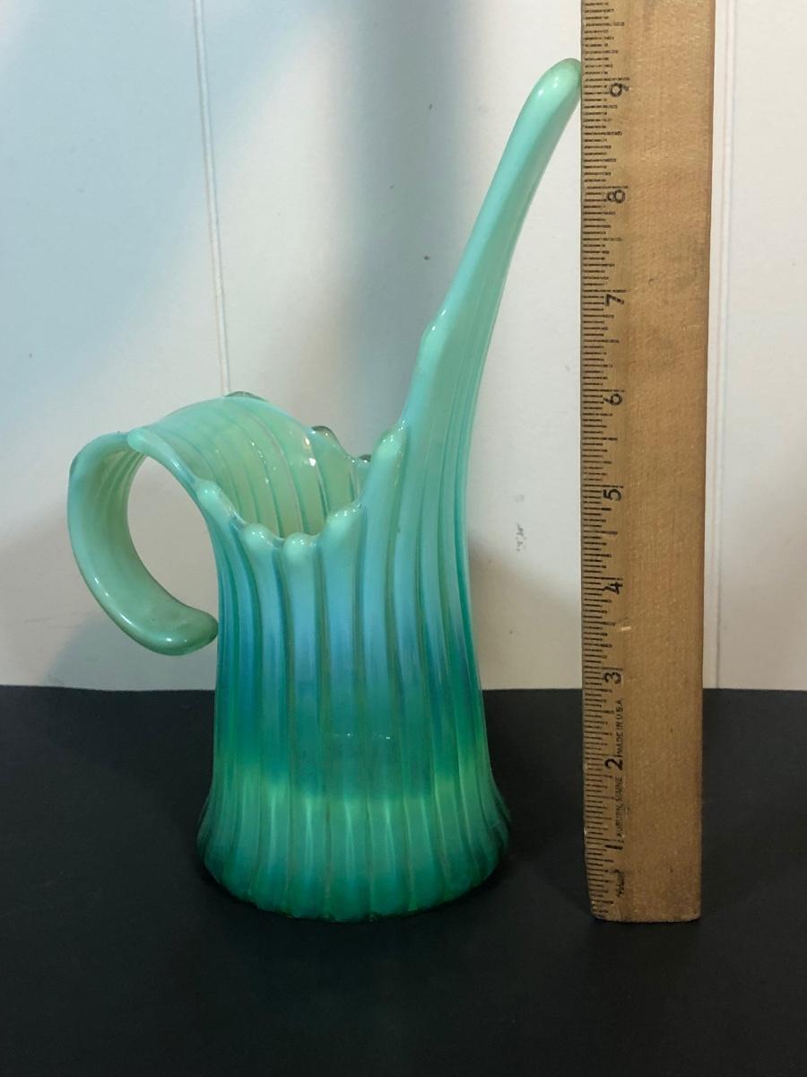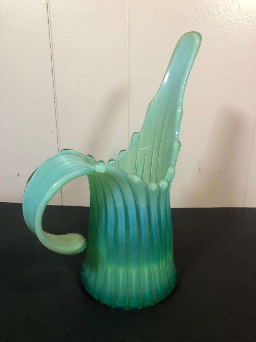 LOT 37L: Vintage / Mid-Century Modern Fostoria Heirloop Opalescent Green/Blue Art Glass Swung Vase Pitcher