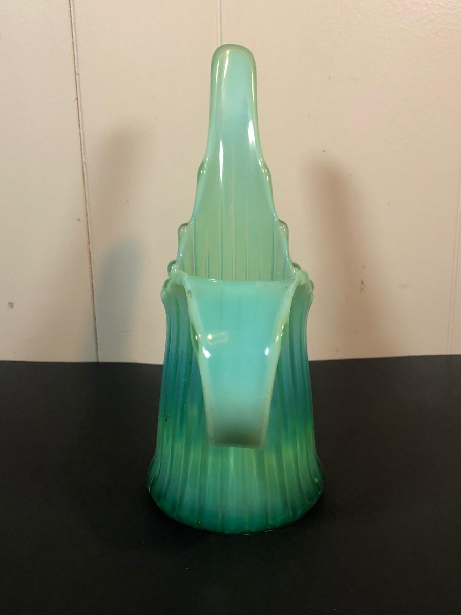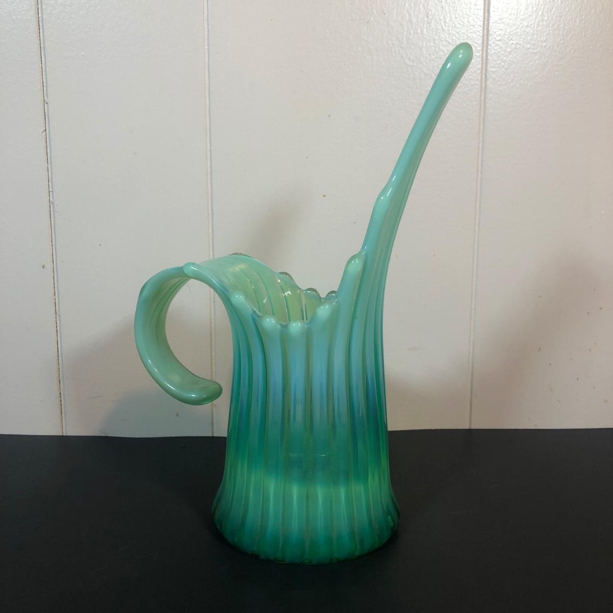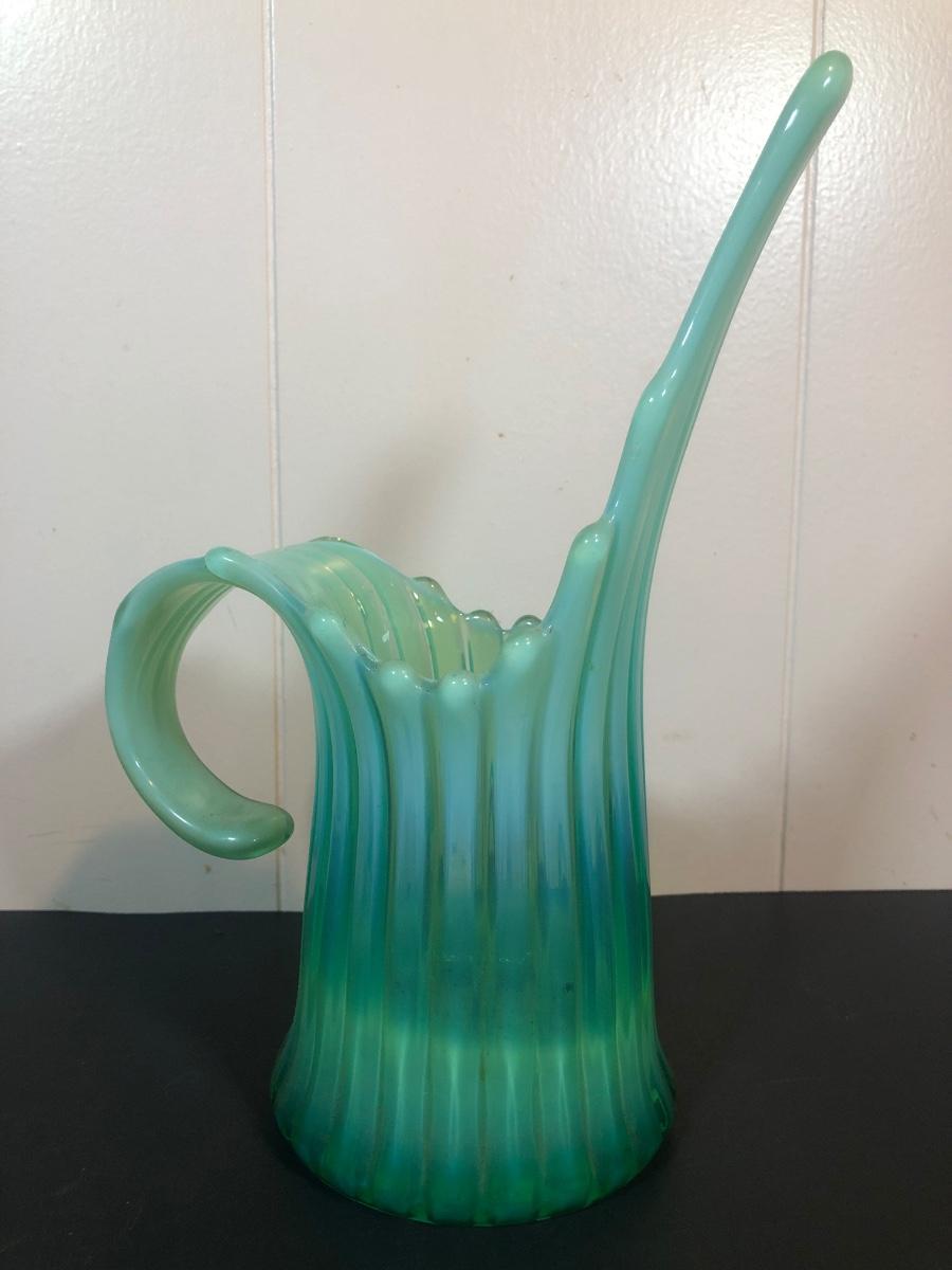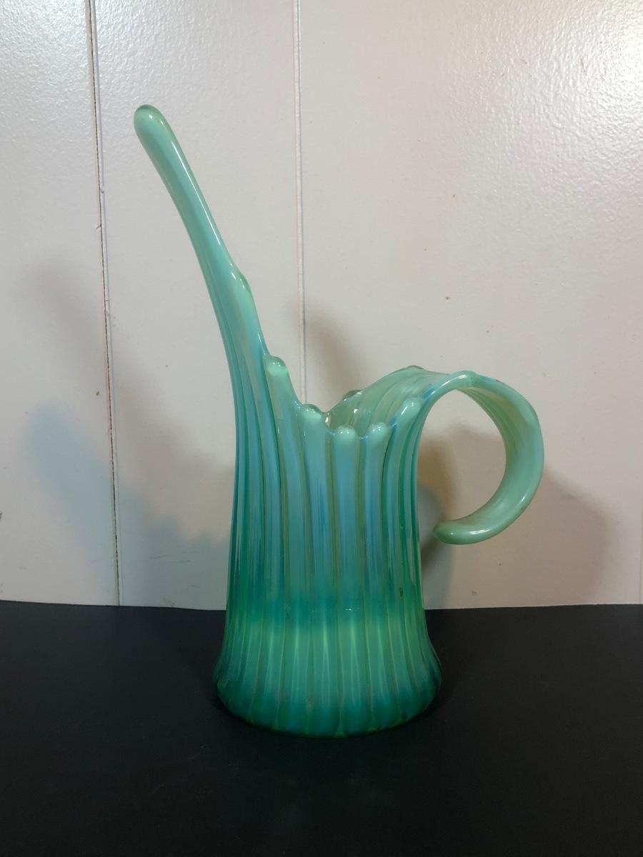 LOT 37L: Vintage / Mid-Century Modern Fostoria Heirloop Opalescent Green/Blue Art Glass Swung Vase Pitcher