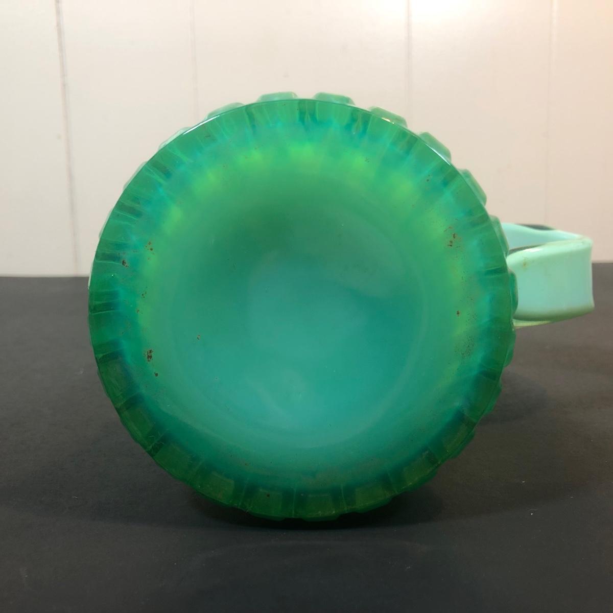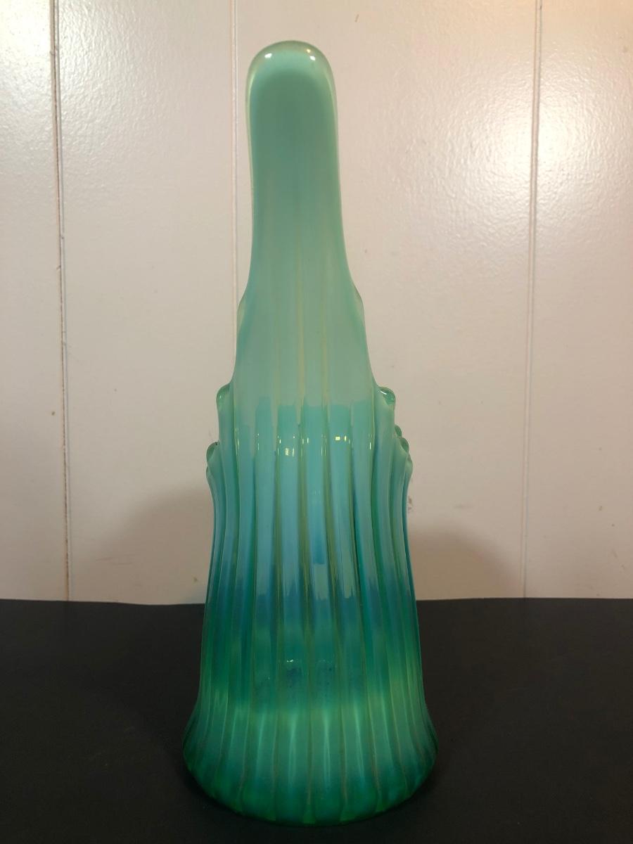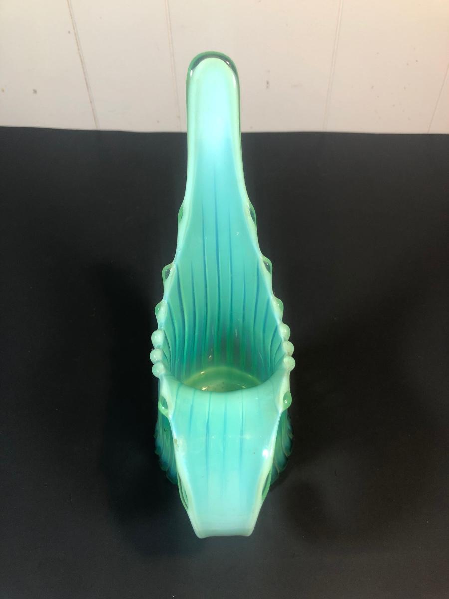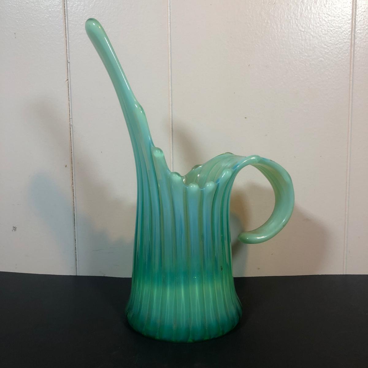 LOT 37L: Vintage / Mid-Century Modern Fostoria Heirloop Opalescent Green/Blue Art Glass Swung Vase Pitcher